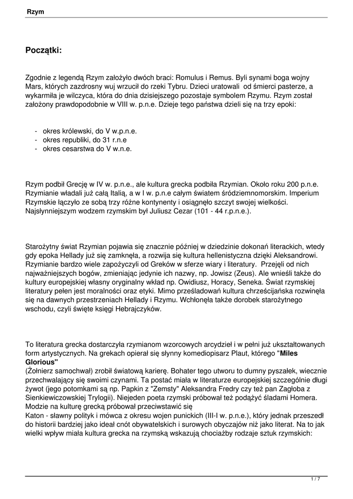 Rzym Początki: Zgodnie z legendą Rzym założyło dwóch braci: Romulus i Remus. Byli synami boga wojny Mars, których zazdrosny wuj wrzucił do rzeki Tybru. Dzieci uratowali od śmierci pasterze, a wykarmiła je wilczyca, która do dnia dzisiejszego pozostaje symbolem Rzymu. Rzym został założony prawdopodobnie w VIII w. p.n.e. Dzieje tego państwa dzieli się na trzy epoki: - okres królewski, do V w.p.n.e. - okres republiki, do 31 r.n.e - okres cesarstwa do V w.n.e. Rzym podbił Grecję w IV w. p.n.e., ale kultura grecka podbiła Rzymian. Około roku 200 p.n.e. Rzymianie władali już całą Italią, a w I w. p.n.e całym światem śródziemnomorskim. Imperium Rzymskie łączyło ze sobą trzy różne kontynenty i osiągnęło szczyt swojej wielkości. Najsłynniejszym wodzem rzymskim był Juliusz Cezar (101 - 44 r.p.n.e.). Starożytny świat Rzymian pojawia się znacznie później w dziedzinie dokonań literackich, wtedy gdy epoka Hellady już się zamknęła, a rozwija się kultura hellenistyczna dzięki Aleksandrowi. Rzymianie bardzo wiele zapożyczyli od Greków w sferze wiary i literatury. Przejęli od nich najważniejszych bogów, zmieniając jedynie ich nazwy, np. Jowisz (Zeus). Ale wnieśli także do kultury europejskiej własny oryginalny wkład np. Owidiusz, Horacy, Seneka. Świat rzymskiej literatury pełen jest moralności oraz etyki. Mimo prześladowań kultura chrześcijańska rozwinęła się na dawnych przestrzeniach Hellady i Rzymu. Wchłonęła także dorobek starożytnego wschodu, czyli święte księgi Hebrajczyków. To literatura grecka dostarczyła rzymianom wzorcowych arcydzieł i w pełni już ukształtowanych form artystycznych. Na grekach opierał się słynny komediopisarz Plaut, którego "Miles Glorious" (Żołnierz samochwał) zrobił światową karierę. Bohater tego utworu to dumny pyszałek, wiecznie przechwalający się swoimi czynami. Ta postać miała w literaturze europejskiej szczególnie długi żywot (jego potomkami są np. Papkin z "Zemsty" Aleksandra Fredry czy też pan Zagłoba z Sienkiewiczowskiej Trylogii). Niejeden poeta rzymski próbował też podążyć śladami Homera. Modzie na kulturę grecką próbował przeciwstawić się Katon - sławny polityk i mówca z okresu wojen punickich (III-I w. p.n.e.), który jednak przeszedł do historii bardziej jako ideał cnót obywatelskich i surowych obyczajów niż jako literat. Na to jak wielki wpływ miała kultura grecka na rzymską wskazują chociażby rodzaje sztuk rzymskich: 1/7 Rzym - fabuła palliata - od pallimu stroju greckiego, w którym występowali aktorzy, były to komedie wzorowane na sztukach greckich, - fabuła togata - komedie o tematyce rzymskiej, w której kostiumem była toga, - fabula praetexta - tragedia o tematyce narodowej, cieszyła się mniejszym powodzeniem bo w teatrze Rzymianie szukali rozrywki, jednym z twórców był np. Seneka. Cztery wieki ludzkości: Rzymianie już w czasach starożytnych dokonali podziału swojej twórczości na różne etapy. W poniższej tabeli znajduje się ich zestawienie: Owidiusz - Baśń o czterech wiekach ludzkości J.Parandowski - Mitologia Hezjod - Prace i dnie Warron Lukrecjusz 1. 2. 3. 4. wiek złoty - panuje wieczna wiosna, rzekami płynie mleko i wino wiek srebrny - gorszy od złotego wiek miedziany - surowszy i ludzie byli gotowi do wojny wiek żelazny - czas zbrodni, zdrady i przemocy 1. 2. 3. 4. wiek złoty - panowanie Kronosa wiek srebrny - 100 letnie dzieciństwo i krótki wiek dojrzały wiek brązowy - lud był gwałtowny i kochał wojnę wiek żelazny - ludzie są kłótliwi i zazdrośni 1. 2. 3. 4. 5. wiek złoty = patriarchalny, pod władzą Saturna wiek srebrny = zmysłowy, pod władzą Zeusa wiek spiżowy = wojenny, pod władzą Posejdona wiek heroiczny, pod władzą Aresa wiek żelazny, pod władzą Plutona 1. wiek od początków ludzkości do potopu 2. wiek mityczny od potopu do olimpiady 3. wiek historyczny, od olimpiady do dziś 1. wiek kamienia 2. wiek brązu 3. wiek żelaza 2/7 Rzym Kult cezarów: W Rzymie cześć oddawano cześć boską panującemu władcy. Gdy zmarł cezar, w drodze uchwały senatu stawał się bóstwem. Kult cezarów objawiał się stawianiem władcom pomników jeszcze za ich życia, śmierć miały poprzedzać znaki na niebie, a w czasie składanie na stosie na niebie pojawiała się kometa. Sztuka w Rzymie: Rzymianie kopiowali wprost oraz czerpali różne wzory ze sztuki greckiej. Istniały jednak pewne elementy typowe dla sztuki Rzymu, np. kolumny i łuki triumfalne, sklepienia i kopuły oraz podziemne krypty. Najważniejszą częścią miasta było forum, gdzie znajdowały się najważniejsze budowle. Budowano wspaniałe amfiteatry, najbardziej znane do dziś pozostaje Koloseum. Inne znane budowle to Panteon i Forum Romanum. Najsłynniejszą rzeźbą jest posąg cesarza Marka Aureliusza. Rzeźby były realistyczne i przedstawiały szczegółowo anatomię człowieka. Malowano na tynku, marmurze i deskach. Kolorową mozaiką ozdabiano ściany domów i podłogi. Rzymianie budowali: - łaźnie - termy Karakali i Domicjana cyrki - Curcus Maximus łuk triumfalny - Tytusa czy Trajana kolumny - Trajana, Marak Aureliusza świątynie - Westy, Fortuny Wirilis, Panteon. Proza: Najwybitniejszym mówcą i prozaikiem starożytności był Cyceron. Jego życie przypadało na burzliwy okres walk o władzę w Rzymie. Powoli przemijał czas ustroju republikańskiego nastawała zaś epoka cezarów. Wewnętrzne konflikty trawiące wówczas Rzym stawiały przed literaturą doraźne cele polityczne. Miała ona być orężem w walce o polityczną dominację. Twórczość Cycerona to przede wszystkim świetne mowy, broniące bądź atakujące czołowych polityków rzymskich. Cyceron (Marcus Tullius Cicero) 106(112) - 43 r. p.n.e. - polityk (jako konsul udaremniał spisek Kataliny), ale przede wszystkim pisarz i najznakomitszy mówca rzymski. Jest również autorem pism filozoficznych, z których najbardziej znane 