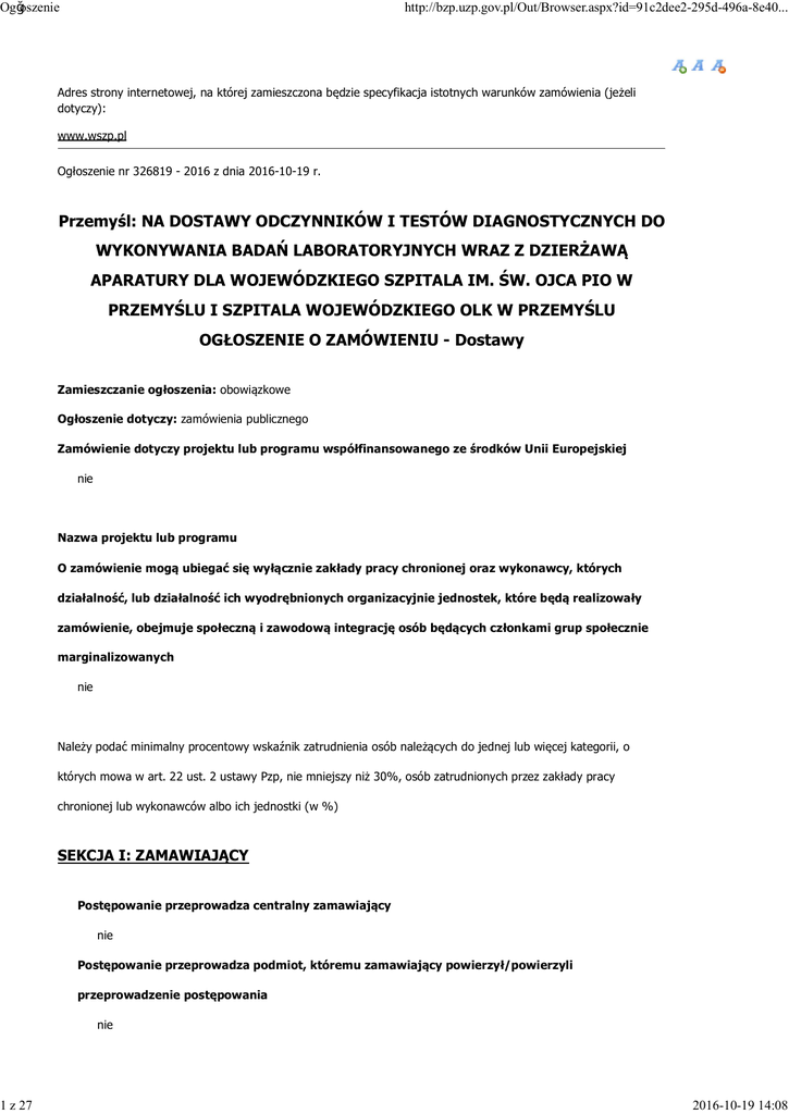Ogłoszenie 1 z 27 http://bzp.uzp.gov.pl/Out/Browser.aspx?id=91c2dee2-295d-496a-8e40... Adres strony internetowej, na której zamieszczona będzie specyfikacja istotnych warunków zamówienia (jeżeli dotyczy): www.wszp.pl Ogłoszenie nr 326819 - 2016 z dnia 2016-10-19 r. Przemyśl: NA DOSTAWY ODCZYNNIKÓW I TESTÓW DIAGNOSTYCZNYCH DO WYKONYWANIA BADAŃ LABORATORYJNYCH WRAZ Z DZIERŻAWĄ APARATURY DLA WOJEWÓDZKIEGO SZPITALA IM. ŚW. OJCA PIO W PRZEMYŚLU I SZPITALA WOJEWÓDZKIEGO OLK W PRZEMYŚLU OGŁOSZENIE O ZAMÓWIENIU - Dostawy Zamieszczanie ogłoszenia: obowiązkowe Ogłoszenie dotyczy: zamówienia publicznego Zamówienie dotyczy projektu lub programu współfinansowanego ze środków Unii Europejskiej nie Nazwa projektu lub programu O zamówienie mogą ubiegać się wyłącznie zakłady pracy chronionej oraz wykonawcy, których działalność, lub działalność ich wyodrębnionych organizacyjnie jednostek, które będą realizowały zamówienie, obejmuje społeczną i zawodową integrację osób będących członkami grup społecznie marginalizowanych nie Należy podać minimalny procentowy wskaźnik zatrudnienia osób należących do jednej lub więcej kategorii, o których mowa w art. 22 ust. 2 ustawy Pzp, nie mniejszy niż 30%, osób zatrudnionych przez zakłady pracy chronionej lub wykonawców albo ich jednostki (w %) SEKCJA I: ZAMAWIAJĄCY Postępowanie przeprowadza centralny zamawiający nie Postępowanie przeprowadza podmiot, któremu zamawiający powierzył/powierzyli przeprowadzenie postępowania nie 2016-10-19 14:08 Ogłoszenie 2 z 27 http://bzp.uzp.gov.pl/Out/Browser.aspx?id=91c2dee2-295d-496a-8e40... Informacje na temat podmiotu któremu zamawiający powierzył/powierzyli prowadzenie postępowania: Postępowanie jest przeprowadzane wspólnie przez zamawiających nie Jeżeli tak, należy wymienić zamawiających, którzy wspólnie przeprowadzają postępowanie oraz podać adresy ich siedzib, krajowe numery identyfikacyjne oraz osoby do kontaktów wraz z danymi do kontaktów: Postępowanie jest przeprowadzane wspólnie z zamawiającymi z innych państw członkowskich Unii Europejskiej nie W przypadku przeprowadzania postępowania wspólnie z zamawiającymi z innych państw członkowskich Unii Europejskiej – mające zastosowanie krajowe prawo zamówień publicznych: Informacje dodatkowe: I. 1) NAZWA I ADRES: Wojewódzki Szpital im. św. Ojca Pio w Przemyślu, krajowy numer identyfikacyjny 31468400000, ul. ul. Monte Cassino 18, 37700 Przemyśl, woj. podkarpackie, państwo Polska, tel. 166 775 065, e-mail , faks 166 775 064. Adres strony internetowej (URL): www.wszp.pl I. 2) RODZAJ ZAMAWIAJĄCEGO: Inny: Smodzielny Publiczny Zakład Opieki Zdrowotnej I.3) WSPÓLNE UDZIELANIE ZAMÓWIENIA (jeżeli dotyczy) : Podział obowiązków między zamawiającymi w przypadku wspólnego przeprowadzania postępowania, w tym w przypadku wspólnego przeprowadzania postępowania z zamawiającymi z innych państw członkowskich Unii Europejskiej (który z zamawiających jest odpowiedzialny za przeprowadzenie postępowania, czy i w jakim zakresie za przeprowadzenie postępowania odpowiadają pozostali zamawiający, czy zamówienie będzie udzielane przez każdego z zamawiających indywidualnie, czy zamówienie zostanie udzielone w imieniu i na rzecz pozostałych zamawiających): I.4) KOMUNIKACJA: Nieograniczony, pełny i bezpośredni dostęp do dokumentów z postępowania można uzyskać pod adresem (URL) nie www.wszp.pl Adres strony internetowej, na której zamieszczona będzie specyfikacja istotnych warunków 2016-10-19 14:08 Ogłoszenie 3 z 27 http://bzp.uzp.gov.pl/Out/Browser.aspx?id=91c2dee2-295d-496a-8e40... zamówienia nie www.wszp.pl Dostęp do dokumentów z postępowania jest ograniczony - więcej informacji można uzyskać pod adresem nie Oferty lub wnioski o dopuszczenie do udziału w postępowaniu należy przesyłać: Elektronicznie nie adres Dopuszczone jest przesłanie ofert lub wniosków o dopuszczenie do udziału w postępowaniu w inny sposób: nie Wymagane jest przesłanie ofert lub wniosków o dopuszczenie do udziału w postępowaniu w inny sposób: tak Inny sposób: W formie pisemnej na adres zamawiajacego Adres: Wojewódzki Szpital im. Św. Ojca Pio w Przemyślu, ul. Monte Cassino 18, 37-700 Przemyślu Komunikacja elektroniczna wymaga korzystania z narzędzi i urządzeń lub formatów plików, które nie są ogólnie dostępne nie Nieograniczony, pełny, bezpośredni i bezpłatny dostęp do tych narzędzi można uzyskać pod adresem: (URL) SEKCJA II: PRZEDMIOT ZAMÓWIENIA II.1) Nazwa nadana zamówieniu przez zamawiającego: NA DOSTAWY ODCZYNNIKÓW I TESTÓW 2016-10-19 14:08 Ogłoszenie 4 z 27 http://bzp.uzp.gov.pl/Out/Browser.aspx?id=91c2dee2-295d-496a-8e40... DIAGNOSTYCZNYCH DO WYKONYWANIA BADAŃ LABORATORYJNYCH WRAZ Z DZIERŻAWĄ APARATURY DLA WOJEWÓDZKIEGO SZPITALA IM. ŚW. OJCA PIO W PRZEMYŚLU I SZPITALA WOJEWÓDZKIEGO OLK W PRZEMYŚLU Numer referencyjny: ZP/48/PN/2016 Przed wszczęciem postępowania o udzielenie zamówienia przeprowadzono dialog techniczny nie II.2) Rodzaj zamówienia: dostawy II.3) Informacja o możliwości składania ofert częściowych Zamówienie podzielone jest na części: Nie II.4) Krótki opis przedmiotu zamówienia (wielkość, zakres, rodzaj i ilo ść dostaw, usług lub robót budowlanych lub okre ślenie zapotrzebowania i wymaga ń ) a w przypadku partnerstwa innowacyjnego określenie zapotrzebowania na innowacyjny produkt, usługę lub roboty budowlane: Zad. 1 dostawy testów do wykrywania antygenu Streptococcus pneumoniae w moczu- 1 poz. asort. w ilości 120 szt.; Zad. 2 - dostawa surowic liofilizowanych do aglutynacji szkiełkowej dla antygenów Salmonella sp. – 13 poz. asort. w różnych ilościach; Zad. 3 - dostawa Lateksowych testów diagnostycznych -9 poz. asort. w różnych ilościach; Zad. 4 - dostawa podłoży do diagnostyki gruźlicy - 8 poz. asort. w ilości po 30 probówek; Zad. 5 dostawa testów do wykrywania Clostridium