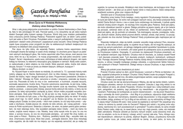 Gazetka Parafialna Parafia p.w. p.w. św. Mikołaja w Wielu Wiele 11 maja 2014 r. Nr 19 (205) Słowo Życia na IV Niedzielę Wielkanocną Ulubiony obraz Dobrego Pasterza. Wraz z całą grupą pielgrzymów przechodziłem w pobliżu Cezarei Nadmorskiej w Ziemi Świętej. Były to lata zamykające XX wiek. Panował spokój, a my cieszyliśmy się jak dzieci każdym śladem Ewangelii jakby krokami samego Chrystusa. Wśród dróg poza miastem podziwialiśmy nieco zniszczony pomnik Dobrego Pasterza. Przewodnik wyjaśnił nam, że takich i jemu podobnych jest wiele w Ziemi Chrystusa. Pomyślałem sobie o naszych podhalańskich i bieszczadzkich pasterzach i stadach owiec pilnowanych i popędzanych przez owczarki. Obraz Dobrego Pasterza często bywa przysyłany przez przyjaciół nie tylko na wielkanocnych kartkach świątecznych lub darowany na okładkach wielu pozycji książkowych. Pan Jezus nie tylko dobry, ale wspaniały Pasterz, cudowna brama wspomniana dzisiaj w Ewangelii otwarta dla każdego w czasie chrztu świętego i to ukochane grono idących za pasterzem wiernych słuchających głosu. Nie można zapomnieć słów Pana Jezusa „mam jeszcze inne owce, które nie są z tej owczarni, i te muszę przyprowadzić, aby była jedna owczarnia i jeden Pasterz”. Są też i nieposłuszne, uparte owce, odchodzące od stada własnymi drogami. Jak często trafiają na manowce, ku własnemu nieszczęściu giną zaplątane w cierniach. Myślę sobie czasem, co zadecydowało o takim odejściu na inne ścieżki. Może pewność siebie, modne dziś własne decyzje, korzyści ? A może po prostu za chlebem lżejszym, obfitszym, kuszącym ? Własny dorobek i co dalej ? Ks. Ryszard Koper w swoim słowie na niedzielę „Ku wolności”(s. 73 ) opowiada historię matki rodziny udającej się do Stanów Zjednoczonych choć na kilka miesięcy. Intencje były piękne... Zarobić dla rodziny, męża i dwojga dorosłych już dzieci. Przypomniano powiedzenie „Ameryka to łóżko i fabryka”. Wracając do Polski, zanurzona w smutku i zmęczeniu, zwierzała się towarzyszom lotu. Pracowała od świtu do nocy w tzw. swetrowniach, w kuchniach, zmywała naczynia, szorowała zapuszczone, brudne domy. Fizycznie wykończona zapomniała, że jest żoną, matką, wolnym człowiekiem, chrześcijanką. Szorując brudne łazienki czuła się niewolnicą. Powtarzała sobie ku pociesze... a jeszcze jeden miesiąc, jeszcze trochę zielonych dla rodziny, w domu się nie przelewa. Do takiej wytrzymałości zachęcały ją dzieci, którym matka przysyłała wszystkie zarobione pieniądze. Swój pobyt Weronika, bo tak jej było na imię, liczyła już latami. Polska była daleko, do kościoła nie było czasu, a Pan Bóg przykryty pieniądzem jakby nie istniał. W między czasie zmarł mąż. Co robić? Jechać na pogrzeb? Już do Stanów nie wrócę, nie mam prawa stałego pobytu! Została, bo dzieci prosiły – niech mam zostanie, bo cóż tutaj może pomóc – usłyszała w słuchawce. Została jeszcze rok, straciła nie tylko zdrowie, ale i swoją godność – teraz wraca do Polski wycieńczona. Stwierdza z drżeniem „nie wiem, nie jestem pewna gdzie zamieszkam, nie mam własnego domu. Gdy wysyłałam pieniądze dzieci mówiły – niech się mama nie martwi, znajdzie mama miejsce u nas. Niestety, teraz córka wysyła mnie do syna, bo ona ma dzieci, a synowa krzyczy, że ona nie otrzymywała pieniędzy... ani centa! Nie chcę myśleć, co mnie czeka w Polsce... Rodzinny dom... Rodzinny, parafialny kościół, Bóg – wszystko stało się obce. Zmarnowany kawał życia. Może ktoś powie... pomagała dzieciom, które teraz mieszkają sobie wygodnie, ale dla matki nie ma miejsca, syn ma wspaniały samochód, ale po matkę nie wyjedzie, bo synowa nie pozwala. Wolałabym mieć dzieci biedniejsze, ale kochające mnie i Boga otwartym sercem – ale teraz już za późno! Apetyt rośnie w miarę jedzenia. Gdzie wdzięczność, wrażliwość sumienia, gdzie czas i miejsce dla Boga? Ziemskie życie w Chrystusowej Owczarni. Weszliśmy przez bramę Chrztu świętego, znamy regulamin Chrystusowego Kościoła, wiemy, że życie jest darem Boga, nie wolno nam przegapić ważnych rzeczy, aby kiedyś przeżywać Bożą radość! Darów Bożych nikomu z nas w czasie życia codziennego nie brakowało. A jednak uparte owieczki chodzą swoimi drogami, nie słuchają mimo wszystko głosu Pasterza. Świat jest piękny, ale może człowiekowi zawrócić w głowie. Dlatego potrzebne są pewne zasady, jak w tym świecie się poruszać, odróżniać dobro od zła, miłość od zachłanności. Dobry Pasterz przypomina, że świat jest piękny, ale zło pochodzi od człowieka. Tyle dostrzegamy oszustw, przestępstw, rozbojów, złudnych nadziei. Złudną radość przynosi alkohol, narkotyk, zdrada, chęć zemsty. Co począć, gdy człowiek nie chce słuchać Dobrego Pasterza? Kiedy przysłowiowe jajko mądrzejsze jest od kury? Wspaniały inteligencik, zdaje się katolik, powiada: wszystko mogę wybaczyć Panu Jezusowi, nawet to, że bez słowa protestu zginął, no zupełnie nie po męsku, ale nie mogę Mu wybaczyć, że otoczył się samymi pastuchami, ani jednego inteligenta pośród apostołów! Apostołowie to prostacy, galilejski proletariat. A to konkretni, ufni ludzie gotowi do poświęcenia życia za prawdę Bożą, za Chrystusowe myślenie i Ewangelię. Ci uczniowie nie ośpiewywali Chrystusa piosenkami, ani nie wysławiali wierszami Jego Boskości. Chrystus miał ich dwunastu, za Judasza wszedł Paweł i tych dwunastu przeorało świat. Tych dwunastu prostych, myślących, konkretnych, wnikliwych ludzi. Poznając otoczenie Dobrego Pasterza możemy dzisiaj wierzyć w doświadczenia ludzkiego rozumu, w zdrowy rozsądek myślącego prostego człowieka, w autentyczność faktów historycznych opisanych w Nowym Testamencie. Dlatego wierzę w Jezusa Chrystusa, w Jego zmartwychwstanie Wierzy tyle pokoleń przez dwadzieścia już stuleci. Prz