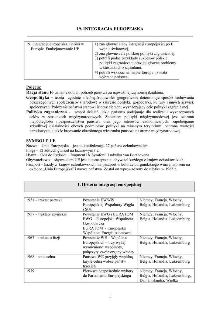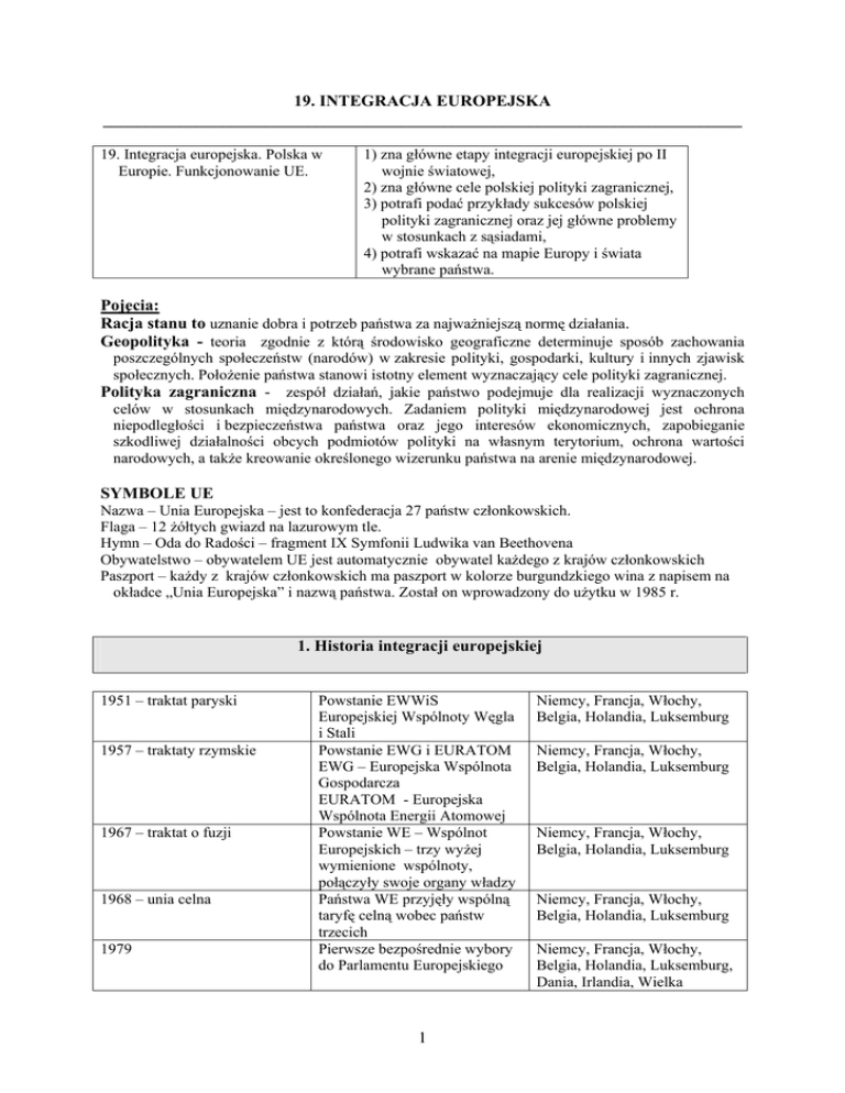 19. INTEGRACJA EUROPEJSKA ___________________________________________________________________________ 19. Integracja europejska. Polska w Europie. Funkcjonowanie UE. 1) zna główne etapy integracji europejskiej po II wojnie światowej, 2) zna główne cele polskiej polityki zagranicznej, 3) potrafi podać przykłady sukcesów polskiej polityki zagranicznej oraz jej główne problemy w stosunkach z sąsiadami, 4) potrafi wskazać na mapie Europy i świata wybrane państwa. Pojęcia: Racja stanu to uznanie dobra i potrzeb państwa za najważniejszą normę działania. Geopolityka - teoria zgodnie z którą środowisko geograficzne determinuje sposób zachowania poszczególnych społeczeństw (narodów) w zakresie polityki, gospodarki, kultury i innych zjawisk społecznych. Położenie państwa stanowi istotny element wyznaczający cele polityki zagranicznej. Polityka zagraniczna - zespół działań, jakie państwo podejmuje dla realizacji wyznaczonych celów w stosunkach międzynarodowych. Zadaniem polityki międzynarodowej jest ochrona niepodległości i bezpieczeństwa państwa oraz jego interesów ekonomicznych, zapobieganie szkodliwej działalności obcych podmiotów polityki na własnym terytorium, ochrona wartości narodowych, a także kreowanie określonego wizerunku państwa na arenie międzynarodowej. SYMBOLE UE Nazwa – Unia Europejska – jest to konfederacja 27 państw członkowskich. Flaga – 12 żółtych gwiazd na lazurowym tle. Hymn – Oda do Radości – fragment IX Symfonii Ludwika van Beethovena Obywatelstwo – obywatelem UE jest automatycznie obywatel każdego z krajów członkowskich Paszport – każdy z krajów członkowskich ma paszport w kolorze burgundzkiego wina z napisem na okładce „Unia Europejska” i nazwą państwa. Został on wprowadzony do użytku w 1985 r. 1. Historia integracji europejskiej 1951 – traktat paryski 1957 – traktaty rzymskie 1967 – traktat o fuzji 1968 – unia celna 1979 Powstanie EWWiS Europejskiej Wspólnoty Węgla i Stali Powstanie EWG i EURATOM EWG – Europejska Wspólnota Gospodarcza EURATOM - Europejska Wspólnota Energii Atomowej Powstanie WE – Wspólnot Europejskich – trzy wyżej wymienione wspólnoty, połączyły swoje organy władzy Państwa WE przyjęły wspólną taryfę celną wobec państw trzecich Pierwsze bezpośrednie wybory do Parlamentu Europejskiego 1 Niemcy, Francja, Włochy, Belgia, Holandia, Luksemburg Niemcy, Francja, Włochy, Belgia, Holandia, Luksemburg Niemcy, Francja, Włochy, Belgia, Holandia, Luksemburg Niemcy, Francja, Włochy, Belgia, Holandia, Luksemburg Niemcy, Francja, Włochy, Belgia, Holandia, Luksemburg, Dania, Irlandia, Wielka 1985 – układ w Schengen 1986 – Jednolity Akt Europejski 1992 – układ w Maastricht (Belgia) 1995 – w życie weszło porozumienie wykonawcze traktatu w Schengen 1997 – traktat amsterdamski 1998 2001 – traktat nicejski 2002 2003 – Ateny 2007 – 21 grudnia Stopniowe znoszenie kontroli granicznej w ruchu osobowym między krajami Decyzja o utworzeniu Rynku Wewnętrznego do końca 1992 r. Zmieniono procedurę podejmowania decyzji we Wspólnotach Europejskich Powstaje Unia Europejska (WE przekształca się w UE) oparta na trzech filarach. Powstaje jednolity rynek wewnętrzny UE Członkowie UE mogą swobodnie poruszać się wewnątrz krajów UE. Do układu nie przystąpiła Wielka Brytania i Irlandia Reforma UE – zreformowano instytucje UE Utworzono Europejski Bank Centralny Nowelizacja układu o UE – zgoda na rozpoczęcie negocjacji z nowymi państwami, które chcą wstąpić do UE Strefa euro – 12 krajów członkowskich wprowadziło nową walutę (wyjątek – Wielka Brytania, Irlandia i Szwecja) Traktat akcesyjny pomiędzy UE (15 państw), a 10 nowymi członkami. W krajach tych po podpisaniu traktatu przeprowadzono referendum, by zatwierdzić akcesję do UE Polska i inne nowe kraje przystąpią do strefy Schengen Brytania RFN, Francja, Belgia, Holandia, Luksemburg Niemcy, Francja, Włochy, Belgia, Holandia, Luksemburg, Dania, Irlandia, Wielka Brytania, Grecja, Hiszpania, Portugalia Niemcy, Francja, Włochy, Belgia, Holandia, Luksemburg, Dania, Grecja, Hiszpania, Portugalia Niemcy, Francja, Włochy, Belgia, Holandia, Austria, Finlandia, Luksemburg, Dania, Grecja, Hiszpania, Portugalia Polska, Czechy, Słowacja, Litwa, Łotwa, Estonia, Malta, Cypr, Węgry, Słowenia Rozwój terytorialny Unii – obecnie w UE jest 27 państw 1951 Niemcy, Francja, Włochy, Belgia, Holandia, Luksemburg 1973 Dania, Irlandia, Wielka Brytania 1981 Grecja 1986 Hiszpania, Portugalia 1995 Austria, Finlandia i Szwecja 2004 Łotwa, Litwa, Estonia, Polska, Czechy, Słowacja, Cypr, Węgry, Malta, Słowenia 2007 Bułgaria, Rumunia 2 2. Funkcjonowanie UE Filary UE I filar Wspólnota Europejska (Unia Gospodarcza i Walutowa) • • • • • • Instytucje UE – Parlament Europejski, Rada Europejska, Komisja Europejska, Trybunał Sprawiedliwości unia gospodarcza i walutowa – wspólna waluta euro, Europejski Bank Centralny wspólny rynek wspólna polityka: rolna, handlowa, transportowa i ochrony środowiska wspólna polityka azylowa, imigracyjna i wizowa obywatelstwo europejskie i ochrona praw obywatelskich II filar Wspólna polityka zagraniczna i bezpieczeństwa • • Konsultacje i ustalanie wspólnych stanowisk w sprawach: pokoju, praw człowieka, demokracji, pomocy publicznej krajom trzecim wspólne działanie w ramach OBWE, misje pokojowe i humanitarne, pomoc na rzecz krajów rozwijających się (APAD) III filar Wymiar sprawiedliwości i sprawy wewnętrzne • • • • • walka z rasizmem i ksenofobią walka z przestępczością zorganizowaną: terroryzmem, handlem ludźmi, narkobiznsem, handlem bronią, korupcją EUROPOL – Europejski Urząd Policji współpraca między władzami sądowymi państw członkowskich (np. Europejski Nakaz Aresztowania) ujednolicenie norm prawa karnego i materialnego Instytucje polityczne UE 1. Rada Europejska – jej celem jest uł