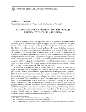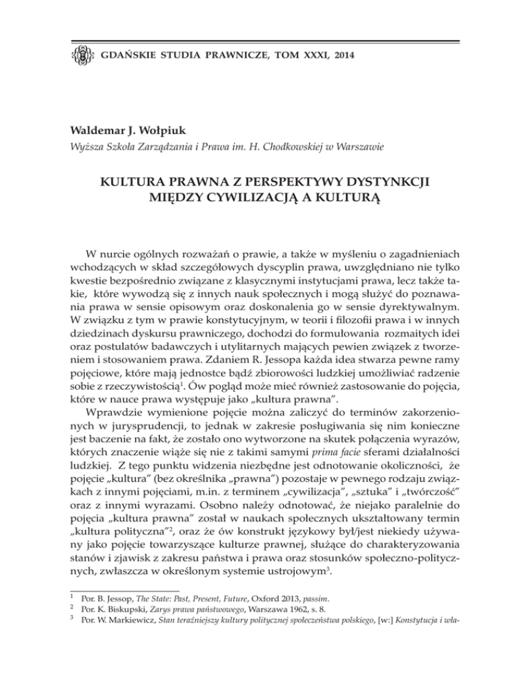 GDAŃSKIE STUDIA PRAWNICZE, TOM XXXI, 2014 Waldemar J. Wołpiuk Wyższa Szkoła Zarządzania i Prawa im. H. Chodkowskiej w Warszawie Kultura prawna z perspektywy dystynkcji między cywilizacją a kulturą W nurcie ogólnych rozważań o prawie, a także w myśleniu o zagadnieniach wchodzących w skład szczegółowych dyscyplin prawa, uwzględniano nie tylko kwestie bezpośrednio związane z klasycznymi instytucjami prawa, lecz także takie, które wywodzą się z innych nauk społecznych i mogą służyć do poznawania prawa w sensie opisowym oraz doskonalenia go w sensie dyrektywalnym. W związku z tym w prawie konstytucyjnym, w teorii i filozofii prawa i w innych dziedzinach dyskursu prawniczego, dochodzi do formułowania rozmaitych idei oraz postulatów badawczych i utylitarnych mających pewien związek z tworzeniem i stosowaniem prawa. Zdaniem R. Jessopa każda idea stwarza pewne ramy pojęciowe, które mają jednostce bądź zbiorowości ludzkiej umożliwiać radzenie sobie z rzeczywistością1. Ów pogląd może mieć również zastosowanie do pojęcia, które w nauce prawa występuje jako „kultura prawna”. Wprawdzie wymienione pojęcie można zaliczyć do terminów zakorzenionych w jurysprudencji, to jednak w zakresie posługiwania się nim konieczne jest baczenie na fakt, że zostało ono wytworzone na skutek połączenia wyrazów, których znaczenie wiąże się nie z takimi samymi prima facie sferami działalności ludzkiej. Z tego punktu widzenia niezbędne jest odnotowanie okoliczności, że pojęcie „kultura” (bez określnika „prawna”) pozostaje w pewnego rodzaju związkach z innymi pojęciami, m.in. z terminem „cywilizacja”, „sztuka” i „twórczość” oraz z innymi wyrazami. Osobno należy odnotować, że niejako paralelnie do pojęcia „kultura prawna” został w naukach społecznych ukształtowany termin „kultura polityczna”2, oraz że ów konstrukt językowy był/jest niekiedy używany jako pojęcie towarzyszące kulturze prawnej, służące do charakteryzowania stanów i zjawisk z zakresu państwa i prawa oraz stosunków społeczno-politycznych, zwłaszcza w określonym systemie ustrojowym3. 1 Por. B. Jessop, The State: Past, Present, Future, Oxford 2013, passim. Por. K. Biskupski, Zarys prawa państwowego, Warszawa 1962, s. 8. 3 Por. W. Markiewicz, Stan teraźniejszy kultury politycznej społeczeństwa polskiego, [w:] Konstytucja i wła2 180 Waldemar J. Wołpiuk Nieodosobniony jest pogląd, że prawo jest wytworem kultury ludzkiej oraz że jest ono jednym ze znaczących składników kultury4. Trudno byłoby aprobować pogląd, że prawo jako forma regulacji stosunków między ludźmi zostało stworzone bez udziału rozumu człowieka i jego woli. Będąc więc przejawem stosunków społecznych i wytworem ludzi, prawo jest produktem cywilizacji ludzkiej. Zostało bowiem stworzone w sposób sztuczny przez człowieka5, bez udziału sił natury6, z potrzeby regulowania stosunków prawnych, po to by miały one charakter przewidywalny, zapewniały bezpieczeństwo obrotu prawnego, odbywały się w sposób niechaotyczny oraz służyły zarówno interesom podmiotowym jednostek uczestniczących w stosunkach międzyludzkich, jak i interesom zbiorowym cywilizowanych wspólnot ludzkich. Czynnikiem, który przyczynił się do stworzenia prawa, było zatem osiągnięcie przez ludzkość takiego stopnia rozwoju, który wygenerował społeczną i kulturową potrzebę stworzenia instrumentu umożliwiającego organizację współżycia jednostek i wspólnot ludzkich, poczynając od małych zbiorowości po twory o charakterze państwowym7. Skoro uprawnione jest twierdzenie, że prawo wytworzone zostało w rezultacie rozwoju cywilizacyjnego, to za naturalne można uznać pytanie, jakie jest źródło idei (zjawiska, postulatu) występującej pod nazwą „kultura prawna” oraz dlaczego nauka posiłkuje się pojęciem kultura prawna, nie zaś sformułowaniem cywilizacja prawna? Wątpliwość dotycząca tej kwestii wynika przede wszystkim z niejednoznaczności pojęć „cywilizacja” i „kultura” oraz stosunku między nimi ze względu na ich znaczenie. Dążenie do rozwiązania tych kwestii ma znaczenie zwłaszcza ze względu na potrzebę zarówno racjonalnego rozumienia idei, którymi posługuje się nauka prawa, jak i ze względu na wynikające z nich pożytki8. dza we współczesnym świecie. Doktryna, prawo, praktyka. Prace dedykowane profesorowi Wojciechowi Sokolewiczowi na siedemdziesięciolecie urodzin, Warszawa 2002, s. 22–29; K. Opałek, Zagadnienia…, s. 282 i n.; P. Sztompka, Zaufanie. Fundament społeczeństwa. Kraków 2007, s. 39; S. Russocki, Wokół pojęć „kultura polityczna” i „kultura prawna”, „Państwo i Prawo” 1981, z. 3, s. 40–49; J. Oniszczuk, Kultura i wartości państwa i prawa, [w:] Współczesne państwo w teorii i praktyce, red. J. Oniszczuk. Warszawa 2011, s. 501. 4 Por. R. Tokarczyk, Współczesne kultury prawne. Warszawa 2012, s. 62. 5 Jak zauważa J. Wróblewski, prawo jest „wytworem człowieka i w tym sensie jest zjawiskiem kulturowym”, ponadto prawo jest czynnikiem kształtującym kulturę społeczną w ogóle, a w szczególności „ten jej element, który czasem nazywamy kulturą prawną”. J. Wróblewski, Prawo jako zjawisko kultury w amerykańskiej filozofii i teorii prawa, Zeszyty Naukowe Wydziału Prawa i Administracji Uniwersytetu Gdańskiego. Studia Prawnoustrojowe 1988, nr 1, s. 21. 6 K. Prochownik, analizując poglądy Fransa de Waala, holenderskiego prymatologa i etnologa, zwraca uwagę na koncepcję, według której niektóre normatywne zachowania jednostki ludzkiej mogą wywodzić się zarówno z cech człowieka stworzonych przez naturę, jak i wykształtowanych przez uczenie się oraz więzi społeczne. Por. K. Prochownik, Normy i normatywność z perspektywy Social Instincts Theory. Zmagania natury i kultury. Referat przygotowany na Konferencję prawo a kultura – kultura a prawo (maj 