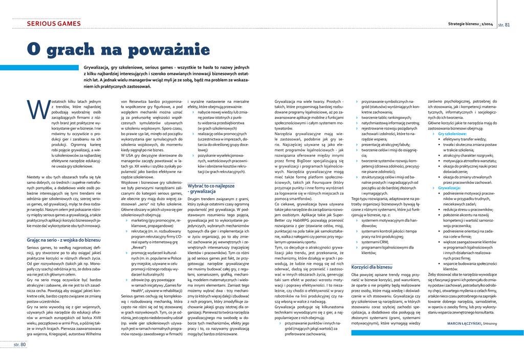 SERiOuS gamES Strategie biznesu^1/2014 O grach na poważnie Grywalizacja, gry szkoleniowe, serious games - wszystkie te hasła to nazwy jednych z kilku najbardziej interesujących i szeroko omawianych innowacji biznesowych ostatnich lat. A jednak wielu managerów wciąż myli je ze sobą, bądź ma problem ze wskazaniem ich praktycznych zastosowań. W ostatnich kilku latach jednym z trendów, które najbardziej pobudzają wyobraźnię osób zarządzających firmami z różnych branż jest praktyczne wykorzystanie gier w biznesie. I nie mówimy tu oczywiście o produkcji gier i zarabianiu na ich produkcji. Ogromną karierę robi pojęcie grywalizacji, a wielu szkoleniowców za najbardziej efektywne narzędzie edukacyjne uważa gry szkoleniowe. Niestety w obu tych obszarach trafia się tyle samo dobrych, co średnich i zupełnie nietrafionych pomysłów, a dodatkowo wiele osób pobieżnie interesujących się tymi trendami nie odróżnia gier szkoleniowych czy, szerzej serious games, od grywalizacji, myląc te dwa rodzaje narzędzi. Naszym celem jest pokazanie różnicy między serious games a grywalizacją, a także praktycznych aplikacji i korzyści biznesowych jakie może dać wykorzystanie obu tych innowacji. Grając na serio - z wojska do biznesu Serious games, to według najprostszej definicji, gry stworzone po to aby osiągać jakieś praktyczne korzyści w różnych sferach życia. Od gier rozrywkowych (takich jak np. Monopolly czy szachy) odróżnia je to, że dobra zabawa nie jest ich głównym celem. Gry na serio mogą oczywiście być bardzo atrakcyjne i zabawne, ale nie jest to ich zasadnicza cecha. Powstają aby osiągać jakieś konkretne cele, bardzo często związane ze zmianą postaw uczestników. Gry na serio wywodzą się z gier wojennych, używanych jako narzędzie do edukacji oficerów w armiach europejskich od końca XVIII wieku, początkowo w armii Prus, a później także w innych krajach. Pierwsza zaawansowana gra wojenna, Kriegsspiel, autorstwa Wilhelma str. 80 von Reisewitza bardzo przypominała współczesne gry figurkowe, a pod względem mechaniki można uznać ją za prekursorkę większości współczesnych symulatorów używanych w szkoleniu wojskowym. Sporo czasu, bo prawie 150 lat, minęło od początku wykorzystania gier symulacyjnych do szkolenia wojskowych, do momentu kiedy sięgnął po nie biznes. W USA gry decyzyjne skierowane do managerów zaczęły powstawać w latach 50. XX wieku i szybko zyskały popularność jako bardzo efektywne narzędzie szkoleniowe. Wojskowe i biznesowe gry szkoleniowe były pierwszymi narzędziami zaliczanymi do kategorii serious games, ale obecnie gry mają dużo więcej zastosowań „serio” niż tylko szkolenie. Główne obszary w jakich używa się gier szkoleniowych obejmują: marketing (gry promocyjne, reklamowe, propagandowe) rekrutację (m. in. rozbudowany program rekrutacyjny firmy L'Oreal oparty o internetową grę „Reveal”) promocję wydarzeń kulturalnych (m. in. popularne w Polsce gry miejskie, używane w celu promocji różnego rodzaju wydarzeń kulturalnych) zdrowie (np. gry powstające w ramach inicjatywy „Games for Health”, używane w rehabilitacji) Serious games cechują się kompleksową i rozbudowaną mechaniką, która często nie różni się od tej stosowanej w grach rozrywkowych. Tym, co je odróżnia, jest często niedobrowolny udział (np. wiele gier szkoleniowych używanych jest w ramach normalnych programów rozwoju zawodowego w firmach) i wyraźne nastawienie na mierzalne efekty, które obejmują przeważnie: nabycie nowej wiedzy lub zmianę postaw istotnych z punktu widzenia przedsiębiorstwa (w grach szkoleniowych) realizację celów promocyjnych (uczestnictwa w imprezach, dotarcia do określonej grupy docelowej) pozyskanie wyselekcjonowanych, wartościowych pracowników i obniżenie kosztów rekrutacji (w grach rekrutacyjnych). Wybrać to co najlepsze - grywalizacja Drugim trendem związanym z grami, który zyskuje ostatnimi czasy ogromną popularność jest grywalizacja. W podstawowym rozumieniu tego pojęcia, grywalizacja jest to wykorzystanie pojedynczych, wybranych mechanizmów typowych dla gier i implementacja ich w życiu organizacji, po to aby zmienić zachowanie jej wewnętrznych i zewnętrznych interesariuszy (najczęściej klientów i pracowników). Tym co różni ją od serious games jest fakt, że przygotowując narzędzie grywalizacyjne nie musimy budować całej gry, z regułami, scenariuszem, grafiką, mechaniką, modelem matematycznych i wieloma innymi elementami. Zamiast tego możemy wybrać dwa - trzy mechanizmy (o których więcej dalej) i zbudować z nich program, który zmodyfikuje zachowanie jakiejś grupy istotnej dla organizacji. Ponieważ to twórca narzędzia grywalizacyjnego ma swobodę w doborze tych mechanizmów, efekty jego pracy i to, co nazywamy grywalizacją mogą być bardzo zróżnicowane. Grywalizacja ma wiele twarzy. Prostych takich, które przypominają bardziej rozbudowane programy lojalnościowe, aż po zaawansowane aplikacje mobilne z funkcjami społecznościowymi i całym systemem motywatorów. Narzędzia grywalizacyjne mają wiele zastosowań, podobnie jak gry serio. Najczęściej używane są jako element programów lojalnościowych - jak rozwiązania oferowane między innymi przez firmę BigDoor specjalizującą się w grywalizacji i programach lojalnościowych. Narzędzia grywalizacyjne mogą mieć także formę platform społecznościowych, takich jak Foursquare (który przyznaje punkty i inne formy wyróżnień za logowanie się w różnych miejscach za pomocą smartfonów). Co ciekawe, grywalizacja bywa używana także jako narzędzie do zarządzania rozwojem osobistym. Aplikacje takie jak SuperBetter czy HabitRPG pozwalają przenosić rozwiązania z gier (stawianie celów, misji, punktacja) na pola takie jak samokształcenie, walka z nałogami czy pomoc przy regularnym uprawianiu sportu. Tym, co decyduje o atrakcyjności grywalizac