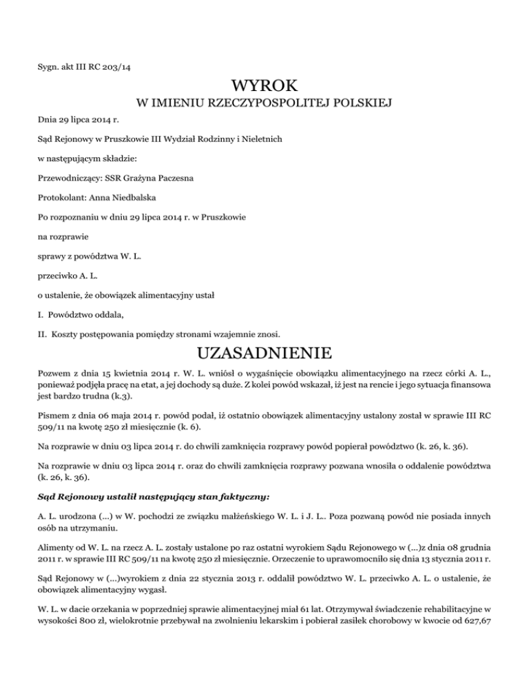 Sygn. akt III RC 203/14 WYROK W IMIENIU RZECZYPOSPOLITEJ POLSKIEJ Dnia 29 lipca 2014 r. Sąd Rejonowy w Pruszkowie III Wydział Rodzinny i Nieletnich w następującym składzie: Przewodniczący: SSR Grażyna Paczesna Protokolant: Anna Niedbalska Po rozpoznaniu w dniu 29 lipca 2014 r. w Pruszkowie na rozprawie sprawy z powództwa W. L. przeciwko A. L. o ustalenie, że obowiązek alimentacyjny ustał I. Powództwo oddala, II. Koszty postępowania pomiędzy stronami wzajemnie znosi. UZASADNIENIE Pozwem z dnia 15 kwietnia 2014 r. W. L. wniósł o wygaśnięcie obowiązku alimentacyjnego na rzecz córki A. L., ponieważ podjęła pracę na etat, a jej dochody są duże. Z kolei powód wskazał, iż jest na rencie i jego sytuacja finansowa jest bardzo trudna (k.3). Pismem z dnia 06 maja 2014 r. powód podał, iż ostatnio obowiązek alimentacyjny ustalony został w sprawie III RC 509/11 na kwotę 250 zł miesięcznie (k. 6). Na rozprawie w dniu 03 lipca 2014 r. do chwili zamknięcia rozprawy powód popierał powództwo (k. 26, k. 36). Na rozprawie w dniu 03 lipca 2014 r. oraz do chwili zamknięcia rozprawy pozwana wnosiła o oddalenie powództwa (k. 26, k. 36). Sąd Rejonowy ustalił następujący stan faktyczny: A. L. urodzona (...) w W. pochodzi ze związku małżeńskiego W. L. i J. L.. Poza pozwaną powód nie posiada innych osób na utrzymaniu. Alimenty od W. L. na rzecz A. L. zostały ustalone po raz ostatni wyrokiem Sądu Rejonowego w (...)z dnia 08 grudnia 2011 r. w sprawie III RC 509/11 na kwotę 250 zł miesięcznie. Orzeczenie to uprawomocniło się dnia 13 stycznia 2011 r. Sąd Rejonowy w (...)wyrokiem z dnia 22 stycznia 2013 r. oddalił powództwo W. L. przeciwko A. L. o ustalenie, że obowiązek alimentacyjny wygasł. W. L. w dacie orzekania w poprzedniej sprawie alimentacyjnej miał 61 lat. Otrzymywał świadczenie rehabilitacyjne w wysokości 800 zł, wielokrotnie przebywał na zwolnieniu lekarskim i pobierał zasiłek chorobowy w kwocie od 627,67 do 810,96 zł oraz wynajmował jedno pomieszczenie za 200 zł miesięcznie. Od 1973 do 2008 r. prowadził działalność gospodarczą w zakresie ślusarstwa. Aktualnie W. L. ma 65 lat. Zamieszkuje w domu stanowiącym jego własność wraz z żoną oraz córką. Nie prowadzą jednak wspólnego gospodarstwa domowego, żona zajmuje 30 m2 powierzchni domu, a córka 14 m2. Jego żona opłaca wodę, gaz i prąd. Pozwany przebywa na rencie w wysokości 660 zł miesięcznie, po potrąceniach komorniczych otrzymuje 324,07 zł. Wynajmuje pomieszczenie o powierzchni 14 m2, z którego otrzymuje 200 zł miesięcznie. Nie posiada oszczędności. Koszty swojego wyżywienia ocenia na 500 zł. Spłaca kredyt 1.000 zł. Posiada zaległości w alimentach i innych opłatach, w tym z tytułu podatku od wynajmu 300 zł. W utrzymaniu pomaga mu siostra I. S., która - jak zeznała - płaciła za niego alimenty oraz kupuje jedzenie, jak tez opłaca rachunki. Powód oczekuje na operację kręgosłupa, a ponadto leczy się odwykowo oraz chodzi do psychiatry i psychologa. Ma także wszyty esperal. Obecnie prowadzona jest przeciwko niemu egzekucja komornicza. Sąd Rejonowy wyrokiem z dnia 22 stycznia 2013 r. oddalił powództwo W. L. o ustalenie, że obowiązek alimentacyjny wobec A. L. wygasł. A. L. w dacie orzekania w poprzedniej sprawie alimentacyjnej miała 18 lat. Uczęszczała do Liceum Ogólnokształcącego dla dorosłych w P.. Mieszkała wraz z rodzicami w domu stanowiącym własność jej ojca. Aktualnie A. L. ma 20 lat. Nadal mieszka w tym samym miejscu. W domu o powierzchni 140 m ( 2) zajmuje pokój ( 2) o powierzchni 14 m . Studiuje na pierwszym roku Wyższej Szkoły (...)w W.. Studia odbywają się w systemie niestacjonarnym. Wspólnie z matką prowadzi gospodarstwo domowe. Matka opłaca rachunki za media, w tym; woda, prąd i gaz w wysokości 900 zł miesięcznie. Powódka robi zakupy w miarę możliwości finansowych. W koszty miesięcznego jej utrzymania wchodzi: wyżywienie 300-400 zł, ubranie 100 zł, kosmetyki 100 zł, dojazd na uczelnię 200-250 zł, czesne 620 zł, książki 100-150 zł. Ponadto za opiekę nad koniem ponosi wydatek 200 zł miesięcznie, bowiem w przyszłości chce zająć się hipoterapią. Spłaca pożyczkę zaciągniętą u znajomych na kwotę 2.000-3.000 zł w ratach po 50-100 zł miesięcznie. Jest zatrudniona na umowę o pracę w (...). na stanowisku młodszego specjalisty do spraw obsługi klienta. Umowa jest zawarta na czas określony od 01 marca 2014 r. do 28 lutego 2015 r. za średnim miesięcznym wynagrodzeniem 2.100 zł brutto miesięcznie. Otrzymując premie jest w stanie zarobić 2.100 zł netto miesięcznie. Od przyszłego roku akademickiego ma obowiązek odbycia 500 godzin praktyk, co uniemożliwi kontynuację obecnego zatrudnienia. Już obecnie nie stać jej na kursy zawodowe, których koszt to 2.000 zł. Korzysta z komunikacji miejskiej. Powyższy stan faktyczny Sąd Rejonowy ustalił w oparciu o następujące dowody: odpis skróconego aktu urodzenia powódki k. 3 akt III RC 509/11; zaświadczenie ze szkoły pozwanej k. 17 akt III RC 509/11; kopia zaświadczenia o wypłacanych zasiłkach z ZUS powoda k. 31-33 akt III RC 509/11; kopia PIT za 2013 r. powoda k. 14-17; potwierdzenie wysokości świadczenia z ZUS powoda k. 19, k. 32; zaświadczenie z uczelni pozwanej k. 21; wydruki potwierdzające dokonanie przelewów pozwanej k. 22-23; kopia PIT pozwanej k. 24-25; zeznania świadka J. S. k. 27-28; zeznania powoda k. 28, k. 38 akt niniejszych oraz k. 53 akt III RC 509/11; zeznania pozwanej 28-29, k. 38-39; kopia wezwania do zapłaty należności powoda k. 30; kopia potwierdzonych wpłat u komornika powoda k. 31; kopia zaświadczenia o dochodach pozwanej k. 33; kopia umowy o pracę pozwanej k. 34; kopia zaświadczenia lekarskiego powoda k. 35; zeznania świadka I. (...) k. 37. Ustalając stan faktyczny Sąd oparł się na wskazanych wyżej dowodach, uznając je za spójny i nie budzący wątpliwości materiał do