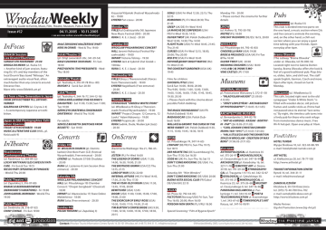 WrocławWeekly Krzysztof Kiljański (Festival Wyszehradzki) - 19:00 Łykend Pan czasu - 20:00 Free City Guide to Events, Music, Film, Theatre, Museum, Pubs & More Monday 7th Issue #12 Firlej (ul.Grabiszyńska 56) Japanese New Music Festival 2005 - 20:00 Rura O. K. E. J (Jazz) - 20:30 04.11.2005 - 10.11.2005 > we are now online: www.WroclawWeekly.pl InFocus Eklektik Session: Live Drum’n’Electronic Sunday 6th November - 21:00 Droga do mekki (ul. Ruska 51) > Another kind of jam session, featuring DJ, VJ’s and key members of the local Drum’n’Bass band “Miloopa.” An extravagant audio-visual feat, often much better than any concerts around. Entrance free. More info: www.Eklektik.art.pl Art from a New Generation in Japan From 29th October till 20th November Galeria na Czystej (ul. Czysta 2-4) > A contemporary Japanese art exhibition. Japan in Old Photographies: Exhibition Opening Friday 4th November - 19:00 Music & Literature Club (KMiL, pl. Kościuszki 9) InTheatre Współczesny (Contemporary) Theatre (ul. Rzeźnicza 12, 358-89-22) Lochy Watykanu (Les caves du Vatican) - Fri-Sun & Tue 19:15 Nie do pary (Speaking in Tongues) - Wed & Thu 20:00 Polski Theatre (1) (ul. Zapolskiej 3, 316-07-80) Wariacje Bernhardowskie (Bernhard’s Variations) - Fri 19:00 John Gabriel Borkman - Wed & Thu 19:00 Polski Theatre (2) (ul. Świdnicka 28, 316-07-52) Chiny (China) - Fri-Sun 19:00 Małe Zbrodnie Małżeńskie (Partners in Crime) - Wed & Thu 19:00 Polski Theatre (3) (pl. Orląt Lwowskich 20c, 341-29-54) Nasz Człowiek (Our Man) - Fri-Sun 18:00 Prezydentki (The Presidents) - WedThu 18:00 Komedia Theatre (pl. Teatralny 4, 316-07-78 thru -80) Mayday 2 - Sat & Sun 20:30 Lalek Theatre (pl. Teatralny 4, 344-76-77, 344-12-16) Córka Króla Mórz (The Ice King’s Daughter) - Sat 11:00, 15:30; Sun 11:00; Tue 10:00 Szewczyk Dratewka (Shoemaker Dratewka) - Wed & Thu 10:00 Tuesday 8th Wrocław Philharmonic Concert Hall Jaromir Nohavica (Festival Wyszehradzki) - 19:00 Impart Victoria Tolstoy - 19:30 Łykend Jazz at Łykend: Ziut Gralak + 100nka Rura O. K. E. J (Jazz) - 20:30 Wednesday 9th Firlej Głosy z Theresienstadt (Voices from Theresienstadt) - 19:00 Łykend Nagielbank (Free entrance) - 20:00 Rura O. K. E. J (Jazz) - 20:30 Thursday 10th For adults: Szkice z Becketta (Sketches From Beckett) - Sat 19:00 Synagogue “Under A White Stork” (ul. Włodkowica 9) Głosy z Theresienstadt (Festival Wyszehradzki) - 19:00 Impart “Project Chopin: 12 Concerts, 12 Looks” Adam Makowicz - 19:00 Łykend Prząśniczki - 20:00 Rura Sudnik, Duda, Wudarczyk (Jazz) - 20:30 Concerts OnScreen St. Wojciech Church (pl. Dominikański) Chór Boni Pueri (CZ) (Festival Wyszehradzki, Free entrance) - 20:00 Łykend (ul. Podwale 37/38) Chudoba - 20:00 Rura (ul. Łazienna 4) Jam Session (Free entrance) - 20:30 (Kazimierza Wielkiego 19a-21, 786-6566) Jestem (PL) Fri-Wed 16:00 The Legend of Zorro (USA) 11:30, 14:00, 16:30, 19:00, 21:30 The Brothers Grimm (USA/CZ) Thu 12:15, 21:15 Lord of War (USA) 22:00 Infernal Affairs (HK) Fri-Wed 14:45, 17:30, 21:30; Thu 17:30 The 40 Year-Old Virgin (USA) 11:30, 13:45, 17:45, 20:00 Bewitched (USA) 12:45 Doom (USA) 11:00, 13:00, 15:00, 17:00, 19:00, 21:00 The Exorcism of Emily Rose (USA) 10:30, 15:00, 17:15, 19:30, 21:45 Tim Burton’s Corpse Bride (UK) 9:30, 11:00, 12:30, 14:00, 15:30, 17:00, 18:30, 20:15 Friday 4th Saturday 5th Wrocław Philharmonic Concert Hall (ul. Piłsudskiego 19) Chamber Concert: “Chopin Songbook” (Classical) - 18:00 Impart (ul. Mazowiecka 17) Stare Dobre Małżeństwo - 18:00 Rura Salsa (Free entrance) - 20:30 Sunday 6th Polski Theatre (ul. Zapolskej 3) HELIOS Goal! (USA) Fri-Wed 12:30, 22:15; Thu 22:15 Komornik (PL) Fri-Wed 20:30; Thu 21:45 Creep (UK/DE) Fri-Wed 19:45 La Marche de l’empereur (USA/ FR) Fri-Wed 10:30, 14:15 Oliver Twist (UK: Polish Dubbed) FriWed 12:00, 14:30; Thu 14:30 Flight Plan (USA) Fri-Wed 18:45, 21:45; Thu 21:45 Cursed (USA) Fri-Wed 12:15, 18:00, 20:00; Thu 20:00 Red Eye (USA) Fri-Wed 16:45 Ночной дозор (Night Watch) (RU) Fri-Wed 21:45 The Constant Gardener (USA/UK) 19:45 Films for children: Chicken Little (USA) Sat & Sun 16:00, 18:00, 20:00; Thu 9:00, 10:00, 11:00, 12:00, 13:00, 14:00, 15:00, 16:00, 17:00, 17:45, 18:45, 19:30, 20:30 > Please check with the cinema about possible Polish dubbing The Magic Roundabout (UK/FR: Polish Dubbed) 10:45 Madagascar (USA: Polish Dubbed) 16:00 Wallace & Gromit: The Curse of the Were-Rabbit (UK: Polish Dubbed) 9:30, 11:15, 13:00, 14:45, 16:30, 18:15 ATOM (ul. Piłsudskiego 74, 347-14-65) L’enfant (BE/FR) Fri, Sun-Thu 19:15; Sat 18:15 Der Neunte Tag (DE/Luxembourg) Fri, Sun-Thu 17:30; Sat 16:30 Code 46 (UK) Fri, Sun-Thu 16; Sat 15 Don’t Come Knocking (DE/USA) Fri, Sun-Thu 21:00 Saturday 5th “Wim Wenders” Don’t Come Knocking (DE/USA) 20:00 Buena Vista Social Club (FR/Cuba/ DE/USA/UK) 22:15 LALKA (ul. Prusa 32, 792-44-05) Factotum (Norway/USA) Fri-Sun, TueThu 16:00, 20:00; Mon 16:00 Persona Non Grata (PL/I/RU) 18:00 Monday 7th - 20:00 > Please contact the cinema for further details Pubs LWOW This club is divided into two parts: on the one hand, a music section where DJs and live concerts animate the evening, and, on the other hand, a chill-out section where you can enjoy a quiet time talking with your friends. Open everyday after 6pm. (ul. Hallera 15, 793-50-78) Mistrz (PL) 18:00 One Day In Europe (DE/ES) 16:15, 20:00 WARSZAWA (ul. Piłsudskiego 64, 792-43-83) Cinderella Man (USA) 19:00 Bride & Prejudice (USA/UK) Fri-Tue &Thu 16:00 Oliver Twist (UK) 20:00 Wedding Crushers (USA) 18:00 ハウルの動く城 (Howl’s Moving Castle) (JP) 17:00 Museums NATIONAL MUSEUM pl. Powstancow Warszawy 5, 372-51-50 > “Władysław Hasior” (21.09.054.12.05) > “Jerzy Lewczyński - Archaeology of Photography” (7.10.05-13.11.05) ARCHITECTURE MUSEUM ul. Bernardynska 5, 344-82-78 > “Art as a Bridge: Kassak - Bortnyik - Pap” (26.10.05-27.11.05) > “Carl Johann Christian Zimmermann (1831-1911)” (27.1