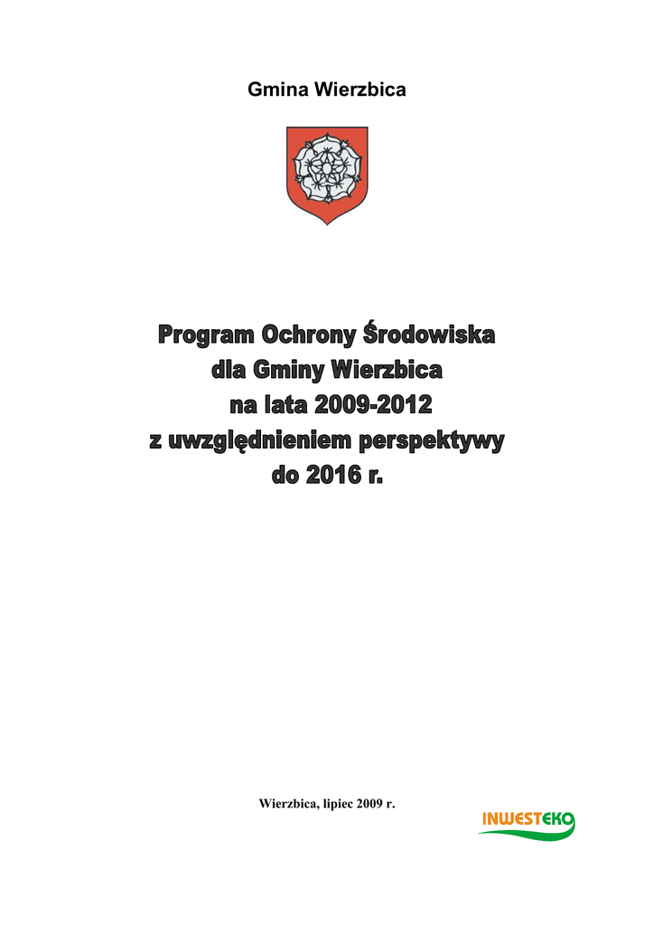 Gmina Wierzbica Wierzbica, lipiec 2009 r. Program ochrony środowiska dla Gminy Wierzbica na lata 2009-2012 z uwzględnieniem perspektywy do 2016 r. Zespół autorski: ............................................... mgr Renata Okrajewska ................................................ mgr inŜ. Wioletta Chaba ................................................ mgr Joanna Segieta 2 Program ochrony środowiska dla Gminy Wierzbica na lata 2009-2012 z uwzględnieniem perspektywy do 2016 r. SPIS TREŚCI 1. WSTĘP............................................................................................................................................................. 5 2. ZAŁOśENIA WYJŚCIOWE PROGRAMU. ............................................................................................... 6 2.1. CELE POLITYKI EKOLOGICZNEJ POWIATU RADOMSKIEGO ............................................................................. 7 3. CHARAKTERYSTYKA GMINY WIERZBICA......................................................................................... 9 3.1. POŁOśENIE GEOGRAFICZNE .......................................................................................................................... 9 3.2. SYTUACJA DEMOGRAFICZNA ........................................................................................................................ 9 3.3. SYTUACJA GOSPODARCZA .......................................................................................................................... 10 4. ZASOBY ŚRODOWISKA PRZYRODNICZEGO. ................................................................................... 12 4.1. WARUNKI KLIMATYCZNE.................................................................................................................... 12 4.2. ŚRODOWISKO PRZYRODNICZE I OCHRONA PRZYRODY......................................................................... 12 4.2.1. Lasy. ______________________________________________________________________ 12 4.2.2. Formy ochrony przyrody. ______________________________________________________ 14 4.3. POWIETRZE ATMOSFERYCZNE............................................................................................................. 16 4.4. ZASOBY WODNE I GOSPODARKA WODNO-ŚCIEKOWA. ......................................................................... 17 4.4.1. Wody powierzchniowe.________________________________________________________ 17 4.4.2. Wody podziemne._____________________________________________________________ 18 4.4.3. Gospodarka wodno-ściekowa.___________________________________________________ 19 4.5. ZASOBY SUROWCÓW MINERALNYCH. ................................................................................................. 20 4.6. GLEBY. ............................................................................................................................................... 21 4.7. EDUKACJA EKOLOGICZNA................................................................................................................... 22 4.8. WYKORZYSTANIE ENERGII ZE ŹRÓDEŁ ODNAWIALNYCH .................................................................... 24 5. ZAGROśENIA ŚRODOWISKA................................................................................................................. 26 5.1. HAŁAS I WIBRACJE.............................................................................................................................. 26 5.2. PROMIENIOWANIE ELEKTROMAGNETYCZNE ....................................................................................... 27 5.3. GOSPODARKA ODPADAMI. .................................................................................................................. 28 5.4. TERENY NARAśONE NA SUSZE I POWÓDŹ. ........................................................................................... 29 5.5. POWAśNE AWARIE PRZEMYSŁOWE I DROGOWE. ................................................................................. 30 6. ZARZĄDZANIE ŚRODOWISKIEM.......................................................................................................... 32 7. PRIORYTETY I CELE EKOLOGICZNE GMINY WIERZBICA. ........................................................ 34 8. STRATEGIA KRÓTKOTERMINOWYCH DZIAŁAŃ NA LATA 2009-2012. ..................................... 36 8.1. ZASOBY WODNE I GOSPODARKA WODNO-ŚCIEKOWA. ......................................................................... 36 8.2. POWIETRZE ATMOSFERYCZNE............................................................................................................. 36 8.3. ŚRODOWISKO PRZYRODNICZE............................................................................................................. 37 8.4. ZASOBY SUROWCÓW MINERALNYCH. ................................................................................................. 38 8.5. OGRANICZENIE HAŁASU I PROMIENIOWANIA ELEKTROMAGNETYCZNEGO. ......................................... 38 8.6. POWAśNE AWARIE PRZEMYSŁOWE I DROGOWE. ................................................................................. 38 8.7. EDUKACJA EKOLOGICZNA................................................................................................................... 38 9. STRATEGIA DŁUGOTERMINOWYCH DZIAŁAŃ DO ROKU 2016.................................................. 39 9.1. ZASOBY WODNE I GOSPODARKA WODNO-ŚCIEKOWA. ......................................................................... 39 9.2. POWIETRZE ATMOSFERYCZNE............................................................................................................. 39 9.3. ŚRODOWISKO PRZYRODNICZE............................................................................................................. 39 9.4. ZASOBY SUROWCÓW MINERALNYCH. ................................................................................................. 40 9.5. OGRANICZENIE HAŁASU I PROMIENIOWANIA ELEKTR