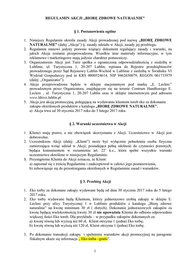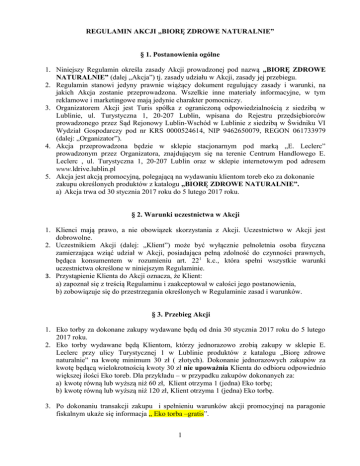 REGULAMIN AKCJI „BIORĘ ZDROWE NATURALNIE” § 1. Postanowienia ogólne 1. Niniejszy Regulamin określa zasady Akcji prowadzonej pod nazwą „BIORĘ ZDROWE NATURALNIE” (dalej „Akcja”) tj. zasady udziału w Akcji, zasady jej przebiegu. 2. Regulamin stanowi jedyny prawnie wiążący dokument regulujący zasady i warunki, na jakich Akcja zostanie przeprowadzona. Wszelkie inne materiały informacyjne, w tym reklamowe i marketingowe mają jedynie charakter pomocniczy. 3. Organizatorem Akcji jest Turis spółka z ograniczoną odpowiedzialnością z siedzibą w Lublinie, ul. Turystyczna 1, 20-207 Lublin, wpisana do Rejestru przedsiębiorców prowadzonego przez Sąd Rejonowy Lublin-Wschód w Lublinie z siedzibą w Świdniku VI Wydział Gospodarczy pod nr KRS 0000524614, NIP 9462650079, REGON 061733979 (dalej: „Organizator”). 4. Akcja przeprowadzona będzie w sklepie stacjonarnym pod marką „E. Leclerc” prowadzonym przez Organizatora, znajdującym się na terenie Centrum Handlowego E. Leclerc , ul. Turystyczna 1, 20-207 Lublin oraz w sklepie internetowym pod adresem www.ldrive.lublin.pl 5. Akcja jest akcją promocyjną, polegającą na wydawaniu klientom toreb eko za dokonanie zakupu określonych produktów z katalogu „BIORĘ ZDROWE NATURALNIE”. a) Akcja trwa od 30 stycznia 2017 roku do 5 lutego 2017 roku. § 2. Warunki uczestnictwa w Akcji 1. Klienci mają prawo, a nie obowiązek skorzystania z Akcji. Uczestnictwo w Akcji jest dobrowolne. 2. Uczestnikiem Akcji (dalej: „Klient”) może być wyłącznie pełnoletnia osoba fizyczna zamierzająca wziąć udział w Akcji, posiadająca pełną zdolność do czynności prawnych, będąca konsumentem w rozumieniu art. 221 k.c., która spełni wszystkie warunki uczestnictwa określone w niniejszym Regulaminie. 3. Przystąpienie Klienta do Akcji oznacza, że Klient: a) zapoznał się z treścią Regulaminu i zaakceptował w całości jego postanowienia, b) zobowiązuje się do przestrzegania określonych w Regulaminie zasad i warunków. § 3. Przebieg Akcji 1. Eko torby za dokonane zakupy wydawane będą od dnia 30 stycznia 2017 roku do 5 lutego 2017 roku. 2. Eko torby wydawane będą Klientom, którzy jednorazowo zrobią zakupy w sklepie E. Leclerc przy ulicy Turystycznej 1 w Lublinie produktów z katalogu „Biorę zdrowe naturalnie” na kwotę minimum 30 zł ( złotych). Dokonanie jednorazowych zakupów za kwotę będącą wielokrotnością kwoty 30 zł nie upoważnia Klienta do odbioru odpowiednio większej ilości Eko toreb. Dla przykładu – w przypadku zakupów dokonanych za: a) kwotę równą lub wyższą niż 60 zł, Klient otrzyma 1 (jedna) Eko torbę; b) kwotę równą lub wyższą niż 120 zł, Klient otrzyma 1 (jedna) Eko torbę. 3. Po dokonaniu transakcji zakupu i spełnieniu warunków akcji promocyjnej na paragonie fiskalnym ukaże się informacja „ Eko torba –gratis”. 1 4. Odbiór Eko torby odbywa się z Punkcie Obsługi Klienta za okazaniem paragonu fiskalnego z odpowiednią adnotacją. § 4. Odpowiedzialność Organizatora 1. Każdemu Klientowi biorącemu udział w Akcji przysługuje w czasie jej trwania prawo wniesienia pisemnej reklamacji w zakresie niezgodności przeprowadzenia Akcji z niniejszym Regulaminem. Reklamacje wniesione po upływie powyższego terminu nie będą rozpatrywane. Za datę wniesienia reklamacji uważa się datę stempla pocztowego na przesyłce zawierającej reklamację. 2. Reklamacje należy składać w formie pisemnej drogą pocztową na adres Organizatora z dopiskiem „Eko Torba – reklamacja”. 3. Reklamacja musi zawierać dane personalne zgłaszającego reklamację (imię, nazwisko, dokładny adres wraz z kodem pocztowym reklamującego), przyczynę reklamacji, treść żądania reklamującego oraz opis okoliczności uzasadniających reklamację, a także czytelny podpis. 4. Do składanej reklamacji należy dołączyć zgodę na przetwarzanie danych osobowych w postaci oświadczenia o treści: „Wyrażam zgodę na przetwarzanie moich danych osobowych przez Turis spółka z ograniczoną odpowiedzialnością z siedzibą w Lublinie, ul. Turystycznej 1, 20-207 Lublin, w celu wykorzystania ich dla potrzeb niezbędnych do postępowania reklamacyjnego Akcji „BIORĘ ZDROWE NATURALNIE” przeprowadzanej przez Turis spółka z o.o., w tym również w celu przekazania odpowiedzi na złożoną reklamację, zgodnie z przepisami ustawy z dnia 29 sierpnia 1997 roku o ochronie danych osobowych (tekst jednolity: Dz. U. z 2015 roku, poz. 2135)”. 5. Dane osobowe osób składających reklamację podlegają ochronie zgodnie z Ustawą z dnia 29 sierpnia 1997 r. o ochronie danych osobowych (tekst jednolity: Dz.U. z 2015 r., poz. 2135) oraz są zbierane i przetwarzane wyłącznie na potrzeby przeprowadzenia postępowania reklamacyjnego Akcji „BIORĘ ZDROWE NATURALNIE” (tj. w celu przekazania odpowiedzi na złożoną reklamację). Osobie składającej reklamację przysługuje prawo dostępu do treści swoich danych oraz ich poprawiania na warunkach określonych w Ustawie z dnia 29 sierpnia 1997 roku o ochronie danych osobowych. Podanie danych osobowych jest dobrowolne, lecz niezbędne dla potrzeb przeprowadzenia postępowania reklamacyjnego. 6. Administratorem danych osobowych osób składających reklamację jest Turis spółka z ograniczoną odpowiedzialnością z siedzibą w Lublinie, ul. Turystyczna 1, 20-207 Lublin, wpisana do Rejestru przedsiębiorców prowadzonego przez Sąd Rejonowy Lublin-Wschód w Lublinie z siedzibą w Świdniku VI Wydział Gospodarczy pod nr KRS 0000524614, NIP 9462650079, REGON 061733979. 7. Odwołanie zgody na przetwarzanie danych osobowych może zostać dokonane poprzez złożenie oświadczenia woli zawierającego cofnięcie zgody na adres: Turis spółka z ograniczoną odpowiedzialnością z siedzibą w Lublinie, ul. Turystyczna 1, 20-207 Lublin wraz z imieniem i nazwiskiem osoby składającej reklamację. Wniosek o usunięcie danych osobowych osoby składa