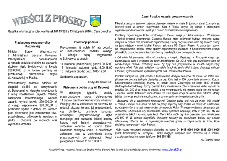Czarni Piasek w kryzysie, proszą o wsparcie Gazetka informacyjna sołectwa Piasek NR 19/328 z 13 listopada 2016 r. Cena dowolna Piłkarska drużyna seniorów zajmuje pierwsze miejsce w klasie B, juniorzy starsi Czarnych są liderami tabeli w swoich rozgrywkach. Klub z Piasku boryka się jednak z problemami organizacyjno-finansowymi i apeluje o pomoc do mieszkańców miejscowości. Problemy organizacyjne klubu sportowego z Piasku trwają już kilka miesięcy. W sierpniu z funkcji prezesa zrezygnował Grzegorz Ryguła, który poświęcał klubowi mnóstwo czasu i trzymał w ryzach całą działalność organizacyjną. Do tej pory nie udało nam się znaleźć osoby Informacja podatek Przebudowa rowu przy ulicy na jego miejsce - mówi Michał Pawlak, sekretarz KS Czarni Piasek. A pracy jest sporo. Katowickiej Przypominam, iż wpłaty IV raty podatku Od przygotowania boiska, przez sprawy organizacyjne związane z funkcjonowaniem drużyn Minister Spraw Wewnętrznych od nieruchomości, podatku rolnego piłkarskich, po zachęcenie mieszkańców czy przedsiębiorców do wsparcia klubu. i Administracji przyznał Powiatowi Pszczyńskiemu dofinansowanie w ramach podziału środków na usuwanie skutków klęsk żywiołowych, w kwocie 280.000,00 zł, w formie promesy na przebudowę odwodnienia części ul. Katowickiej w Piasku. Przebudowany zostanie odcinek na długości ok.189 od skrzyżowania ul. Słonecznej w kierunku skrzyżowania z ulicą Powstańców Śląskich. Według kosztorysu inwestorskiego, wartość zadania wynosi prawie 350.000,00 zł. Z czego wspomniane 280.000,00 zł pochodzić będzie z dotacji. W ramach prac planowane jest zarurowanie rowu przydrożnego, odtworzenie nawierzchni jezdni i chodnika po robotach oraz wykonanie drenażu. i leśnego będą w Sołtysówce w dniach: przyjmowane - Od wielu lat pieniądze, które otrzymujemy z Urzędu Miejskiego w Pszczynie mogą być przeznaczane tylko i wyłącznie na sport młodzieżowy. Od 2013 roku, gdy przejęliśmy klub od 14 listopada (poniedziałek) godz.9.00-12.00 poprzedniego zarządu zrobiliśmy wiele, by były one pożytkowane w sposób przynoszący 15 listopada (wtorek) godz.15.00-18.00 wymierny efekt. Taki efekt widzimy - po wielu latach do seniorskiej drużyny dołączają chłopcy z Piasku, wychowankowie wyszkoleni przez nas - mówi Michał Pawlak. 16 listopada (środa) godz. 9.00-12.00 Serdecznie zapraszam. Sołtys Barbara Psik Pielęgnacja dębów przy Al. Dębowej Problem zaczyna się, jeśli chodzi o finansowanie drużyny seniorów. W Piasku od 2013 roku piłkarze nie dostają żadnych pieniędzy za grę. Klub jest w 100 procentach amatorski. Koszty funkcjonowania seniorskiej drużyny są jednak spore. Zaczynając od około 1500 zł opłat startowych dla Podokręgu Tychy, poprzez kary finansowe za żółte i czerwone kartki, wydatki na sędziów (ok. 250 zł za mecz u siebie), a na wynagrodzeniu dla trenera wcale się nie kończy - wylicza Pawlak. Sekretarz klubu dodaje, że i tak sporo wzięli na siebie sami piłkarze, którzy jeżdżą na mecze swoimi samochodami, a po meczach sami organizują sobie grilla. - Borykamy się z problemami finansowymi. Obecnie wciąż jest nas za mało, jeśli chodzi o zarząd. Brakuje nam osób nie tyle do pracy fizycznej przy boisku, co raczej do nakłonienia przedsiębiorców z naszej miejscowości do wsparcia klubu. W miejscowościach ościennych, jak Jankowice, Studzienice czy Rudołtowice, kluby sportowe wspierają firmy z tych wsi. My nie oczekujemy jakichś kosmicznych kwot. Niech kilka osób czy firm przekaże nam miesięcznie 200-500 zł. W zamian oczywiście oferujemy reklamy na koszulkach, boisku czy stronie internetowej. Wierzę, że w największym sołectwie gminy Pszczyna także są firmy, które chciałyby nam pomóc - mówi Pawlak. W minionym tygodniu zostały przeprowadzone prace pielęgnacyjne 11 dębów przy Pomniku Przyrody w Piasku. Polegały one w zależności od potrzeby na redukcji ciężaru korony, jej prześwietleniu czy obniżeniu, usunięciu posuszu, odsłonięciu przyszłościowego dęba rosnącego pod drzewem, lekkiej korekty korony nad liniami energetycznymi, skróceniu konarów od strony torów. Dokonano zabiegów ściśle z określonym Klub można wesprzeć wpłacając pieniądze na konto 04 8448 0004 0000 1528 2001 0005 zakresem prac w zestawieniu drzew (Bank Spółdzielczy w Pszczynie). Osoby mogące wesprzeć klub proszone są o kontakt przeznaczonych do pielęgnacji. Koszt z działaczami pod numerem telefonu - 665 578 385. KS Czarni Piasek pielęgnacji 1 drzewa to ok. 1.000 zł. Nakład 500 egz., redagują: Agnieszka Gniełka-Helios, Barbara Psik (e-mail: [email protected], strona internetowa: www.piasek24.pl Wieści z przedszkola… Z końcem października sprzyjająca pogoda pozwoliła przedszkolakom (z pomocą Pana Janusza) cieszyć się smakiem pieczonego ziemniaka w skorupce. Umorusane buziaki zdradzały ogromne zadowolenie z ziemniaczanych smakołyków. Ogromną niespodzianką, a zarazem świetną zabawą był czworonożny gość, który odwiedził nasze przedszkole. Pani Sylwia wraz ze swoim psem terapeutycznym – Ateną, uwrażliwiała dzieci na właściwe ich traktowanie i bezpieczne zachowanie się wobec obcych psów. Zapoznała także z rolą psa terapeutycznego. Każdy przedszkolak mógł wytarmosić cierpliwego i kudłatego labradora. W piękną, słoneczną pogodę grupy starsze z naszego przedszkola udały się do Nadleśnictwa. Pani Leśniczy dostarczyła dzieciom informacji o swojej pracy, o miejscu, w którym się znajdowali poprzez zwiedzanie budynku, o życiu leśnych zwierząt puszczając film edukacyjny. Następnie spacer po lesie pozwolił dzieciom utrwalić gatunki znanych drzew i poznać nowe, a nawet podejrzeć sarny w swoim naturalnym środowisku. Dużym zainteresowaniem cieszył się wśród dzieci sposób przetwarzania pociętych gałęzi, drzew, jego obróbkę oraz sadzenie nowych drzewek – sadzonek, aby powstał młodni