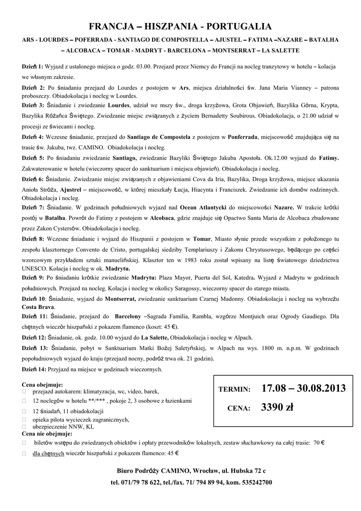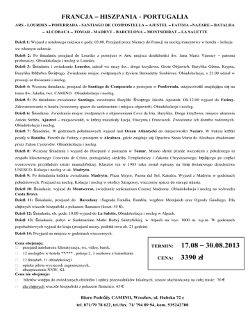 FRANCJA – HISZPANIA - PORTUGALIA ARS - LOURDES – POFERRADA - SANTIAGO DE COMPOSTELLA – AJUSTEL – FATIMA –NAZARE – BATALHA – ALCOBACA – TOMAR - MADRYT - BARCELONA – MONTSERRAT – LA SALETTE Dzień ń 1: Wyjazd z ustalonego miejsca o godz. 03.00. Przejazd przez Niemcy do Francji na nocleg tranzytowy w hotelu – kolacja we własnym zakresie. Dzień ń 2: Po śniadaniu przejazd do Lourdes z postojem w Ars, miejsca działalności św. Jana Maria Vianney – patrona proboszczy. Obiadokolacja i nocleg w Lourdes. Dzień ń 3: Śniadanie i zwiedzanie Lourdes, udział we mszy św., droga krzyżowa, Grota Objawień, Bazylika Górna, Krypta, Bazylika Różańca Świętego. Zwiedzanie miejsc związanych z życiem Bernadetty Soubirous. Obiadokolacja, o 21.00 udział w procesji ze świecami i nocleg. Dzień ń 4: Wczesne śniadanie, przejazd do Santiago de Compostela z postojem w Ponferrada, miejscowość znajdująca się na trasie św. Jakuba, twz. CAMINO. Obiadokolacja i nocleg. Dzień ń 5: Po śniadaniu zwiedzanie Santiago, zwiedzanie Bazyliki Świętego Jakuba Apostoła. Ok.12.00 wyjazd do Fatimy. Zakwaterowanie w hotelu (wieczorny spacer do sanktuarium i miejsca objawień). Obiadokolacja i nocleg. Dzień ń 6: Śniadanie. Zwiedzanie miejsc związanych z objawieniami Cova da Iria, Bazylika, Droga krzyżowa, miejsce ukazania Anioła Stróża, Ajustrel – miejscowość, w której mieszkały Łucja, Hiacynta i Franciszek. Zwiedzanie ich domów rodzinnych. Obiadokolacja i nocleg. Dzień ń 7: Śniadanie. W godzinach południowych wyjazd nad Ocean Atlantycki do miejscowości Nazare. W trakcie krótki postój w Batalha. Powrót do Fatimy z postojem w Alcobaca, gdzie znajduje się Opactwo Santa Maria de Alcobaca zbudowane przez Zakon Cystersów. Obiadokolacja i nocleg. Dzień ń 8: Wczesne śniadanie i wyjazd do Hiszpanii z postojem w Tomar, Miasto słynie przede wszystkim z położonego tu zespołu klasztornego Convento de Cristo, portugalskej siedziby Templariuszy i Zakonu Chrystusowego, będącego po części wzorcowym przykładem sztuki manuelińskiej. Klasztor ten w 1983 roku został wpisany na listę światowego dziedzictwa UNESCO. Kolacja i nocleg w ok. Madrytu. Dzień ń 9: Po śniadaniu krótkie zwiedzanie Madrytu: Plaza Mayor, Puerta del Sol, Katedra. Wyjazd z Madrytu w godzinach południowych. Przejazd na nocleg. Kolacja i nocleg w okolicy Saragossy, wieczorny spacer do starego miasta. Dzień ń 10: Śniadanie, wyjazd do Montserrat, zwiedzanie sanktuarium Czarnej Madonny. Obiadokolacja i nocleg na wybrzeżu Costa Brava. Dzień ń 11: Śniadanie, przejazd do Barcelony –Sagrada Familia, Rambla, wzgórze Montjuich oraz Ogrody Gaudiego. Dla chętnych wieczór hiszpański z pokazem flamenco (koszt: 45 €). Dzień ń 12: Śniadanie, ok. godz. 10.00 wyjazd do La Salette, Obiadokolacja i nocleg w Alpach. Dzień ń 13: Śniadanie, pobyt w Sanktuarium Matki Bożej Saletyńskiej, w Alpach na wys. 1800 m. n.p.m. W godzinach popołudniowych wyjazd do kraju (przejazd nocny, podróż trwa ok. 21 godzin). Dzień ń 14: Przyjazd na miejsce w godzinach wieczornych. Cena obejmuje: przejazd autokarem: klimatyzacja, wc, video, barek, TERMIN: 12 noclegów w hotelu **/*** , pokoje 2, 3 osobowe z łazienkami 12 śniadań, 11 obiadokolacji opieka pilota wycieczek zagranicznych, ubezpieczenie NNW, KL Cena nie obejmuje: CENA: 17.08 – 30.08.2013 3390 złł biletów wstępu do zwiedzanych obiektów i opłaty przewodników lokalnych, zestaw słuchawkowy na całej trasie: 70 € dla chętnych wieczór hiszpański z pokazem flamenco: 45 € Biuro Podróż óży óż CAMINO, Wrocłław, ul. Hubska 72 c tel. 071/79 78 622, tel./fax. 71/ 794 89 94, kom. 535242700