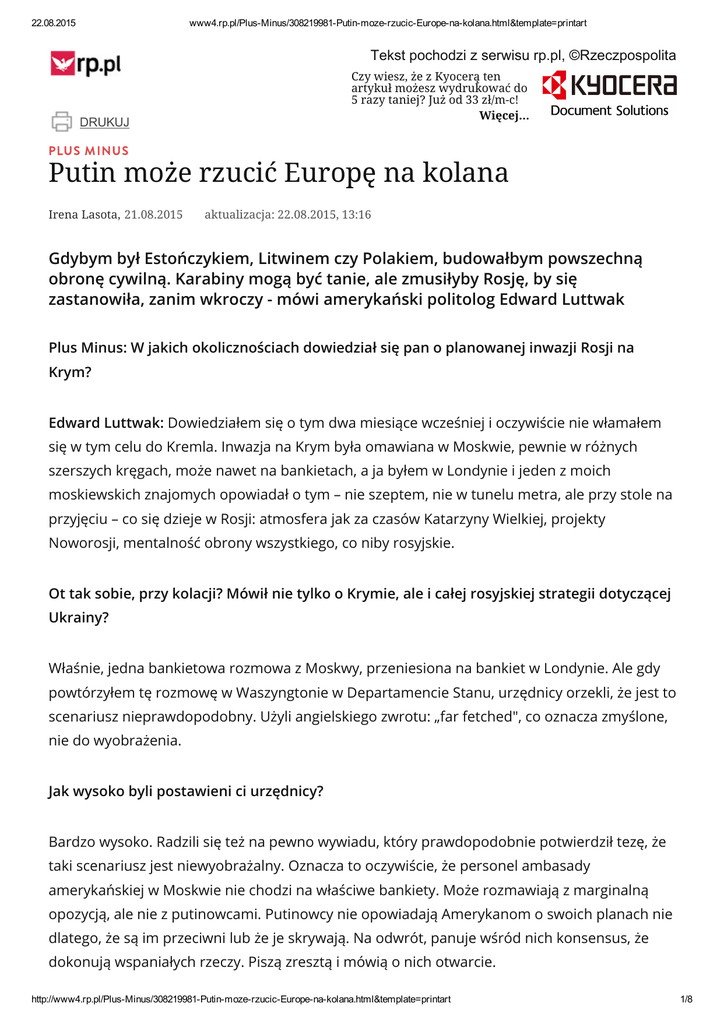 22.08.2015 www4.rp.pl/PlusMinus/308219981PutinmozerzucicEuropenakolana.html&template=printart Tekst pochodzi z serwisu rp.pl, ©Rzeczpospolita Czy wiesz, że z Kyocerą ten artykuł możesz wydrukować do 5 razy taniej? Już od 33 zł/m-c! Więcej… DRUKUJ PLUS MINUS Putin może rzucić Europę na kolana Irena Lasota, 21.08.2015 aktualizacja: 22.08.2015, 13:16 Gdybym był Estończykiem, Litwinem czy Polakiem, budowałbym powszechną obronę cywilną. Karabiny mogą być tanie, ale zmusiłyby Rosję, by się zastanowiła, zanim wkroczy - mówi amerykański politolog Edward Luttwak Plus Minus: W jakich okolicznościach dowiedział się pan o planowanej inwazji Rosji na Krym? Edward Luttwak: Dowiedziałem się o tym dwa miesiące wcześniej i oczywiście nie włamałem się w tym celu do Kremla. Inwazja na Krym była omawiana w Moskwie, pewnie w różnych szerszych kręgach, może nawet na bankietach, a ja byłem w Londynie i jeden z moich moskiewskich znajomych opowiadał o tym – nie szeptem, nie w tunelu metra, ale przy stole na przyjęciu – co się dzieje w Rosji: atmosfera jak za czasów Katarzyny Wielkiej, projekty Noworosji, mentalność obrony wszystkiego, co niby rosyjskie. Ot tak sobie, przy kolacji? Mówił nie tylko o Krymie, ale i całej rosyjskiej strategii dotyczącej Ukrainy? Właśnie, jedna bankietowa rozmowa z Moskwy, przeniesiona na bankiet w Londynie. Ale gdy powtórzyłem tę rozmowę w Waszyngtonie w Departamencie Stanu, urzędnicy orzekli, że jest to scenariusz nieprawdopodobny. Użyli angielskiego zwrotu: „far fetched", co oznacza zmyślone, nie do wyobrażenia. Jak wysoko byli postawieni ci urzędnicy? Bardzo wysoko. Radzili się też na pewno wywiadu, który prawdopodobnie potwierdził tezę, że taki scenariusz jest niewyobrażalny. Oznacza to oczywiście, że personel ambasady amerykańskiej w Moskwie nie chodzi na właściwe bankiety. Może rozmawiają z marginalną opozycją, ale nie z putinowcami. Putinowcy nie opowiadają Amerykanom o swoich planach nie dlatego, że są im przeciwni lub że je skrywają. Na odwrót, panuje wśród nich konsensus, że dokonują wspaniałych rzeczy. Piszą zresztą i mówią o nich otwarcie. http://www4.rp.pl/PlusMinus/308219981PutinmozerzucicEuropenakolana.html&template=printart 1/8 22.08.2015 www4.rp.pl/PlusMinus/308219981PutinmozerzucicEuropenakolana.html&template=printart Ten rosyjski dżentelmen, z którym rozmawiał pan w Londynie, większy nacisk kładł na terytorialne apetyty Rosji czy na zagrożenie płynące z Ukrainy, z Majdanu...? Nie pamiętam żadnych wzmianek o przyczynach kroków Rosji. Akcent był położony na to, że Rosja nie zamierza już tracić żadnych swoich terytoriów ani wpływów. Jasno zadeklarowała swoją politykę. Zamierza odzyskać utracone części Rosji i dawne wpływy. Nie było mowy o polityce Kijowa, bo polityka Kijowa ma znaczenie tylko jako pretekst, by zrobić to, co tak czy owak Rosja chce zrobić. Nie jest tak, że ktoś siedzi sobie w Moskwie, wącha kwiatki i nagle z tego błogiego stanu wybija go wiadomość o faszystowskich prowokacjach w Kijowie. Rosja nie przyjmuje do wiadomości, że Białoruś nie należy do Rosji, że większa część Ukrainy jest od niej odseparowana. Dla nich Lwów nie jest wprawdzie rosyjski, bo tam są unici i te terytoria nigdy nie należały do Rosji, a tylko przez jakiś czas do Związku Sowieckiego, ale już brak wschodniej Ukrainy jest nie do zaakceptowania. Więc Białoruś też była wymieniana? Jak najbardziej. Naprawdę musimy wierzyć, że przesłanie Putina do Rosjan jest koherentne. Było to wyraźnie widoczne po wprowadzeniu sankcji. Putin mówi: „My, Rosjanie, nie będziemy nigdy tacy eleganccy jak Francuzi, nie będziemy tak dobrze jadać jak Włosi ani nie będziemy tak bogaci jak Amerykanie, ale jesteśmy wielkim imperium, najpotężniejszym państwem, jakie kiedykolwiek istniało. A ja jestem Putin, ze mną Rosja nic nie straci, a nawet coś odzyska". Rosjanie cieszą się, że mają silne państwo. Sankcje mało ich obchodzą, nie płaczą z ich powodu – tyle lat żyliśmy bez luksusów, więc dalej możemy bez nich pożyć. Krym jest dużo lepszy i ważniejszy niż luksusy. Może pański rozmówca z Londynu mówił o planowanym ataku na Krym po to, by ktoś mógł temu zapobiec? Nie, ten człowiek nie był entuzjastą aneksji Krymu, ale nie był też jej przeciwnikiem. Mieszka w Moskwie, obraca się w kręgu takich samych ludzi jak on. Nie jest opozycjonistą, ale też w Rosji tak naprawdę nie ma opozycji. Rosjanie popierają Putina, z zastrzeżeniami czy bez, ale popierają. Politycy zachodni od zawsze starają się racjonalizować politykę Rosji... No właśnie, politycy amerykańscy, łącznie z tymi, z którymi rozmawiałem w Departamencie Stanu, doszukują się logiki w postępowaniu Rosji, ale jej nie znajdują, bo jest to logika imperialna, a Amerykanie jej nie rozumieją. Amerykę niesłusznie oskarża się o imperializm. http://www4.rp.pl/PlusMinus/308219981PutinmozerzucicEuropenakolana.html&template=printart 2/8 22.08.2015 www4.rp.pl/PlusMinus/308219981PutinmozerzucicEuropenakolana.html&template=printart Gdy wycofywaliśmy się z Iraku, nikt nie mówił, że straciliśmy Irak, przeciwnie, wszyscy byli zadowoleni. Ameryka stara się wycofać z Bliskiego Wschodu, a i z pobytu w Europie nie jest zachwycona. Amerykanie po prostu nie rozumieją myślenia imperialnego i dlatego nie rozumieją Rosji. Rosyjska mentalność jest wykuta z przeszłego, obecnego i przyszłego imperializmu. Już tylko Chiny i Rosja przejawiają mentalność imperialistyczną. Gdyby dziś pojawił się w Moskwie obywatel Cesarstwa Rzymskiego, od razu poczułby się jak u siebie w domu. Ale Amerykanie, Polacy czy Francuzi tego nie rozumieją. Gdyby odwiedzili starożytny Rzym, zaczęliby się pytać: „O co wam chodzi? Macie takie piękne miasto, umiarkowany klimat, kawiarnie, łaźnie – po co posyłacie swoje legiony do upalnej Afryki c