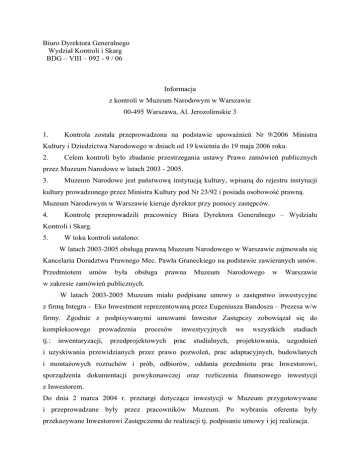 Biuro Dyrektora Generalnego Wydział Kontroli i Skarg BDG – VIII – 092 - 9 / 06 Informacja z kontroli w Muzeum Narodowym w Warszawie 00-495 Warszawa, Al. Jerozolimskie 3 1. Kontrola została przeprowadzona na podstawie upoważnień Nr 9/2006 Ministra Kultury i Dziedzictwa Narodowego w dniach od 19 kwietnia do 19 maja 2006 roku. 2. Celem kontroli było zbadanie przestrzegania ustawy Prawo zamówień publicznych przez Muzeum Narodowe w latach 2003 - 2005. 3. Muzeum Narodowe jest państwową instytucją kultury, wpisaną do rejestru instytucji kultury prowadzonego przez Ministra Kultury pod Nr 23/92 i posiada osobowość prawną. Muzeum Narodowym w Warszawie kieruje dyrektor przy pomocy zastępców. 4. Kontrolę przeprowadzili pracownicy Biura Dyrektora Generalnego – Wydziału Kontroli i Skarg. 5. W toku kontroli ustalono: W latach 2003-2005 obsługą prawną Muzeum Narodowego w Warszawie zajmowała się Kancelaria Doradztwa Prawnego Mec. Pawła Graneckiego na podstawie zawieranych umów. Przedmiotem umów była obsługa prawna Muzeum Narodowego w Warszawie w zakresie zamówień publicznych. W latach 2003-2005 Muzeum miało podpisane umowy o zastępstwo inwestycyjne z firmą Integra - Eko Inwestment reprezentowaną przez Eugeniusza Bandosza – Prezesa w/w firmy. Zgodnie z podpisywanymi umowami Inwestor Zastępczy zobowiązał się do kompleksowego tj.: prowadzenia inwentaryzacji, procesów przedprojektowych inwestycyjnych prac studialnych, we wszystkich projektowania, stadiach uzgodnień i uzyskiwania przewidzianych przez prawo pozwoleń, prac adaptacyjnych, budowlanych i montażowych rozruchów i prób, odbiorów, oddania przedmiotu prac Inwestorowi, sporządzenia dokumentacji powykonawczej oraz rozliczenia finansowego inwestycji z Inwestorem. Do dnia 2 marca 2004 r. przetargi dotyczące inwestycji w Muzeum przygotowywane i przeprowadzane były przez pracowników Muzeum. Po wybraniu oferenta były przekazywane Inwestorowi Zastępczemu do realizacji tj. podpisanie umowy i jej realizacja. Wynagrodzenie dla Inwestora Zastępczego określane było 2.5% od wartości inwestycji, bez podania podstawy określenia tej wartości. Ustalanie procentowe wartości wynagrodzenia jest niezgodne z art. 91 ust. 2 ustawy z dn. 29 stycznia 2004 r. Prawo zamówień publicznych, a tym samym stanowi naruszenie art. 17 ust 1 pkt. 4 ustawy z dnia 17 grudnia 2004 r. o odpowiedzialności za naruszenie dyscypliny finansów publicznych (Dz. U. z dnia 25.01.2005 r.). W związku ze zmianą ustawy po dniu 2 marca 2004 r. firma Integra - Eko Inwestment zajmuje się również przygotowaniem projektów materiałów dotyczących realizacji zamówień publicznych, związanych z inwestycjami w Muzeum oraz przeprowadza postępowania o zamówienia publiczne dot. Inwestycji na rzecz i w imieniu Muzeum. Przy udziale i przez Inwestora Zastępczego – Firmę Integra – Eko Inwestment reprezentowaną przez pana Eugeniusza Bandosza przeprowadzono w: 2003 r. - 46 postępowań o zamówienie publiczne na łączną kwotę 5 403 714,23 zł, 2004 r. – 19 postępowań o zamówienie publiczne na łączną kwotę 2 975 270,33 zł, 2005 r. – 24 postępowania o zamówienie publiczne na łączną kwotę 6 436 421,57 zł. Pracownicy Muzeum Narodowego w Warszawie przeprowadzili w: 2003 r. - 18 postępowań o zamówienie publiczne na łączną kwotę 1 200 855,67 zł, 2004 r. – 30 postępowań o zamówienie publiczne na łączną kwotę 8 894 614,18 zł, 2005 r. – 30 postępowań o zamówienie publiczne na łączną kwotę 1 728 003,63 zł. Z ustaleń kontroli wynika, że pan Eugeniusz Bandosz – Inwestor Zastępczy – działający w imieniu i na rzecz Muzeum Narodowego (Zamawiający) posiada 100% udziałów w firmie Polwar Inwestycje Sp. z o o. Firma ta wyłaniana była w drodze przetargów jako wykonawca wielu zadań inwestycyjnych realizowanych w Muzeum Narodowym w Warszawie. W związku z powyższym pan E. Bandosz – Inwestor Zastępczy był jednocześnie i Zamawiającym i jako właściciel firmy Polwar Inwestycje Wykonawcą. Powyższe działania stanowią naruszenie art. 17 ust 1 pkt.1 i pkt. 4 ustawy z dn. 29 stycznia 2004 r. Prawo zamówień publicznych. Stanowią również naruszenie art. 17 ust 5 ustawy z dnia 17 grudnia 2004 r. o odpowiedzialności za naruszenie dyscypliny finansów publicznych (Dz. U. z dnia 25.01.2005 r.). W wyniku kontroli ustalono, że Muzeum Narodowe w Warszawie przygotowując postępowania o zamówienie publiczne nie dopełniało czynności jakie określała ustawa o zamówieniach publicznych z dn. 10 czerwca 1994 r. i ustawa Prawo zamówień publicznych z dn. 29 stycznia 2004 r. 2 W dwóch postępowaniach o zamówienie publiczne umowy były zawierane w innym terminie niż zostało to określone w Specyfikacji Istotnych Warunków Zamówienia, co stanowi naruszenie art. 140 ust 2 ustawy z dn. 29 stycznia 2004 r. Prawo Zamówień Publicznych, a tym samym naruszenie art. 17 ust 1 pkt. 4 ustawy z dnia 17 grudnia 2004 r. o odpowiedzialności za naruszenie dyscypliny finansów publicznych (Dz. U. z dnia 25.01.2005 r.). Ogłoszenia o przetargach jak również Specyfikacje Istotnych Warunków Zamówienia nie zawierały daty sporządzenia i podpisów osób upoważnionych. W dokumentacji przetargowej brakowało oświadczeń Członków Komisji o niewykluczeniu z postępowania w trybie art. 20 uzp., co stanowi naruszenie ustawy z dn. 10 czerwca 1994 r. o zamówieniach publicznych i art. 17 ustawy z 29.01.2004 r. Prawo zamówień publicznych. Brak oświadczenia Członka Komisji jest również naruszeniem art. 17 ust. 4 ustawy z dnia 17 grudnia 2004 r. o odpowiedzialności za naruszenie dyscypliny finansów publicznych (Dz. U. z dnia 25.01.2005 r.). Stwierdzono także, że w kilku przetargach nie było formalnego wniosku o wszczęcie procedury o udzielenie zamówienia publicznego wg wzoru określonego w załączniku nr 2 Zarządzenia nr 15/2002 Dyrektora Muzeum Narodowego z 29.08.2002 r. w sprawie ustalenia zasa