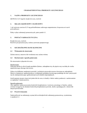 CHARAKTERYSTYKA PRODUKTU LECZNICZEGO 1. NAZWA PRODUKTU LECZNICZEGO QUINAX, 0,15 mg/ml, krople do oczu, roztwór 2. SKŁAD JAKOŚCIOWY I ILOŚCIOWY 1 ml roztworu zawiera 0,15 mg polisulfonianu sodowego azapentacenu (Azapentaceni natrii polysulfonas). Pełny wykaz substancji pomocniczych, patrz punkt 6.1. 3. POSTAĆ FARMACEUTYCZNA Krople do oczu, roztwór. Roztwór jest przezroczysty, koloru czerwono-purpurowego. 4. SZCZEGÓŁOWE DANE KLINICZNE 4.1 Wskazania do stosowania Zaćma starcza, urazowa lub wrodzona oraz zaćma wtórna. 4.2 Dawkowanie i sposób podawania Do stosowania wyłącznie do oczu. Dawkowanie Zalecana dawka to dwie krople produktu Quinax, zakraplana trzy do pięciu razy na dobę do worka spojówkowego chorego oka (oczu). Zaleca się delikatne zamknięcie powieki i uciśnięcie przewodu nosowo-łzowego po zakropleniu. Może to zmniejszyć ogólnoustrojowe wchłanianie produktu leczniczego podanego do oka i przyczynić się do zmniejszenia jego ogólnoustrojowych działań niepożądanych. Jeżeli pacjent stosuje więcej niż jeden lek do oczu, to każdy z leków należy podawać z zachowaniem co najmniej 5 minut przerwy. Sposób podawania Aby zapobiec zanieczyszczeniu końcówki kroplomierza i roztworu zawartego w butelce, należy zwrócić uwagę by nie dotykać końcówką kroplomierza powiek, okolic sąsiadujących z okiem lub innych powierzchni. 4.3 Przeciwwskazania Nadwrażliwość na substancję czynną lub na którąkolwiek substancję pomocniczą, wymienioną w punkcie 6.1. 1 4.4 Specjalne ostrzeżenia i środki ostrożności dotyczące stosowania Do stosowania wyłącznie do oczu. Produkt Quinax zawiera, jako środek konserwujący tiomersal (organiczny związek rtęci), który może powodować reakcje nadwrażliwości. Zawiera także, jako środki konserwujące, parahydroksybenzoesan metylu i parahydroksybenzoesan propylu, które również mogą wywoływać reakcje nadwrażliwości (prawdopodobnie opóźnione). Pacjenci używający soczewek kontaktowych powinni zdjąć je przed podaniem produktu Quinax, a po zakropleniu odczekać co najmniej 15 minut przed ich ponownym założeniem. 4.5 Interakcje z innymi produktami leczniczymi i inne rodzaje interakcji Nie opisano żadnych klinicznie istotnych interakcji. Nie przeprowadzono badań dotyczących interakcji. Jeśli pacjent stosuje jednocześnie inne krople lub maści podawane do oczu, należy zachować co najmniej 5 minut przerwy pomiędzy podaniami kolejnych leków. Maści do oczu należy stosować na końcu. 4.6 Wpływ na płodność, ciążę i laktację Ciąża Brak jest danych lub istnieją jedynie ograniczone dane na temat stosowania azapentacenu miejscowo do oka u kobiet w ciąży. Karmienie piersią Nie jest wiadomo, czy azapentacen lub jego metabolity wydzielane są do mleka ludzkiego po miejscowym podaniu do oka, jednak nie można wykluczyć ryzyka dla dzieci karmionych piersią. Nie prowadzono kontrolowanych badań klinicznych u kobiet w ciąży lub karmiących piersią. Należy zachować ostrożność w przypadku przepisywania leku kobietom w ciąży lub karmiącym piersią. Płodność Nie przeprowadzono badań pozwalających na ocenę wpływu azapentacenu podanego miejscowo do oka na płodność. 4.7 Wpływ na zdolność prowadzenia pojazdów i obsługiwania maszyn Produkt Quinax nie ma wpływu lub wywiera nieistotny wpływ na zdolność prowadzenia pojazdów i obsługiwania maszyn. Przemijające niewyraźne widzenie lub inne zaburzenia widzenia występujące po zakropleniu mogą wpływać na zdolność prowadzenia pojazdów i obsługiwania maszyn. Jeżeli po zakropleniu wystąpi niewyraźne widzenie, pacjent przed rozpoczęciem jazdy lub obsługi maszyny musi zaczekać do momentu powrotu ostrości widzenia. 2 4.8 Działania niepożądane W okresie po wprowadzeniu do obrotu zidentyfikowano poniższe działania niepożądane. Częstości ich występowania nie można oszacować na podstawie dostępnych danych. Klasyfikacja układów i narządów Zaburzenia oka Preferowany termin wg MedDRA (wersja 14.1) Ból oka, podrażnienie oka, wzmożone łzawienie, przekrwienie oka Ten produkt zawiera, jako środek konserwujący tiomersal (organiczny związek rtęci) oraz parahydroksybenoesany, które mogą wywoływać reakcje nadwrażliwości (patrz punkt 4.4). Zgłaszanie podejrzewanych działań niepożądanych Po dopuszczeniu produktu leczniczego do obrotu istotne jest zgłaszanie podejrzewanych działań niepożądanych. Umożliwia to nieprzerwane monitorowanie stosunku korzyści do ryzyka stosowania produktu leczniczego. Osoby należące do fachowego personelu medycznego powinny zgłaszać wszelkie podejrzewane działania niepożądane za pośrednictwem Departamentu Monitorowania Niepożądanych Działań Produktów Leczniczych Urzędu Rejestracji Produktów Leczniczych, Wyrobów Medycznych i Produktów Biobójczych Departamentu Monitorowania Niepożądanych Działań Produktów Leczniczych Urzędu Rejestracji Produktów Leczniczych, Wyrobów Medycznych i Produktów Biobójczych, Al. Jerozolimskie 181C, 02-222 Warszawa, tel.: + 48 22 49 21 301 faks: + 48 22 49 21 309, email: [email protected]. 4.9 Przedawkowanie Nie opisano żadnego przypadku przedawkowania. W przypadku miejscowego przedawkowania należy przepłukać oko (oczy) letnią wodą. 5. WŁAŚCIWOŚCI FARMAKOLOGICZNE 5.1 Właściwości farmakodynamiczne Grupa farmakoterapeutyczna: inne leki okulistyczne, Kod ATC: S01XN01 Z teorii chinonowej dotyczącej patogenezy zaćmy wynika, że grupy SH rozpuszczalnych białek występujących w soczewkach oka są rozkładane i utleniane przez substancję typu chinonu powstającą w wyniku nieprawidłowego metabolizmu aminokwasów aromatycznych, takich jak tryptofan i tyrozyna. Polisulfonian sodowy azapentacenu ma silne powinowactwo do grup SH rozpuszczalnych białek i hamuje działanie substancji typu chinonowego na białka zawarte w krystalicznych soczewkach. Stwierdzono także, że aktywuje on działanie enzymu pr