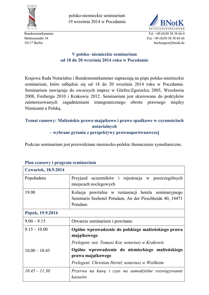 polsko-niemieckie seminarium 19 września 2014 w Poczdamie Bundesnotarkammer Mohrenstraße 34 10117 Berlin Tel. +49 (0)30 38 38 66 0 Fax +49 (0)30 38 38 66 66 [email protected] V polsko- niemieckie seminarium od 18 do 20 września 2014 roku w Poczdamie Krajowa Rada Notarialna i Bundesnotarkammer zapraszają na piąte polsko-niemieckie seminarium, które odbędzie się od 18 do 20 września 2014 roku w Poczdamie. Seminarium nawiązuje do owocnych imprez w Görlitz/Zgorzelcu 2005, Wrocławiu 2008, Freibergu 2010 i Krakowie 2012. Seminarium jest skierowane do praktyków zainteresowanych zagadnieniami transgranicznego obrotu prawnego między Niemcami a Polską. Temat ramowy: Małżeńskie prawo majątkowo i prawo spadkowe w czynnościach notarialnych – wybrane pytania z perspektywy prawnoporównawczej Podczas seminarium jest przewidziane niemiecko-polskie tłumaczenie symultaniczne. Plan czasowy i program seminarium Czwartek, 18.9.2014 Popołudniu Przyjazd uczestników i rejestracja w poszczególnych miejscach noclegowych 19.00 Kolacja powitalna w restauracji hotelu seminaryjnego Seminaris Seehotel Potsdam, An der Pirschheide 40, 14471 Potsdam Piątek, 19.9.2014 9.00 – 9.15 Otwarcie seminarium i powitanie 9.15 – 10.00 Ogólne wprowadzenie do polskiego małżeńskiego prawa majątkowego Prelegent: not. Tomasz Kot, notariusz w Krakowie 10.00 – 10.45 Ogólne wprowadzenie do niemieckiego małżeńskiego prawa majątkowego Prelegent: Christian Hertel, notariusz w Weilheim 10.45 – 11.30 Przerwa na kawę i czas na samodzielne rozwiązywanie kazusów -2- 11.30 – 12.15 Omówienie wpływu małżeńskiego prawa majątkowego (Rozwiązanie kazusów za pomocą praktycznych kazusów dotyczących nabycia i z punktu widzenia zbycia nieruchomości i prawa spółek polskiego) Podium (ze strony polskiej): not. Tomasz Kot, notariusz w Krakowie 12:15 – 13.00 (Rozwiązanie kazusów Podium (ze strony niemieckiej): Christian Hertel, Thomas z punktu widzenia Woinar niemieckiego) 13.00 – 14.15 Obiad dla uczestników seminarium 14.15 – 15.15 Wybrane zagadnienia prawa spadkowego: - Udziały w spółce w przypadku śmierci spadkodawcy Prelegent(pol.): not. Sławomir Łakomy, notariusz w Murowanej Goślinie Prelegent(niem.): Thomas Woinar, notariusz we Frankfurcie nad Odrą - Prawo do zachowku Prelegent (pol.): not. Marek Sawicki, notariusz w Olecku Prelegent (niem.): Tino Welsch, asesor notarialny - Odrzucenie spadku Prelegent (pol.): not. Sławomir Łakomy, notariusz w Murowanej Goślinie Prelegent (niem.): Malte Giebel, asesor notarialny 15.15 – 15.30 15.30 – 16.30 Przerwa na kawę - Umowa o spadek i testamenty wspólne Prelegent(pol.): Dr. iur. Marcin Margoński – zastępca notarialny / Polsko-Niemiecki Instytut Badawczy w Collegium Polonicum w Słubicach. Prelegent (niem.): Christian Schall, asesor notarialny - Spadek wcześniejszy i spadek następczy Referent(pol.):Dr. iur. Marcin Margoński –zastępca notarialny / Polsko-Niemiecki Instytut Badawczy w Collegium Polonicum w Słubicach. Referent(niem.): Michael Becker, Notar in Dresden 2 -3- - Zapis ze skutkiem rzeczowym Prelegent (pol.): not. Agnieszka Sinkiewicz, notariusz w Ostródzie Prelegent (niem.): Christian Schall, asesor notarialny 16.30 – 17.00 Dyskusja, streszczenie i zakończenie seminarium 19.00 Transfer autobusem na kolację końcową z hotelu seminaryjnego do hotelu nh Voltaire Potsdam, FriedrichEbert-Straße 88, 14467 Potsdam Kolacja około 22.30 Transfer powrotny do hotelu seminaryjnego Program ramowy: Sobota, 20.9.2014 9.30 – ok. 13.00 Wycieczka statkiem z hotelu seminaryjnego do Poczdamu, oprowadzenie po mieście, transfer powrotny do hotelu seminaryjnego autobusem Hotel konferencyjny: Seminaris Seehotel Potsdam An der Pirschheide 40 14471 Potsdam Tel.: +49 (0) 331 9090-0 Fax: +49 (0) 331 9090-900 Web: http://www.seminaris.de 3