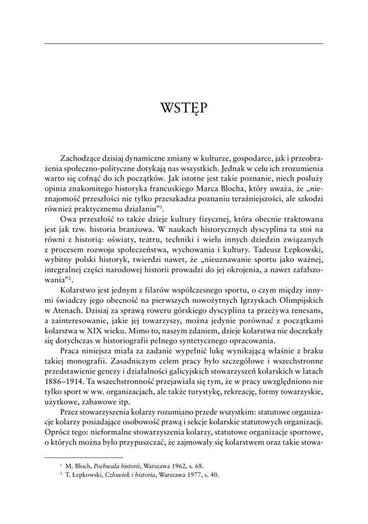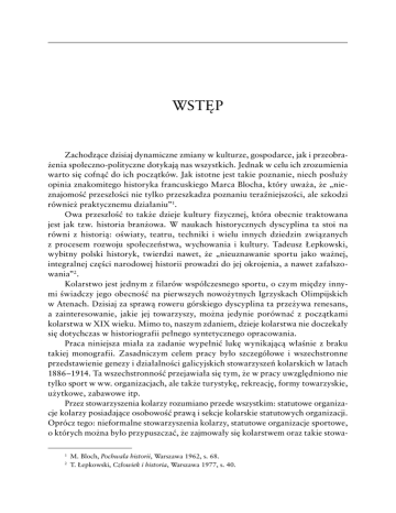 Rozdział WSTĘP Zachodzące dzisiaj dynamiczne zmiany w kulturze, gospodarce, jak i przeobrażenia społeczno-polityczne dotykają nas wszystkich. Jednak w celu ich zrozumienia warto się cofnąć do ich początków. Jak istotne jest takie poznanie, niech posłuży opinia znakomitego historyka francuskiego Marca Blocha, który uważa, że „nieznajomość przeszłości nie tylko przeszkadza poznaniu teraźniejszości, ale szkodzi również praktycznemu działaniu”1. Owa przeszłość to także dzieje kultury fizycznej, która obecnie traktowana jest jak tzw. historia branżowa. W naukach historycznych dyscyplina ta stoi na równi z historią: oświaty, teatru, techniki i wielu innych dziedzin związanych z procesem rozwoju społeczeństwa, wychowania i kultury. Tadeusz Łepkowski, wybitny polski historyk, twierdzi nawet, że „nieuznawanie sportu jako ważnej, integralnej części narodowej historii prowadzi do jej okrojenia, a nawet zafałszowania”2. Kolarstwo jest jednym z filarów współczesnego sportu, o czym między innymi świadczy jego obecność na pierwszych nowożytnych Igrzyskach Olimpijskich w Atenach. Dzisiaj za sprawą roweru górskiego dyscyplina ta przeżywa renesans, a zainteresowanie, jakie jej towarzyszy, można jedynie porównać z początkami kolarstwa w XIX wieku. Mimo to, naszym zdaniem, dzieje kolarstwa nie doczekały się dotychczas w historiografii pełnego syntetycznego opracowania. Praca niniejsza miała za zadanie wypełnić lukę wynikającą właśnie z braku takiej monografii. Zasadniczym celem pracy było szczegółowe i wszechstronne przedstawienie genezy i działalności galicyjskich stowarzyszeń kolarskich w latach 1886–1914. Ta wszechstronność przejawiała się tym, że w pracy uwzględniono nie tylko sport w ww. organizacjach, ale także turystykę, rekreację, formy towarzyskie, użytkowe, zabawowe itp. Przez stowarzyszenia kolarzy rozumiano przede wszystkim: statutowe organizacje kolarzy posiadające osobowość prawą i sekcje kolarskie statutowych organizacji. Oprócz tego: nieformalne stowarzyszenia kolarzy, statutowe organizacje sportowe, o których można było przypuszczać, że zajmowały się kolarstwem oraz takie stowa1 2 M. Bloch, Pochwała historii, Warszawa 1962, s. 68. T. Łepkowski, Człowiek i historia, Warszawa 1977, s. 40. 6 Wstęp rzyszenia, które wprawdzie nie wskazywały sportu, rekreacji czy turystyki jako celów swojej działalności, ale mimo to prowadziły ją na niwie kolarstwa. Pochodną takiego określenia tematu monografii były problemy szczegółowe. Jakie stowarzyszenia kolarskie, kiedy i gdzie zostały zawiązane? Jakie były składy społeczne stowarzyszeń, czy zmieniały się one na przestrzeni lat? Jakie formy kolarstwa były przez nie uprawiane, które z nich były preferowane? Czy w prowadzonej działalności przez galicyjskie stowarzyszenia można wyróżnić jakieś okresy, jeśli tak – to od czego one zależały i czym się różniły? Zakres terytorialny pracy objął Galicję. Była to, jak uważał A. Chwalba, „największa i najludniejsza prowincja cesarstwa”3. Jej powierzchnia wynosiła 78502 km2 , zamieszkiwało ją w 1890 roku 6,6 mln mieszkańców, natomiast w 1910 roku nieco ponad 9 mln, w tym około 5 mln Polaków4. Galicja posiadała w sporej części naturalne granice, którymi były: Wisła, Zbrucz oraz Karpaty Zachodnie i częściowo Karpaty Wschodnie (ich zachodnia i środkowa część). Był to jednak sztuczny twór, gdyż powstał z wycięcia go z dawnego, funkcjonującego kilkaset lat organizmu państwowego. Zakres chronologiczny monografii obejmuje lata 1886–1914. Takie ramy czasowe wynikały z bardzo istotnych wydarzeń dla dziejów kolarstwa na terenie Galicji. W 1886 roku powstał pierwszy na terenie zaboru austriackiego polski klub kolarski. Był nim Krakowski Klub Cyklistów. Jego statut został zatwierdzony przed statutem Warszawskiego Towarzystwa Cyklistów. Stołeczny klub uznawany był za pierwsze stowarzyszenie kolarzy na ziemiach polskich, dlatego powołanie krakowskiego stanowi cezurę nie tylko dla dziejów kolarstwa w Galicji, ale i Polski. Zamknięcie badań, a tym samym i niniejszej monografii, na 1914 roku wynikało z kilku powodów. Dnia 28 lipca 1914 roku wojnę Serbii wypowiedziały Austro-Węgry, kilka dni późnej Niemcy to samo zrobiły w stosunku do Rosji. Natomiast 5 sierpnia we Lwowie odwołano wszelkie imprezy sportowe z powodu ogólnej mobilizacji5, a już we wrześniu 1914 roku doszło tam do walk zbrojnych. Ich skutkiem życie sportowe w mieście nad Pełtwią zamarło. Ten zanik sportowej, rekreacyjnej i turystycznej działalności kolarskiej w 1914 roku uznano za właściwą datę końca rozważań nt. działalności galicyjskich stowarzyszeń kolarskich. Kolarstwo na terenie zaboru austriackiego jest wdzięcznym tematem rozważań dla wielu badaczy sportu. Pierwszym, który zwrócił na to uwagę był B. Tuszyński. Jest on autorem aż trzech pokaźnych rozmiarów dzieł dotyczących zagadnień kolarstwa od jego zarania na ziemiach polskich do lat dziewięćdziesiątych XX wieku. A. Chwalba, Historia Polski 1795–1918, Kraków 2000, s. 194. J. Pajewski, Historia Powszechna 1871–1918, Warszawa 2001, s. 114; Dodatek statystyczny do S. Kornmana Mapy Galicji i Bukowiny, Lwów 1898, s. 3. 5 Księga pamiątkowa poświęcona 35-leciu działalności Lwowskiego Klubu Sportowego „Pogoń” 1904–1939, Lwów 1939, s. 61. 3 4 Wstęp 7 W tych monografiach znalazły się też informacje o początkach tej dyscypliny sportu w Galicji6. Każda ze wspomnianych prac B. Tuszyńskiego w zakresie interesującej nas tematyki powiela te same treści, informuje o tych samych wydarzeniach, podaje te same nazwiska. Wiele z nich, niestety, było nieprawdziwych. Przede wszystkim ten zasłużony badacz podważał polski charakter pierwszego galicyjskiego klubu kolarskiego. Następnie błędnie podawał nazwisko pierwszego nauczyciela jazdy na rowerze z TG „S