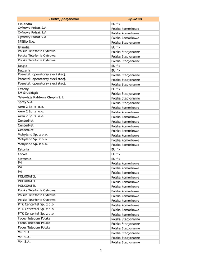Rodzaj połączenia 5pillows Finlandia Cyfrowy Polsat S.A. Cyfrowy Polsat S.A. Cyfrowy Polsat S.A. SFERIA S.A. EU fix Polska Polska Polska Polska EU fix Polska Polska Polska EU fix EU fix Polska Polska Polska EU fix Polska Polska Polska Polska Polska Polska Polska Polska Polska Polska Polska Polska EU fix EU fix EU fix Polska Polska Polska Polska Polska Polska Polska Polska Polska Polska Polska Polska Polska Polska Polska Polska Polska Polska Islandia Polska Telefonia Cyfrowa Polska Telefonia Cyfrowa Polska Telefonia Cyfrowa Belgia Bułgaria Pozostali operatorzy sieci stacj. Pozostali operatorzy sieci stacj. Pozostali operatorzy sieci stacj. Czechy SM Grudziądz Telewizja Kablowa Chopin S.J. Spray S.A. Aero 2 Sp. z o.o. Aero 2 Sp. z o.o. Aero 2 Sp. z o.o. CenterNet CenterNet CenterNet Mobyland Sp. z o.o. Mobyland Sp. z o.o. Mobyland Sp. z o.o. Estonia Łotwa Słowenia P4 P4 P4 POLKOMTEL POLKOMTEL POLKOMTEL Polska Telefonia Cyfrowa Polska Telefonia Cyfrowa Polska Telefonia Cyfrowa PTK Centertel Sp. z o.o PTK Centertel Sp. z o.o PTK Centertel Sp. z o.o Focus Telecom Polska Focus Telecom Polska Focus Telecom Polska MNI S.A. MNI S.A. MNI S.A. 1 komórkowe komórkowe komórkowe Stacjonarne Stacjonarne Stacjonarne Stacjonarne Stacjonarne Stacjonarne Stacjonarne Stacjonarne Stacjonarne Stacjonarne komórkowe komórkowe komórkowe komórkowe komórkowe komórkowe komórkowe komórkowe komórkowe komórkowe komórkowe komórkowe komórkowe komórkowe komórkowe komórkowe komórkowe komórkowe komórkowe komórkowe komórkowe Stacjonarne Stacjonarne Stacjonarne Stacjonarne Stacjonarne Stacjonarne MNI Telecom S.A. MNI Telecom S.A. MNI Telecom S.A. PSM Winogrady PSM Winogrady PSM Winogrady Multimedia Polska S.A. Multimedia Polska S.A. Multimedia Polska S.A. Awacom Sp. z o.o. Polska Polska Polska Polska Polska Polska Polska Polska Polska Polska EU fix Polska Polska Polska Polska Polska Polska Polska Polska Polska Polska Polska EU fix Polska Polska Polska Polska Polska Polska Polska Polska Polska EU fix Polska EU fix EU fix EU fix EU fix Polska Polska Polska Polska Polska Polska Polska Polska Polska Polska Szwajcaria SM Grudziądz Telewizja Kablowa Chopin S.J. MEDIATEL S.A. Spray S.A. VoiceWork Sp. z o.o. VoiceWork Sp. z o.o. VoiceWork Sp. z o.o. Syrion Sp. z o.o. Syrion Sp. z o.o. Syrion Sp. z o.o. EXATEL S.A. Luksemburg NETIA SA NETIA SA NETIA SA E-Telko E-Telko E-Telko Nettelekom GK sp z o.o. Nettelekom GK sp z o.o. Nettelekom GK sp z o.o. Litwa Awacom Sp. z o.o. Włochy Chorwacja Malta Niemcy MEDIATEL S.A. 3S Sp. z o.o. 3S Sp. z o.o. 3S Sp. z o.o. Aiton Caldwell Aiton Caldwell Aiton Caldwell City Sat Gordzielik City Sat Gordzielik City Sat Gordzielik 2 Stacjonarne Stacjonarne Stacjonarne Stacjonarne Stacjonarne Stacjonarne Stacjonarne Stacjonarne Stacjonarne Stacjonarne Stacjonarne Stacjonarne Stacjonarne Stacjonarne Stacjonarne Stacjonarne Stacjonarne Stacjonarne Stacjonarne Stacjonarne Stacjonarne Stacjonarne Stacjonarne Stacjonarne Stacjonarne Stacjonarne Stacjonarne Stacjonarne Stacjonarne Stacjonarne Stacjonarne Stacjonarne Stacjonarne Stacjonarne Stacjonarne Stacjonarne Stacjonarne Stacjonarne Stacjonarne Stacjonarne Stacjonarne E-Call Polska Sp. z o.o. E-Call Polska Sp. z o.o. E-Call Polska Sp. z o.o. EASYCALL.PL Sp. z o.o. EASYCALL.PL Sp. z o.o. EASYCALL.PL Sp. z o.o. ECHOSTAR - Studio Zakład Techniki Satelitarnej ECHOSTAR - Studio Zakład Techniki Satelitarnej ECHOSTAR - Studio Zakład Techniki Satelitarnej ELCUK KOŻUCH Sp.J. ELCUK KOŻUCH Sp.J. ELCUK KOŻUCH Sp.J. GLOBITEL GLOBITEL GLOBITEL GTS Poland Sp. z o.o. GTS Poland Sp. z o.o. GTS Poland Sp. z o.o. Inea S.A. Inea S.A. Inea S.A. Internetia Sp. z o.o. Internetia Sp. z o.o. Internetia Sp. z o.o. LoVo LoVo LoVo PTK Centertel Sp. z o.o PTK Centertel Sp. z o.o PTK Centertel Sp. z o.o SAT FILM SAT FILM SAT FILM Telbeskid Sp. z o.o. Telbeskid Sp. z o.o. Telbeskid Sp. z o.o. Telefonia Dialog S.A. Telefonia Dialog S.A. Telefonia Dialog S.A. Telekomunikacja Kolejowa Sp. z o.o. Telekomunikacja Kolejowa Sp. z o.o. Telekomunikacja Kolejowa Sp. z o.o. TP S.A UPC Polska Sp. z o.o. UPC Polska Sp. z o.o. UPC Polska Sp. z o.o. Polska Stacjonarne Polska Stacjonarne Polska Stacjonarne Polska Stacjonarne Polska Stacjonarne Polska Stacjonarne Polska Stacjonarne Polska Stacjonarne Polska Stacjonarne Polska Stacjonarne Polska Stacjonarne Polska Stacjonarne Polska Stacjonarne Polska Stacjonarne Polska Stacjonarne Polska Stacjonarne Polska Stacjonarne Polska Stacjonarne Polska Stacjonarne Polska Stacjonarne Polska Stacjonarne Polska Stacjonarne Polska Stacjonarne Polska Stacjonarne Polska Stacjonarne Polska Stacjonarne Polska Stacjonarne Polska Stacjonarne Polska Stacjonarne Polska Stacjonarne Polska Stacjonarne Polska Stacjonarne Polska Stacjonarne Polska Stacjonarne Polska Stacjonarne Polska Stacjonarne Polska Stacjonarne Polska Stacjonarne Polska Stacjonarne Polska Stacjonarne Polska Stacjonarne Polska Stacjonarne Polska Stacjonarne Polska Stacjonarne Polska Stacjonarne Polska Stacjonarne EU fix USA stacjonarne/komórkowe Holandia USA 3 Hiszpania SM Grudziądz Telewizja Kablowa Chopin S.J. EXATEL S.A. Spray S.A. Kompania Węglowa S.A. EU fix Polska Stacjonarne Polska Stacjonarne Polska Stacjonarne Polska Stacjonarne Polska Stacjonarne EU fix EU fix EU fix EU fix Polska Stacjonarne EU fix Polska Stacjonarne EU fix EU fix Polska Stacjonarne Polska Stacjonarne Polska Stacjonarne Polska Stacjonarne Polska Stacjonarne Polska Stacjonarne EU fix EU fix EU fix EU fix EU fix Polska Stacjonarne EU fix Polska Stacjonarne EU kom EU kom EU kom EU kom EU kom EU kom EU kom EU kom EU kom EU kom EU kom EU kom EU kom EU kom EU kom EU kom EU kom EU kom EU kom Grecja Norwegia Dania Cypr TP S.A Słowacja Awacom Sp. z o.o. Irlandia Austria MEDIATEL S.A. Kompania Węglowa S.A. Orange SA Orange SA Orange SA EXATEL S.A. Wielka Brytania Francja Rumunia Węgry Szwecja TP S.A Portugalia Kompania Węglowa S.A. Szwajcaria (kom.) Słowacja (kom.) Czechy (kom.) Chorwacja (kom.) Łot