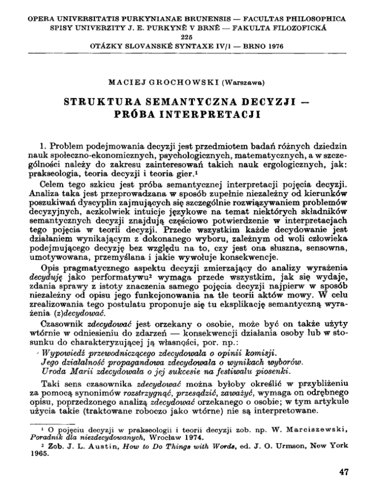 OPERA UNIVERSITATIS PURKYNIANAE BRUNENSIS — FACULTAS PHILOSOPHICA SPISY UNIVERZITY J . E . P U R K Y N E V BRNE — F A K U L T A FILOZOFICKA 225 OTAZKY SLOYANSKE S Y N T A X E IV/1 — BRNO 1976 M A C I E J G R O C H O W S K I (Warszawa) STRUKTURA SEMANTYCZNA DECYZJI PRÓBA INTERPRETACJI - 1. Problem podejmowania decyzji jest przedmiotem badań różnych dziedzin nauk społeczno-ekonomicznych, psychologicznych, matematycznych, a w szcze gólności należy do zakresu zainteresowań takich nauk ergologicznych, jak: prakseologia, teoria decyzji i teoria gier. Celem tego szkicu jest próba semantycznej interpretacji pojęcia decyzji. Analiza taka jest przeprowadzana w sposób zupełnie niezależny od kierunków poszukiwań dyscyplin zajmujących się szczególnie rozwiązywaniem problemów decyzyjnych, aczkolwiek intuicje językowe na temat niektórych składników semantycznych decyzji znajdują częściowo potwierdzenie w interpretacjach tego pojęcia w teorii decyzji. Przede wszystkim każde decydowanie jest działaniem wynikającym z dokonanego wyboru, zależnym od woli człowieka podejmującego decyzję bez względu na to, czy jest ona słuszna, sensowna, umotywowana, przemyślana i jakie wywołuje konsekwencje. 1 Opis pragmatycznego aspektu decyzji zmierzający do analizy wyrażenia decydują jako performatywu wymaga przede wszystkim, jak się wydaje, zdania sprawy z istoty znaczenia samego pojęcia decyzji najpierw w sposób niezależny od opisu jego funkcjonowania na tle teorii aktów mowy. W celu zrealizowania tego postulatu proponuje się tu eksplikację semantyczną wyra żenia (z)decydować. Czasownik zdecydować jest orzekany o osobie, może b y ć on także u ż y t y wtórnie w odniesieniu do zdarzeń — konsekwencji działania osoby lub w sto sunku do charakteryzującej ją własności, por. np.: ' Wypowiedź przewodniczącego zdecydowała o opinii komisji. Jego działalność propagandowa zdecydowała o wynikach wyborów. Uroda Marii zdecydowała o jej sukcesie na festiwalu piosenki. 2 Taki sens czasownika zdecydować można b y ł o b y określić w przybliżeniu za pomocą synonimów rozstrzygnąć, przesądzić, zaważyć, wymaga on odrębnego opisu, poprzedzonego analizą zdecydować orzekanego o osobie; w tym artykule użycia takie (traktowane roboczo jako wtórne) nie są interpretowane. 1 O pojęciu decyzji w prakseologii i teorii decyzji zob. np. W . M a r c i s z e w s k i , Poradnik dla niezdecydowanych, Wrocław 1974. Zob. J . L . A u s t i n , How to Do Things with Worda, ed. J . O. Urmson, New York 1965. 2 47 2.1. W s t ę p n e obserwacje semantyczne pojęcia decyzji sugerują, że jego składnikami są m. in. wybór, wola i świadomość. Jeżeli np. Piotr zdecydował się na pracę w redakcji, to znaczy, że wybrał taką pracę, a jeżeli Jan zdecydował, że spędzi urlop nad morzem, to znaczy, że wybrał morze jako miejsce urlopu. K a ż d y wybór jako działanie stanowi konsekwencję istnienia alternatywnych możliwości, wie o tym człowiek dokonujący wyboru i chce, by urzeczywistniła się jedna z tych możliwości. W wyrażeniu wybierać mieszczą się takie składniki semantyczne, jak: możliwość, alternatywa, wiedza, chcenie i powodowanie, por. Piotr wybiera wyjazd do matki. = Piotr wie o tym, że może chcieć wyjechać do matki albo robić co innego i chce wyjechać do matki. Jan spośród różnych książek wybiera ten kryminał. = Jan wie o tym, że może chcieć ten kryminał albo inne książki i chce ten kryminał. Wstępnie można b y ł o b y wyeksplikować wyrażenie wybierać w sposób następujący: X wybiera y spośród v = x wie o tym, że może chcieć spowodować y albo z (należące do o), i a; chce spowodować y. Zmienna x oznacza osobę, v — „ogół" możliwości, człony alternatywy są reprezentowane przez symbole y, z. Trzy spośród pięciu składników semantycznych wyboru wymagają dalszych eksplikacji, a mianowicie możliwość, alternatywa i powodowanie. W myśl pro pozycji A . Wierzbickiej możliwość należałoby wyjaśniać za pomocą implikacji i wyrażenia chcę. Dwa inne składniki wyboru traktuję jako elementarne i niedefiniowalne: wyrażenie chcieć — za Wierzbicką i wyrażenie wiedzieć — zgodnie z sugestiami A . Bogusławskiego. 3 4 5 2.2. Wola — hipotetyczny składnik decyzji — jest własnością człowieka, bywa zwykle orzekana o osobie za p o m o c ą wyrażeń typu: wolą x-a jest, żeby słało się A; x ma (taką) wolę, żeby stało się A. Jeżeli ktoś ma jakąś wolę, to wydaje się, że zawsze ma wolę, by zaistniał określony, a nie dowolny stan rzeczy: o człowieku, który akceptowałby każdy spośród możliwych stanów rzeczy, nie dałoby się orzec w sposób sensowny wyrażenia ma wolę. K a ż d y , kto ma wolę, by coś się stało, ma zarazem wolę, by coś innego równie możliwego się nie stało, a zatem dokonuje wyboru. Jeżeli np. Piotr ma taką wolę, by jego córka została nauczycielką, to Piotr wybierając dla córki zawód nauczycielki, nie chce, by miała ona jakikolwiek zawód. Wydaje się więc, że między wyrażeniami wola i dokonany wybór za chodzi relacja ekwiwalencji semantycznej, wynika stąd następująca propozycja eksplikacji: x ma wolę, by stało się A = x wybrał, by stało się A. W związku z tym skoro wyrażenie wybrać jest składnikiem semantycznym zdecydować, to i wyrażenie mieć wolę mieści się w zdecydować. 3 A . W i e r z b i c k a , Kocha lubi szanuje. Medytacje semantyczne, Warszawa 1971, s. 169, 251. A . W i e r z b i c k a , Semantic Primitives, Frankfurt/M. 1972. Propozycja przedstawiona na jednym z seminariów (1976). 4 5 48 2.3. Działanie świadome jest postępowaniem, któremu towarzyszy zda wanie sobie sprawy z wykonywanych czynów. Wierzbicka proponowała eksplikować świadomość jako wiedzę o sobie. W myśl tej propozycji świado mość należałoby uznać za składnik wyboru. Potwierdzeniem tej tezy jest sprze