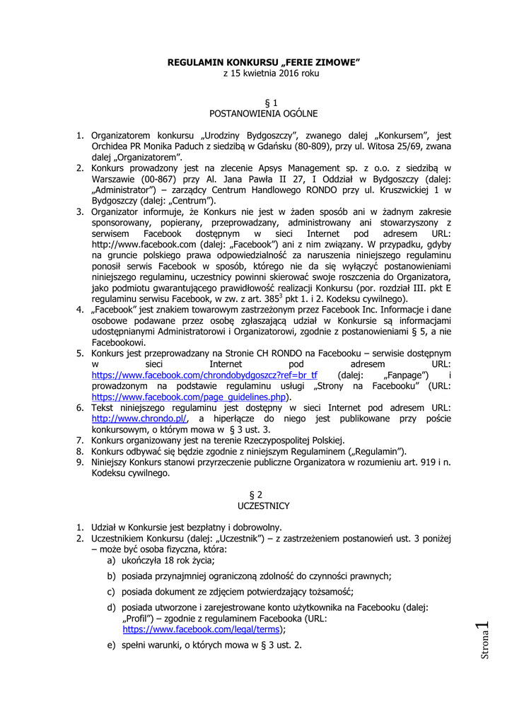 REGULAMIN KONKURSU „FERIE ZIMOWE” z 15 kwietnia 2016 roku §1 POSTANOWIENIA OGÓLNE 1. Organizatorem konkursu „Urodziny Bydgoszczy”, zwanego dalej „Konkursem”, jest Orchidea PR Monika Paduch z siedzibą w Gdańsku (80-809), przy ul. Witosa 25/69, zwana dalej „Organizatorem”. 2. Konkurs prowadzony jest na zlecenie Apsys Management sp. z o.o. z siedzibą w Warszawie (00-867) przy Al. Jana Pawła II 27, I Oddział w Bydgoszczy (dalej: „Administrator”) – zarządcy Centrum Handlowego RONDO przy ul. Kruszwickiej 1 w Bydgoszczy (dalej: „Centrum”). 3. Organizator informuje, że Konkurs nie jest w żaden sposób ani w żadnym zakresie sponsorowany, popierany, przeprowadzany, administrowany ani stowarzyszony z serwisem Facebook dostępnym w sieci Internet pod adresem URL: http://www.facebook.com (dalej: „Facebook”) ani z nim związany. W przypadku, gdyby na gruncie polskiego prawa odpowiedzialność za naruszenia niniejszego regulaminu ponosił serwis Facebook w sposób, którego nie da się wyłączyć postanowieniami niniejszego regulaminu, uczestnicy powinni skierować swoje roszczenia do Organizatora, jako podmiotu gwarantującego prawidłowość realizacji Konkursu (por. rozdział III. pkt E regulaminu serwisu Facebook, w zw. z art. 3853 pkt 1. i 2. Kodeksu cywilnego). 4. „Facebook” jest znakiem towarowym zastrzeżonym przez Facebook Inc. Informacje i dane osobowe podawane przez osobę zgłaszającą udział w Konkursie są informacjami udostępnianymi Administratorowi i Organizatorowi, zgodnie z postanowieniami § 5, a nie Facebookowi. 5. Konkurs jest przeprowadzany na Stronie CH RONDO na Facebooku – serwisie dostępnym w sieci Internet pod adresem URL: https://www.facebook.com/chrondobydgoszcz?ref=br_tf (dalej: „Fanpage”) i prowadzonym na podstawie regulaminu usługi „Strony na Facebooku” (URL: https://www.facebook.com/page_guidelines.php). 6. Tekst niniejszego regulaminu jest dostępny w sieci Internet pod adresem URL: http://www.chrondo.pl/, a hiperłącze do niego jest publikowane przy poście konkursowym, o którym mowa w § 3 ust. 3. 7. Konkurs organizowany jest na terenie Rzeczypospolitej Polskiej. 8. Konkurs odbywać się będzie zgodnie z niniejszym Regulaminem („Regulamin”). 9. Niniejszy Konkurs stanowi przyrzeczenie publiczne Organizatora w rozumieniu art. 919 i n. Kodeksu cywilnego. §2 UCZESTNICY 1. Udział w Konkursie jest bezpłatny i dobrowolny. 2. Uczestnikiem Konkursu (dalej: „Uczestnik”) – z zastrzeżeniem postanowień ust. 3 poniżej – może być osoba fizyczna, która: a) ukończyła 18 rok życia; b) posiada przynajmniej ograniczoną zdolność do czynności prawnych; e) spełni warunki, o których mowa w § 3 ust. 2. Strona d) posiada utworzone i zarejestrowane konto użytkownika na Facebooku (dalej: „Profil”) – zgodnie z regulaminem Facebooka (URL: https://www.facebook.com/legal/terms); 1 c) posiada dokument ze zdjęciem potwierdzający tożsamość; 3. W Konkursie nie mogą brać udziału pracownicy, współpracownicy lub przedstawiciele Organizatora i Administratora, ani członkowie ich rodzin. Przez członków rodziny rozumie się na potrzeby Konkursu: wstępnych, zstępnych, rodzeństwo, małżonków, rodziców współmałżonka oraz osoby pozostające w stosunku przysposobienia. §3 CZAS I WARUNKI KONKURSU 1. Konkurs rozpoczyna się w dniu 15.04.2016 roku o godzinie 15.00 i trwa do dnia 19.04.2016 roku do godziny 23.59, przez co rozumie się moment, do którego Uczestnicy mają prawo zgłaszać Odpowiedź Konkursową określoną w ust. 4 poniżej. 2. Warunkami uczestnictwa w Konkursie są łącznie: a) wykonanie zadania konkursowego, o którym mowa w ust. 4 poniżej; b) zapoznanie się z treścią niniejszego Regulaminu i zaakceptowanie go; Strona 3. Organizator publikuje na Fanpage’u zadanie konkursowe przy użyciu funkcjonalności „Status” udostępnianej przez Facebook (tzw. post) (dalej: „Pytanie Konkursowe”). Pytanie Konkursowe zostanie opublikowane w piątek 15 kwietnia 2016 roku o godz. 15:00. W treści Pytania Konkursowego Organizator publikuje również hiperłącze do adresu URL niniejszego Regulaminu (§ 1 ust. 6). 4. Zadanie konkursowe polega na opublikowaniu komentarza (postu) do Pytania Konkursowego zawierającego odpowiedź na to Pytanie Konkursowe – przy pomocy funkcjonalności „Dodaj komentarz” („Napisz komentarz”) udostępnianej przez Facebook (dalej: „Odpowiedź Konkursowa”). Odpowiedź Konkursowa powinna być opublikowana przez Uczestnika do godz. 23:59 we wtorek 19 kwietnia 2016 roku. Odpowiedź Konkursowa może mieć formę słowną, graficzną lub słowno-graficzną – odpowiednio do Pytania Konkursowego oraz zgodnie z funkcjonalnościami udostępnianymi przez Facebook. 5. Uczestnik może opublikować tylko 1 (jedną) Odpowiedź Konkursową w czasie trwania Konkursu. W przypadku opublikowania kilku Odpowiedzi Konkursowych przez jednego Uczestnika Organizator będzie brać pod uwagę tylko pierwszą Odpowiedź Konkursową opublikowaną przez tego Uczestnika. 6. Opublikowanie Odpowiedzi Konkursowej jest równoznaczne z oświadczeniem, że Uczestnik jest wyłącznym twórcą tej Odpowiedzi Konkursowej i/lub że Uczestnikowi przysługują do niej (jako całości) nieograniczone osobiste i majątkowe prawa autorskie i prawa pokrewne, a także iż Odpowiedź Konkursowa nie narusza praw autorskich osób trzecich, uprawnień jakiejkolwiek osoby związanych z rozpowszechnianiem jej wizerunku, jest wolna od niedozwolonych zapożyczeń oraz nie mają miejsca żadne inne okoliczności, które mogłyby narazić Organizatora lub Administratora na odpowiedzialność wobec osób trzecich z tytułu eksploatacji Odpowiedzi Konkursowej na polach eksploatacji wymienionych w ust. 7. 7. Publikując Odpowiedź Konkursową, Uczestnik godzi się również i oświadcza, że w przypadku otrzymania nagrody (§ 4) w zamian za tę nagrodę przechodzą na Organizatora, bez ograniczeń c