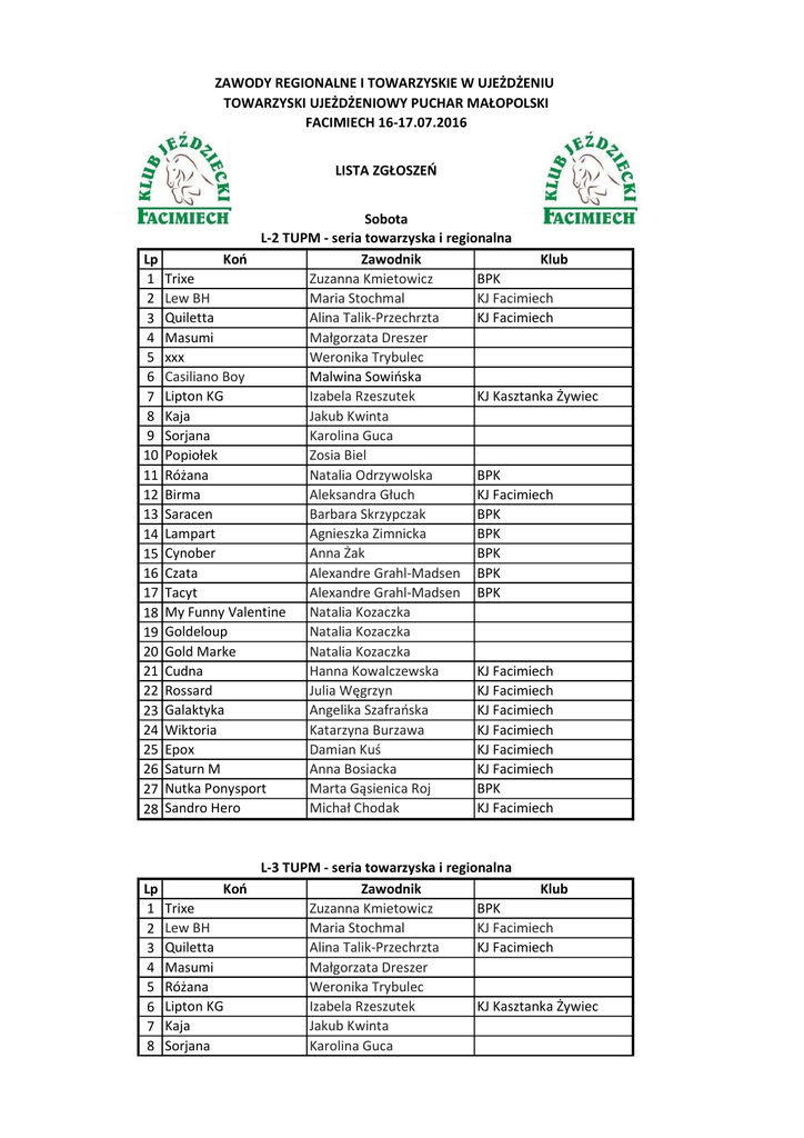 ZAWODY REGIONALNE I TOWARZYSKIE W UJEŻDŻENIU TOWARZYSKI UJEŻDŻENIOWY PUCHAR MAŁOPOLSKI FACIMIECH 16-17.07.2016 LISTA ZGŁOSZEŃ Lp 1 2 3 4 5 6 7 8 9 10 11 12 13 14 15 16 17 18 19 20 21 22 23 24 25 26 27 28 Sobota L-2 TUPM - seria towarzyska i regionalna Koń Zawodnik Klub Trixe Zuzanna Kmietowicz BPK Lew BH Maria Stochmal KJ Facimiech Quiletta Alina Talik-Przechrzta KJ Facimiech Masumi Małgorzata Dreszer xxx Weronika Trybulec Casiliano Boy Malwina Sowińska Lipton KG Izabela Rzeszutek KJ Kasztanka Żywiec Kaja Jakub Kwinta Sorjana Karolina Guca Popiołek Zosia Biel Różana Natalia Odrzywolska BPK Birma Aleksandra Głuch KJ Facimiech Saracen Barbara Skrzypczak BPK Lampart Agnieszka Zimnicka BPK Cynober Anna Żak BPK Czata Alexandre Grahl-Madsen BPK Tacyt Alexandre Grahl-Madsen BPK My Funny Valentine Natalia Kozaczka Goldeloup Natalia Kozaczka Gold Marke Natalia Kozaczka Cudna Hanna Kowalczewska KJ Facimiech Rossard Julia Węgrzyn KJ Facimiech Galaktyka Angelika Szafrańska KJ Facimiech Wiktoria Katarzyna Burzawa KJ Facimiech Epox Damian Kuś KJ Facimiech Saturn M Anna Bosiacka KJ Facimiech Nutka Ponysport Marta Gąsienica Roj BPK Sandro Hero Michał Chodak KJ Facimiech L-3 TUPM - seria towarzyska i regionalna Lp Koń Zawodnik Klub Zuzanna Kmietowicz BPK 1 Trixe Maria Stochmal KJ Facimiech 2 Lew BH Alina Talik-Przechrzta KJ Facimiech 3 Quiletta Małgorzata Dreszer 4 Masumi Weronika Trybulec 5 Różana Izabela Rzeszutek KJ Kasztanka Żywiec 6 Lipton KG Jakub Kwinta 7 Kaja Karolina Guca 8 Sorjana Popiołek Różana Birma Saracen Lampart Cynober Czata Tacyt My Funny Valentine Goldeloup Gold Marke Cudna Rossard Galaktyka Wiktoria Epox Saturn M Nutka Ponysport Cristiano Mr. Cairo Casiliano Boy Zosia Biel Natalia Odrzywolska Aleksandra Głuch Barbara Skrzypczak Agnieszka Zimnicka Anna Żak Alexandre Grahl-Madsen Alexandre Grahl-Madsen Natalia Kozaczka Natalia Kozaczka Natalia Kozaczka Hanna Kowalczewska Julia Węgrzyn Angelika Szafrańska Katarzyna Burzawa Damian Kuś Anna Bosiacka Marta Gąsienica Roj Zuzanna Sławińska Julia Słomkowska Malwina Sowińska Lp 1 2 3 4 Koń Cristiano Mr. Cairo Pan Rolex LG Erotyk P-2 seria towarzyska Zawodnik Klub Zuzanna Sławińska WLKS Krakus Julia Słomkowska BPK Dagmara Olszewska UKJ Promyk Joanna Mandecka-Turczyńska KJ Facimiech Lp 1 2 3 4 5 6 Koń Pan Rolex LG Amaretto Ramadan Tunezja Durango P Sandro Hero P-2 ZR I nawrót Runda P Zawodnik Dagmara Olszewska Maja Klich Małgorzata Kawala Aleksandra Stańska Anna Bosiacka Michał Chodak Klub UKJ Promyk BPK KJ Facimiech KJ PonySPort KJ Facimiech KJ Facimiech Lp 1 2 3 4 5 6 7 8 9 Koń N-5 ZR I nawrót Runda N Zawodnik Małgorzata Kawala Aleksandra Stańska Agnieszka Nurkowska Anna Bałut Joanna Witosińska Joanna Witosińska Alina Mikołajczyk Jagoda Turczyńska Katarzyna Skrzypczak Klub KJ Facimiech KJ PonySPort KJ Avanti KJ Avanti KJ Szarża Bolęcin KJ Szarża Bolęcin KJ Facimiech KJ Facimiech KJ Facimiech 9 10 11 12 13 14 15 16 17 18 19 20 21 22 23 24 25 26 27 28 6 Ramadan Tunezja Concerto Marphy M Sahara MG Polaco Ulma 1 Awa Horus BPK KJ Facimiech BPK BPK BPK BPK BPK KJ Facimiech KJ Facimiech KJ Facimiech KJ Facimiech KJ Facimiech KJ Facimiech BPK WLKS Krakus BPK Lp Koń 1 Be My Life Top 2 Happy Boy 3 Hormon Ponysport C-3 ZR I nawrót Runda C Zawodnik Katarzyna Skrzypczak Wiktoria Krzywda Aleksandra Stańska Klub KJ Facimiech KJ Facimiech KJ PonySPort Koń Lp Hormon Ponysport 1 CC - 1 Zawodnik Aleksandra Stańska Klub KJ PonySPort Koń Lp 1 Concerto C-1 Zawodnik Agnieszka Nurkowska KJ Avanti Lp 1 Lp 1 2 3 4 5 6 7 8 9 10 11 12 13 14 15 16 17 18 19 20 21 22 23 24 25 26 27 28 Koń Aparadżita CC-2 Zawodnik Marek Szczur Klub Klub KJK Szary Michałowice NIEDZIELA L-2 TUPM - seria towarzyska i regionalna Koń Zawodnik Klub Sandro Hero Michał Chodak KJ Facimiech Trixe Zuzanna Kmietowicz BPK Lew BH Maria Stochmal KJ Facimiech Quiletta Alina Talik-Przechrzta KJ Facimiech Masumi Małgorzata Dreszer Lipton KG Izabela Rzeszutek KJ Kasztanka Żywiec Kaja Jakub Kwinta Sorjana Karolina Guca Popiołek Zosia Biel Różana Natalia Odrzywolska BPK Birma Aleksandra Głuch KJ Facimiech Saracen Barbara Skrzypczak BPK Lampart Agnieszka Zimnicka BPK Cynober Anna Żak BPK Czata Alexandre Grahl-Madsen BPK Tacyt Alexandre Grahl-Madsen BPK Cudna Hanna Kowalczewska KJ Facimiech Rossard Julia Węgrzyn KJ Facimiech Galaktyka Angelika Szafrańska KJ Facimiech Wiktoria Katarzyna Burzawa KJ Facimiech Epox Damian Kuś KJ Facimiech Saturn M Anna Bosiacka KJ Facimiech Nutka Ponysport Marta Gąsienica Roj BPK Casiliano Boy Malwina Sowińska Bazyl Ewa Paluszkiewicz KJ Facimiech My Funny Valentine Piot Rachwał BPK Goldeloup Piot Rachwał BPK Gold Marke Klaudia Czwórnóg BPK Lp 1 2 3 4 5 6 7 8 9 10 11 12 13 14 15 16 17 18 19 20 21 22 23 24 25 26 27 28 L-3 TUPM - seria towarzyska i regionalna Koń Zawodnik Klub Trixe Zuzanna Kmietowicz BPK Lew BH Maria Stochmal KJ Facimiech Quiletta Alina Talik-Przechrzta KJ Facimiech Masumi Małgorzata Dreszer Lipton KG Izabela Rzeszutek KJ Kasztanka Żywiec Kaja Jakub Kwinta Sorjana Karolina Guca Popiołek Zosia Biel Różana Natalia Odrzywolska BPK Birma Aleksandra Głuch KJ Facimiech Saracen Barbara Skrzypczak BPK Lampart Agnieszka Zimnicka BPK Cynober Anna Żak BPK Czata Alexandre Grahl-Madsen BPK Tacyt Alexandre Grahl-Madsen BPK Cudna Hanna Kowalczewska KJ Facimiech Rossard Julia Węgrzyn KJ Facimiech Galaktyka Angelika Szafrańska KJ Facimiech Wiktoria Katarzyna Burzawa KJ Facimiech Epox Damian Kuś KJ Facimiech Saturn M Anna Bosiacka KJ Facimiech Nutka Ponysport Marta Gąsienica Roj BPK Casiliano Boy Malwina Sowińska My Funny Valentine Piot Rachwał BPK Goldeloup Piot Rachwał BPK Gold Marke Klaudia Czwórnóg BPK Mr. Cairo Julia Słomkowska BPK Darius le Grand Anna Balcewicz-Szulada BPK Koń Lp 1 2 3 4 5 6 7 8 Mr. Cairo Darius le Grand Sandro Hero Pan Rolex LG Amaretto Durango P Cristiano Erotyk Lp 1 2 3 4 Koń Pan Rolex LG Durango P Ramadan Tunezja P-3 - seria towarzyska i regionalna Zawodn