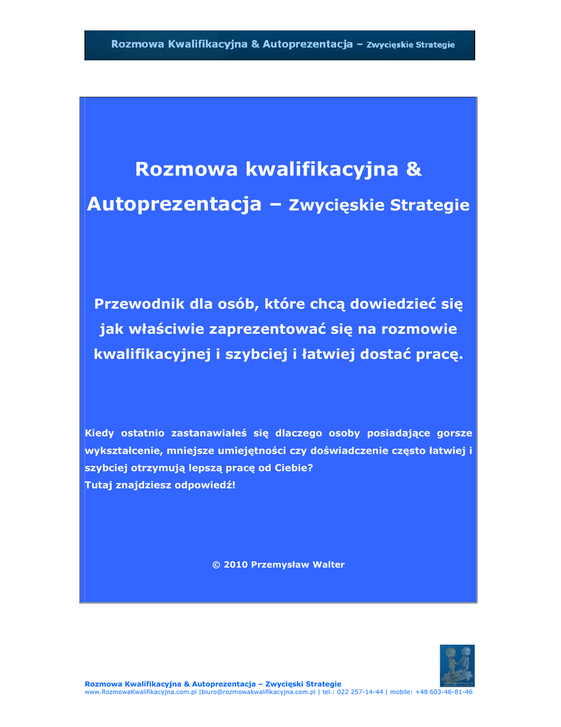 Rozmowa kwalifikacyjna & Autoprezentacja – Zwycięskie Strategie Przewodnik dla osób, które chcą dowiedzieć się jak właściwie zaprezentować się na rozmowie kwalifikacyjnej i szybciej i łatwiej dostać pracę. Kiedy ostatnio zastanawiałeś się dlaczego osoby posiadające gorsze wykształcenie, mniejsze umiejętności czy doświadczenie często łatwiej i szybciej otrzymują lepszą pracę od Ciebie? Tutaj znajdziesz odpowiedź! © 2010 Przemysław Walter Rozmowa Kwalifikacyjna & Autoprezentacja – Zwycięski Strategie www.RozmowaKwalifikacyjna.com.pl |[email protected] | tel.: 022 257-14-44 | mobile: +48 603-46-81-46 Drogi przyjacielu pragnący łatwiej i szybciej dostać pracę, Wydrukuj ten Przewodnik i postępuj zgodnie z zasadami opisanymi poniżej. W tym Przewodniku będziemy odkrywali gwarantowaną wiedzę, oraz metody i techniki jak przygotować się do rozmowy kwalifikacyjnej i dać się zatrudnić na rozmowie kwalifikacyjnej. Rozmowa Kwalifikacyjna & Autoprezentacja – Zwycięski Strategie www.RozmowaKwalifikacyjna.com.pl |[email protected] | tel.: 022 257-14-44 | mobile: +48 603-46-81-46 Część Pierwsza Prawdziwa istota Rozmowy Kwalifikacyjnej Prawidłowe pojmowanie istoty Rozmowy kwalifikacyjnej i jej celów jest niemal dokładnym przeciwieństwem tego jak większość ludzi przygotowuje się i prezentuje w trakcie rozmowy kwalifikacyjnej. Większość specjalistów i doradców zawodowych wciąż pisze o zaletach cv, listu motywacyjnego i rozmowy kwalifikacyjnej. Piszą i uczą Ciebie w jaki sposób prawidłowo je przygotować i sprzedają Tobie najlepsze gotowe wzorce i odpowiedzi na pytania podczas rozmowy kwalifikacyjnej. Nie pozwól, aby powszechnie stosowany język uśpił Twoją czujność i skłonił do poszukiwania pracy w najmniej efektywny sposób. Osoby, które instynktownie zrozumiały na czym naprawę polega rozmowa kwalifikacyjna wiedzą, że zarówno oni jak i Ty jesteście na rynku pracy Towarem. Jesteś skrzynią komputerowym. biegów, Jesteś jak płatkami chipsy, śniadaniowymi, rywalizujące z programem każdym innym pudełkiem, pragnącym przyciągnąć wzrok klienta, aby zdjął Ciebie z pułki i zainwestował właśnie w Ciebie. Przepraszam, za porównania, są one niezbędne, ponieważ dzięki nim rozumiesz już największy sekret osób, które dużo łatwiej i szybciej potrafią przekonać pracodawcę, by zainwestował właśnie w nich. Rozmowa Kwalifikacyjna & Autoprezentacja – Zwycięski Strategie www.RozmowaKwalifikacyjna.com.pl |[email protected] | tel.: 022 257-14-44 | mobile: +48 603-46-81-46 Już od dawna rozumieją oni tą prawdę, że zatrudniając pracowników, firma dokonuje inwestycji. Rozumieją oni również wszystkie dalsze konsekwencje tej prawdy, a to pozwala im kierować się zupełnie innym, dużo bardziej skutecznym paradygmatem poszukiwania pracy. Zgodnie z tym paradygmatem: Kandydat do pracy to: Aktywo, które firma zamierza nabyć. Wynagrodzenie to: cena, którą firma gotowa jest zapłacić za to aktywo. List motywacyjny to: Reklama bezpośrednia. Firma zatrudniająca to: Pan x – ostateczny klient wewnętrzny Twoich usług. To nie firma zatrudnia osoby tylko konkretni ludzie. Osoba prowadząca rozmowę to: Twój klient. Praca to: Rozwiązywanie problemów firmy i zwiększanie jej wartości na rynku. Zakres obowiązków/Oferta pracy to: Punkt wyjścia, określa wartości i potrzeby firmy. Oczekiwania wobec pracy to: Zysk firmy osiągany za płacone wynagrodzenie. Rozmowa Kwalifikacyjna & Autoprezentacja – Zwycięski Strategie www.RozmowaKwalifikacyjna.com.pl |[email protected] | tel.: 022 257-14-44 | mobile: +48 603-46-81-46 Rozmowa kwalifikacyjna to: Rozmowa handlowa. Osoba poszukująca pracy to: Handlowiec sprzedający siebie. CV to: Materiały handlowe. Rozmowa Kwalifikacyjna & Autoprezentacja – Zwycięski Strategie www.RozmowaKwalifikacyjna.com.pl |[email protected] | tel.: 022 257-14-44 | mobile: +48 603-46-81-46 Część druga Od czego zacząć? Jeśli już wiesz, że rozmowa kwalifikacyjna to rozmowa handlowa, Ty jesteś handlowcem, a Praca to: Rozwiązywanie problemów firmy i zwiększanie jej wartości na rynku to zapewne zadajesz sobie pytanie: od czego mam zacząć, aby właściwie przygotować się do rozmowy kwalifikacyjnej i skutecznie się zaprezentować. To od czego na pewno nie chcesz zacząć i czego nie powinieneś nigdy robić, to korzystać i uczyć się gotowych regułek odpowiadania na pytania. Zamiast tego chcesz nauczyć się 7 czynników skutecznej autoprezentacji, na które musisz zwrócić uwagę jeszcze przed rozmową kwalifikacyjną. 2.1 7 czynników skutecznej autoprezentacji Te klucze to: 1. Cechy; 2. Zalety; 3. Korzyści; 4. Wartości; 5. Zasady dla wartości; 6. Potrzeby; 7. Zasady dla potrzeb. Rozmowa Kwalifikacyjna & Autoprezentacja – Zwycięski Strategie www.RozmowaKwalifikacyjna.com.pl |[email protected] | tel.: 022 257-14-44 | mobile: +48 603-46-81-46 Jeśli chcesz skutecznie przekonywać rekrutera o swojej wartości musisz wiedzieć, że każdy produkt również człowieka jako aktywno możemy scharakteryzować przez odwołanie się do trzech ważnych pojęć: 1. Cechy; 2. Zalety; 3. Korzyści. Cechami są te elementy charakteryzujące produkt decydujące o tym, jakim on jest. Zalety to praktyczne zastosowanie cech. Korzyści to zyski, jakie klient osiągnie dzięki zaspokojeniu swoich potrzeb. Zapamiętaj: klienci inwestują w korzyści. Klienci nie kupują ubezpieczenia, klienci kupują bezpieczeństwo. Jak mówi stare porzekadło: Nie sprzedawaj pułapek na myszy. Sprzedaj brak myszy. Prawdziwi mistrzowie w skutecznym przekonywaniu do własnej osoby określają dodatkowo: 1. Wartości: czyli co jest dla klienta najważniejsze. 2. Zasady dla wartości czyli to wszystko po czym klient pozna, że dana ważna dla niego wartość została zaspokojona. 3. Potrzeby czyli czego właściwie nasz klient chce. 4. Zasady dla potrzeb czyli to wszystko po czym klient pozna, 