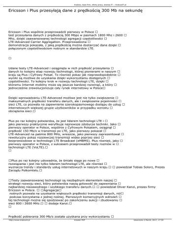 Kraków, baza firm, oferty pracy, branża IT :: KrakowIT.pl Ericsson i Plus przesyłają dane z prędkością 300 Mb na sekundę Ericsson i Plus wspólnie przeprowadzili pierwszy w Polsce test przesyłania danych z prędkością 300 Mbps w pasmach 1800 Mhz i 2600 Mhz, dzięki zaawansowanej technologii agregacji częstotliwości LTE-Advanced Carrier Aggregation. Przeprowadzona demonstracja pokazała, z jaką prędkością można dostarczać dane dzięki połączonym częstotliwościom nośnym w standardzie LTE. Udane testy LTE-Advanced i osiągnięta w nich prędkość przesyłania danych to kolejny etap rozwoju technologii, której pionierami w naszym kraju są Plus i Cyfrowy Polsat. To również pokaz jak nieprawdopodobnie wyniki są możliwe do uzyskania dzięki wykorzystaniu dostępnych częstotliwości. To kolejny krok w rozwoju technologii LTE, dzięki któremu Internet mobilny może się jeszcze bardziej rozwinąć, a który jednocześnie zrewolucjonizuje cały rynek internetowy w Polsce Dzięki wprowadzaniu LTE-Advanced możliwe jest nie tylko zwiększenie maksymalnych prędkości transferu danych, ale i zwiększenie pojemności sieci LTE, co pozwala na zapewnienie szerokopasmowego dostępu do usług internetowych większej grupie użytkowników w przypadku wzrostu obciążenia sieci. Plus po raz kolejny potwierdza, że jest liderem technologii LTE i jako pierwszy praktycznie weryfikuje najnowsze zdobycze techniki. Jako pierwszy operator w Polsce, wspólnie z Cyfrowym Polsatem, osiągnął prędkość 150 Mb/s w transmisji po LTE, jako pierwszy pokazał LTE-Advanced na paśmie 800 MHz, wreszcie, jako pierwszy zaprezentował rewolucyjny pokaz rozsiewczej transmisji wideo poprzez sieci bezprzewodowe w technologii LTE Broadcast (eMBMS). Plus również, jako pierwszy operator w Polsce, z sukcesem przeprowadził testy rozmów w technologii LTE (VoLTE). Plus po raz kolejny udowadnia, że śmiało sięga po nowe rozwiązania i jest nie tylko liderem technologii LTE, ale również wyznacza trendy i standardy usług internetowych w naszym kraju. powiedział Tobias Solorz, Prezes Zarządu Polkomtelu. Testy zaawansowanej technologii są niezbędnym elementem naszej strategii rozwoju sieci, który potwierdza naszą gotowość do zapewniania najbardziej niezawodnego i szybkiego transferu danych. powiedział Oliver Kanzi, prezes firmy Ericsson w Polsce. Agregacja nośnych pozwala na uzyskanie większych prędkości transmisji danych, niż podczas korzystania z jednej nośnej. Pierwszych komercyjnych wdrożeń tej technologii można się spodziewać po zakończeniu aukcji i zbudowaniu sieci 800 i 2600 MHz. dodaje Kanzi. Prędkość pobierania 300 Mb/s została uzyskana przy wykorzystaniu http://www.krakowit.pl Kreator PDF Utworzono 2 March, 2017, 17:59 Kraków, baza firm, oferty pracy, branża IT :: KrakowIT.pl agregacji dwóch częstotliwości nośnych 20 MHz w standardzie LTE FDD, działających w pasmach 1800 MHz oraz 2600 MHz. W jej realizacji wykorzystano oprogramowanie LTE-Advanced Carrier Aggregation stworzone przez firmę Ericsson. Przeprowadzone testy 300 Mb/s w pasmach 1800 i 2600 MHz mają na celu nie tylko pokaz hipotetycznych możliwości, jakie daje technologia. Spośród wielu możliwych rozwiązań opartych na agregacji pasm, Plus udanie przetestował to, które jest możliwe do zaoferowania na sprzęcie już dostępnym w sklepie i ofercie operatora. http://www.krakowit.pl Kreator PDF Utworzono 2 March, 2017, 17:59