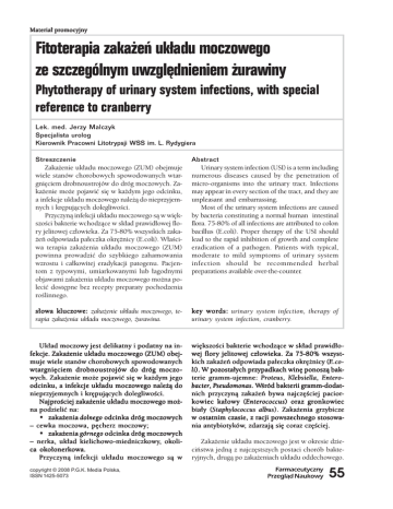 Materiał promocyjny Nr 2/2008 Problem suchej skóry i jej pielêgnacji u dzieci i niemowl¹t Fitoterapia zaka¿eñ uk³adu moczowego ze szczególnym uwzglêdnieniem ¿urawiny Phytotherapy of urinary system infections, with special reference to cranberry Lek. med. Jerzy Malczyk Specjalista urolog Kierownik Pracowni Litotrypsji WSS im. L. Rydygiera Streszczenie Zakażenie układu moczowego (ZUM) obejmuje wiele stanów chorobowych spowodowanych wtargnięciem drobnoustrojów do dróg moczowych. Zakażenie może pojawić się w każdym jego odcinku, a infekcje układu moczowego należą do nieprzyjemnych i krępujących dolegliwości. Przyczyną infekcji układu moczowego są w większości bakterie wchodzące w skład prawidłowej flory jelitowej człowieka. Za 75-80% wszystkich zakażeń odpowiada pałeczka okrężnicy (E.coli). Właściwa terapia zakażenia układu moczowego (ZUM) powinna prowadzić do szybkiego zahamowania wzrostu i całkowitej eradykacji patogenu. Pacjentom z typowymi, umiarkowanymi lub łagodnymi objawami zakażenia układu moczowego można polecić dostępne bez recepty preparaty pochodzenia roślinnego. Abstract Urinary system infection (USI) is a term including numerous diseases caused by the penetration of micro-organisms into the urinary tract. Infections may appear in every section of the tract, and they are unpleasant and embarrassing. Most of the urinary system infections are caused by bacteria constituting a normal human intestinal flora. 75-80% of all infections are attributed to colon bacillus (E.coli). Proper therapy of the USI should lead to the rapid inhibition of growth and complete eradication of a pathogen. Patients with typical, moderate to mild symptoms of urinary system infection should be recommended herbal preparations available over-the-counter. słowa kluczowe: zakażenie układu moczowego, terapia zakażenia układu moczowego, żurawina. k ey words: urinary system infection, therapy of urinary system infection, cranberry. Układ moczowy jest delik atny i podatny na indelikatny fek cje. Zak ażenie układu moczowego (ZUM) obejfekcje. Zakażenie muje wiele stanów chorobowych spowodowanych wtargnięciem drobnoustrojów do dróg moczo moczo-wych. Zak ażenie może pojawić się w kkażdym ażdym jego Zakażenie odcink u, a infek cje układu moczowego należą do odcinku, infekcje nieprzyjemnych i krępujących dolegliwości. Najprościej zak ażenie układu moczowego możzakażenie na podzielić na: ażenia dolnego odcink • zak zakażenia odcinkaa dróg moczowych – cewk cewkaa moczowa, pęcherz moczowy; • zak ażenia gór nego odcink zakażenia górnego odcinkaa dróg moczowych – nerk a, układ kielichowo -miedniczk owy olinerka, kielichowo-miedniczk -miedniczkowy owy,, ok okolica okołonerkowa. Przyczyną infek cji układu moczowego są w infekcji copyright © 2008 P.G.K. Media Polska, ISSN 1425-5073 więk szości bakterie wchodzące w skład prawidło większości prawidło-wej flor a. Za 75-80% wszystfloryy jelitowej człowiek człowieka. kich zak ażeń odpowiada pałeczk E.co zakażeń pałeczkaa okrężnicy ((E.co E.co-li ). W pozostałych przypadk ach winę ponoszą bakli). przypadkach terie gramm-ujemne: Proteus Proteus,, Klebsiella Klebsiella,, Entero Entero-bacter śród bakterii gramm-dodatbacter,, Pseudomonas seudomonas.. W Wśród nich przyczyną zak ażeń bywa najczęściej pacior zakażeń pacior-Enterococcus owiec k owiec kkałowy ałowy ((Enterococcus gronkowiec Enterococcus)) oraz gronk biały ((Staphylococcus Staphylococcus albus ). Zak ażenia grzybicze albus). Zakażenia w ostatnim czasie, z racji powszechnego stosowania antybiotyk ów antybiotyków ów,, zdarzają się coraz częściej. Zakażenie układu moczowego jest w okresie dzieciństwa jedną z najczęstszych postaci chorób bakteryjnych, drugą po zakażeniach układu oddechowego. Farmaceutyczny Przegl¹d Naukowy ## FITOTERAPIA ZAKA¯EÑ UK£ADU MOCZOWEGO ZE SZCZEGÓLNYM UWZGLÊDNIENIEM ¯URAWINY Nr 2/2008 W 1-szym miesiącu życia ZUM częściej występuje u chłopców, natomiast po 1-szym roku życia zwiększa się przewaga zachorowań wśród dziewczynek. W okresie niemowlęcym bakterie w moczu stwierdza się u ok. 1% dziewczynek i 1-2,7% chłopców, w okresie przedszkolnym – odpowiednio u 0,8% i 0,2% badanych, a w wieku szkolnym – u 1,3-2,4% dziewcząt i 0,02% chłopców. Odsetek ZUM u kobiet wyraźnie wzrasta w okresie podejmowania współżycia seksualnego, tj. na ogół między 20-tym a 30-tym rokiem życia. Wśród dzieci chorujących na ZUM wady zaporowe stwierdzano u 10% chłopców i 2% dziewczynek. Zauważono, że nawroty ZUM są najczęstsze u dzieci do 1-go roku życia, ich liczba zmniejsza się po 11tym roku życia, a następnie nieco się zwiększa po 16tym roku życia. Kobiety, z uwagi na uwarunkowania anatomiczne (m.in. krótsza i szersza niż u mężczyzn cewka moczowa, bliskość ujścia cewki moczowej, pochwy i odbytnicy), są wysoce predysponowane do ZUM. Ocenia się, że w populacji żeńskiej do 50-go roku życia zakażenia układu moczowego występują kilkadziesiąt nawet do 50 razy częściej niż w populacji męskiej. U ponad 10% młodych, aktywnych seksualnie kobiet zakażenie układu moczowego pojawia się przynajmniej raz w roku. Zapadalność zaczyna wyrównywać się dopiero po 50-tym roku życia, kiedy to proces starzenia się organizmu, spadek odporności, a także często występujący przerost gruczołu krokowego sprawiają, że infekcje te pojawiają się u mężczyzn prawie tak samo często jak u kobiet. Podstawowym objawem choroby są dolegliwości występujące podczas oddawania moczu. Najczęściej pacjenci uskarżają się na pieczenie, ból lub kłucie w cewce moczowej, zwłaszcza w czasie oddawania moczu. Inne objawy to bolesne i ciągłe parcie na mocz, częste oddawanie moczu w małych ilościach, czasem nawet po kilka kropli, bóle w okolicy łonowej lub w dole brzucha, czasem bóle w okolicy nerek. Mocz moż