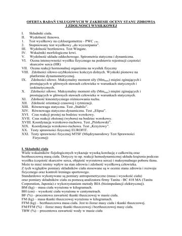 OFERTA BADAŃ USŁUGOWYCH W ZAKRESIE OCENY STANU ZDROWIA I ZDOLNOSCI WYSIŁKOWEJ I. II. 1. 2. III. IV. V. VI. Składniki ciała. Wydolność tlenowa. Test wysiłkowy na cykloergometrze - PWC 170 . Stopniowany test wysiłkowy „do wyczerpania”. Wydolność beztlenowa. Test Wingate. Wskaźniki morfologiczne krwi. Wydolność układu oddechowego. Spirometria statyczna i dynamiczna. Ocena intensywności wysiłku fizycznego na podstawie rejestracji częstości skurczów serca (HR) VII. Ocena reakcji hormonalnej organizmu na wysiłek fizyczny VIII. Zdolności siłowo-szybkościowe kończyn dolnych. Wyskoki pionowe na platformie dynamometrycznej. IX. Zdolności siłowe. Maksymalny moment siły (Mmmax) mięśni zginających i prostujących w głównych stawach człowieka w warunkach statycznych i izokinetycznych. X. Zdolności siłowe. Maksymalny moment siły (Mmmax) mięśni zginających i prostujących w głównych stawach człowieka w warunkach statycznych. XI. Zdolność kinestetycznego różnicowania ruchu. XII. Zdolność orientacji czasowej i rytmizacji. XIII. Równowaga statyczna. Test „Stabilo”. XIV. Równowaga statyczno-dynamiczna. Test „Elipsa”. XVI. Czas reakcji prostej na bodziec wzrokowy. XVII. Czas reakcji złożonej (wyboru) na bodziec wzrokowy. XVIII. Koordynacja wzrokowo-ruchowa. Test „Piórkowski”. XIX. Koordynacja wzrokowo-ruchowa. Test „Krzyżowy”. XX. Testy sprawności fizycznej EUROFIT. XXI. Testy sprawności fizycznej MTSF (Międzynarodowy Test Sprawności Fizycznej) I. Składniki ciała Wiele wskaźników fizjologicznych wykazuje wysoką korelację z całkowitą oraz beztłuszczową masą ciała. Dotyczy to np. reakcji hemodynamicznej układu krążenia podczas wysiłku (częstość skurczów serca, objętość wyrzutowa serca) i maksymalnego poboru tlenu. Może to mieć istotny wpływ na stan zdrowia i zdolność wysiłkową człowieka. Z tych względów pomiary składników ciała stosowane są w ocenie stanu zdrowia i rozwoju fizycznego oraz kontroli treningu sportowego. Standardowo wykonywane są pomiary antropometryczne (masa i wysokość ciała) oraz pomiary składników ciała za pomocą analizatora firmy Tanita - BC 418 MA (Tanita Corporation, Japonia) z wykorzystaniem metody BIA (bioimpedancji elektrycznej). BM (kg) – masa ciała wyrażona w kilogramach. BH (cm) – wysokość ciała wyrażona w centymetrach. BF (%) - procentowa zawartość tkanki tłuszczowej w masie ciała. FM (kg) – masa tkanki tłuszczowej wyrażona w kilogramach. FFM (kg) – beztłuszczowa masa ciała. Jest to iloraz masy ciała i tkanki tłuszczowej. FM/FFM (%) – iloraz masy tkanki tłuszczowej i beztłuszczowej masy ciała. TBW (%) – procentowa zawartość wody w masie ciała TBW (kg) – masa wody ustrojowej BMI (kg/m2) – wskaźnik masy ciała. MM (kg) – masa tkanki mięśniowej. II. 1. Wydolność tlenowa. Metoda pośrednia. Test PWC170 Wydolność tlenowa stanowi fundament wydolności fizycznej, mającej istotne znaczenie w determinowaniu zdrowia i sprawności funkcjonalnej człowieka. W licznych dyscyplin sportowych wysoki poziom wydolności stanowi podstawę doskonalenia specjalnych zdolności wysiłkowych. Do oceny wydolności tlenowej i adaptacji układu krążenia do wysiłku stosowany jest standardowy test wysiłkowy PWC170. Badany wykonuje dwa 5minutowe, standardowe wysiłki na cykloergometrze Monark 828 E (Monark Exercise AB, Szwecja). Rejestrowana jest częstość skurczów serca (HR) przy wykorzystaniu miernika Polar (Polar Electro Oy, Finlandia). Obliczana jest wartość obciążenia (mocy) podczas wysiłku przy częstości skurczów serca na poziomie 170 uderzeń na minutę (wartość wskaźnika PWC170) oraz maksymalny pobór tlenu (VO2max).. Podstawą do określenia wartości wskaźnika PWC170 jest liniowa zależność między mocą wysiłku, a częstością skurczów serca osiąganą w okresie równowagi fizjologicznej. Wartość wskaźnika PWC170 jest istotnie skorelowana z wartością maksymalnego poboru tlenu (VO2 max), podstawowego wskaźnika wydolności tlenowej. PWC170 (W), (W/kg) – wartość mocy wysiłku przy HR=170 ud/min VO2max (L/min) (mL/kg/min) – maksymalny pobór tlenu. II. 2. Wydolność tlenowa. Metoda bezpośrednia. Stopniowany wysiłek „do wyczerpania”. ● Pomiar maksymalnego poboru tlenu (VO2max) ● Wyznaczanie progu mleczanowego - LT Standardowo stosowane są stopniowane testy wysiłkowe „do wyczerpania” z wykorzystaniem różnych ergometrów - bieżni mechanicznej Cosmos pulsar 3 p 4.0 (h/p/cosmos sports & medical GmbH, Niemcy), cykloergometru Monark 874 E (Monark Exercise AB, Szwecja), ergometru wioślarskiego koncept-2 indoor rower (koncept-2,Inc., USA). Test składa się z szeregu wysiłków o wzrastającej mocy kontynuowanych do całkowitego wyczerpania badanego. Podczas wysiłku badany podłączony jest do ergospirometru START 2000 (MES Sp. z o.o., Polska), umożliwiającego ciągłą rejestrację wskaźników krążeniowooddechowych. Pod koniec każdego stopnia obciążenia, pobierana jest krew kapilarna z palca, w której oznaczane jest stężenie mleczanu (LA). Oznaczenia mleczanu wykonywane są za pomocą fotometru LP-420 (Dr Bruno Lange GmbH, Niemcy) oraz testów kuwetowych (Dr Bruno Lange GmbH, Niemcy). Wartości stężenia mleczanu są podstawą do obliczenia progu mleczanowego (lactate treshold - LT), określanego również jako próg przemian beztlenowych – PPB (anaerobic threshold – AT). Do oceny wydolności tlenowej wykorzystywane są wartości wskaźników na poziomie obciążenia maksymalnego oraz na poziomie progu przemian beztlenowych. AT - oznacza maksymalną moc wysiłku, przy której występuje równowaga czynnościowa ustroju, czego wyrazem jest stabilne stężenie mleczanu we krwi. T (min) – czas wysiłku VE (L/min) – wentylacja płuc. Objętość powietrza przepływająca przez płuca w czasie 1 min. HR (ud/min) – częstość skurczów serca VO2 (L/min) (ml/kg/min) - pob