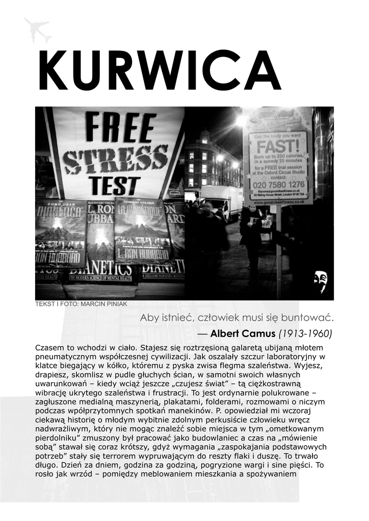 KURWICA TEKST I FOTO: MARCIN PINIAK Aby istnieć, człowiek musi się buntować. — Albert Camus (1913-1960) Czasem to wchodzi w ciało. Stajesz się roztrzęsioną galaretą ubijaną młotem pneumatycznym współczesnej cywilizacji. Jak oszalały szczur laboratoryjny w klatce biegający w kółko, któremu z pyska zwisa flegma szaleństwa. Wyjesz, drapiesz, skomlisz w pudle głuchych ścian, w samotni swoich własnych uwarunkowań – kiedy wciąż jeszcze „czujesz świat” – tą ciężkostrawną wibrację ukrytego szaleństwa i frustracji. To jest ordynarnie polukrowane – zagłuszone medialną maszynerią, plakatami, folderami, rozmowami o niczym podczas wpółprzytomnych spotkań manekinów. P. opowiedział mi wczoraj ciekawą historię o młodym wybitnie zdolnym perkusiście człowieku wręcz nadwrażliwym, który nie mogąc znaleźć sobie miejsca w tym „ometkowanym pierdolniku” zmuszony był pracować jako budowlaniec a czas na „mówienie sobą” stawał się coraz krótszy, gdyż wymagania „zaspokajania podstawowych potrzeb” stały się terrorem wypruwającym do reszty flaki i duszę. To trwało długo. Dzień za dniem, godzina za godziną, pogryzione wargi i sine pięści. To rosło jak wrzód – pomiędzy meblowaniem mieszkania a spożywaniem śniadania. Kiedy człowiek gdzieś zamyka się w swoim „świętym świecie” budując szczelne granice i toczy tam te „ciche krwawe wojny” jednocześnie utrzymując pozory tego kurewskiego „wszystko w porządku” na odpierdol się. Ten „zbiornik żółci” wypełnia się jak telewizyjne ramówki. I pewnego ciepłego wiosennego dnia następuje eksplozja. Podobnie jak w filmie „Noise”, który moim zdaniem, choć arcydziełem zapewne nie jest jednak ma to „coś”. Film wyreżyserował Henry Bean, którego wcześniejszy „Fanatyk” był filmem wybitnym. Nie mam zamiaru tutaj bawić się w jakiegoś zasranego krytyka, jednak „Hałas” jest kolejnym filmem z serii „Jankowi w końcu odpierdoliło”. Dużo lepszym w tej konwencji na pewno był „Upadek” Joela Schumacher’a z 1993 roku bardziej ekstremalnym i sugestywnym z rewelacyjnymi zdjęciami polskiego operatora (z Łodzi - lol) Andrzeja Bartkowiaka, lub kultowy „Fight Club” Davida Leo Fincher’a. Zatem jak nie trudno się domyślić tytułowy hałas w Nowym Jorku podkurwiając na bezlitosnych hercach bohatera doprowadza go do „postawy radykalnej” przez oczywiście jakiś czas, bo jednak okazuje się, że droga urzędowo – papierowa nie jest ślepa – jednak rozkosz demolowania luksusowych wyjących limuzyn, alarmów sklepowych itp. jakiej oddaje się bohater cieszy oko i serce. W myśl filozofii Johna Zerzana, który podczas wystąpienia na Uniwersytecie Stanford w 1997 roku powiedział: W ciągu ostatnich 20-30 lat stało się coś, co miało ogromne konsekwencje. Wydaje mi się, że jeszcze ludzie do końca nie zdali sobie z tego sprawy. Doszło do całkowitego podważenia koncepcji naukowych o tym, czym jest życie poza cywilizacją. Jednym z podstawowych fundamentów ideologicznych cywilizacji, religii, państwa, policji i armii jest przekonanie o żądnej krwi, ohydnej i nieludzkiej kondycji przed zaistnieniem cywilizacji. Ta kondycja została oswojona, uładzona, itp. To czysty Hobbes. To znana koncepcja, że życie przed cywilizacją, było okropne, brutalne i krótkie. Tak więc, by zbawić ludzkość od strachu i zabobonu i dać jej światło cywilizacji konieczne było to, co Freud nazwał „przymusową rezygnacją z instynktownej wolności”. Nie było innego wyjścia. Taka musiała być cena. Czym jest zatem owa „instynktowna wolność” wspomniana przez Zerzana – to coś co ów wspomniany wyżej perkusista uczynił pewnego ranka – demolując doszczętnie swoje mieszkanie kijem bejzbolowym, siekierą czy młotkiem. To „ujście” – pierwotna wrodzona konieczność – czysta bezimienna energia – święty płomień. Gniew. Co się stało dalej z naszym perkusistą? Zaniepokojona „kochająca” rodzina przerażona gwałtownością i nieobliczalnością jej członka pełna troski (o swoje rzeczy i samą siebie) posłała „szaleńca” do psychiatryka. Napasiono go „chemicznym rajem” i rozpoczęto produkcję kolejnej „kukły” – czyli Produktu o Właściwościach Naśladownictwa i Posłuszeństwa w imię Bezpieczeństwa. Resocjalizacja psychotropowa – nirwana neuronowa. Jednego „wariata” mniej, można w spokoju nabyć nową pralko – suszarkę. Teraz patrzy w okno i się uśmiecha, mówi cicho i nie niszczy już naszych reprodukcji na ścianach i kafelek w grochy. Taki jest teraz nasz syn – jak kiedyś – grzeczny i poukładany niczym skoroszyty w urzędzie podatkowym. Co z tego, że od czasu do czasu cieknie mu z pyska i ma spowolnione do granic ruchy. Filozofia pigułkowej resocjalizacji. Leki kurwa na wszystko. Ospę, Grypę, Czyraka, Nadciśnienie, Podciśnienie, Rozdygotanie, Nerwice, Depresje, Nadpobudliwość. Totalitaryzm Sterylności i Funkcjonalności. Hodowla Trupów. Obsesje Upraszczania i Eliminacji Niepotrzebnych Zachowań. Czasy Specjalizacji, wąskich Specjalistów – małp tańczących na mikro – klawiaturach w rytm coraz bardziej abstrakcyjnych wyników badań. I te wszystkie głosy znajomych – „jest jak jest, trzeba się pogodzić”, „o co ci chodzi”, „martwimy się o ciebie, za wszystko, za bardzo, za dużo, za nadpobudliwie – przeżywasz”, „życie – jest proste” – jak modernistyczne meble w Ikea. Nie kombinuj, nie bluźnij, nie bądź negatywny – myśl pozytywnie i racjonalnie. Działaj umiarkowanie. Zjedz musli z rodzynkami. Rzygam tym. Mam nerwicę i nie jestem opanowany. Jestem coraz mniej praktycznym produktem w tym Hiper – Markecie. Wyrastają mi nowe kończyny i rwą się taśmy. Pękają płyty główne i zawodzą procesory. Nie użyjesz mnie.