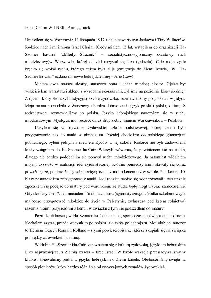 Izrael Chaim WILNER „Arie”, „Jurek” Urodziłem się w Warszawie 14 listopada 1917 r. jako czwarty syn Jachowa i Tiny Willnerów. Rodzice nadali mi imiona Israel Chaim. Kiedy miałem 12 lat, wstąpiłem do organizacji HaSzomer ha-Cair („Młody Strażnik” – socjalistyczno-syjoniczny skautowy ruch młodzieżowy)w Warszawie, której oddział nazywał się ken (gniazdo). Całe moje życie kręciło się wokół ruchu, którego celem była alija (emigracja do Ziemi Izraela). W „HaSzomer ha-Cair” nadano mi nowe hebrajskie imię – Arie (Lew). Miałem dwie starsze siostry, starszego brata i jedną młodszą siostrę. Ojciec był właścicielem warsztatu i sklepu z wyrobami skórzanymi, żyliśmy na poziomie klasy średniej. Z ojcem, który skończył tradycyjną szkołę żydowską, rozmawialiśmy po polsku i w jidysz. Moja mama pochodziła z Warszawy i bardzo dobrze znała język polski i polską kulturę. Z rodzeństwem rozmawialiśmy po polsku. Języka hebrajskiego nauczyłem się w ruchu młodzieżowym. Myślę, że moi rodzice określiliby siebie mianem Warszawiaków – Polaków. Uczyłem się w prywatnej żydowskiej szkole podstawowej, której celem było przygotowanie nas do nauki w gimnazjum. Później chodziłem do polskiego gimnazjum publicznego, byłem jednym z niewielu Żydów w tej szkole. Rodzice nie byli zadowoleni, kiedy wstąpiłem do Ha-Szomer ha-Cair. Wierzyli wówczas, że powinienem iść na studia, dlatego nie bardzo podobał im się pomysł ruchu młodzieżowego. Ja natomiast widziałem moją przyszłość w realizacji idei syjonistycznej. Kłótnie pomiędzy nami stawały się coraz poważniejsze, ponieważ spędzałem więcej czasu z moim kenem niż w szkole. Pod koniec 10. klasy postanowiłem zrezygnować z nauki. Moi rodzice bardzo się zdenerwowali i ostatecznie zgodziłem się podejść do matury pod warunkiem, że studia będę mógł wybrać samodzielnie. Gdy skończyłem 17. lat, musiałem iść do hachshara (syjonistycznego ośrodka szkoleniowego, mającego przygotować młodzież do życia w Palestynie, zwłaszcza pod kątem rolnictwa) razem z moimi przyjaciółmi z kenu i w związku z tym nie podszedłem do matury. Poza działalnością w Ha-Szomer ha-Cair i nauką sporo czasu poświęcałem lekturom. Kochałem czytać, przede wszystkim po polsku, ale także po hebrajsku. Moi ulubieni autorzy to Herman Hesse i Romain Rolland – słynni powieściopisarze, którzy skupiali się na związku pomiędzy człowiekiem a naturą. W klubie Ha-Szomer Ha-Cair, zapoznałem się z kulturą żydowską, językiem hebrajskim i, co najważniejsze, z Ziemią Izraela – Erec Israel. W każde wakacje przesiadywaliśmy w klubie i śpiewaliśmy pieśni w języku hebrajskim o Ziemi Izraela. Obchodziliśmy święta na sposób pionierów, który bardzo różnił się od zwyczajowych rytuałów żydowskich. W końcu wiosną 1939 roku trafiłem do Słonimia, gdzie przygotowywałem się do wyjazdu do Izraela. 1 września odwiedziłem moich rodziców w Warszawie i planowałem poprowadzić grupę w pobliże Łodzi. Kiedy wybuchła wojna, uciekłem na wschód wraz z przyjaciółmi. Po wielu trudnościach dotarliśmy z moim kolegą Peppe do Wilna. Było tam wyjątkowo ciężko – przede wszystkim dlatego, że tęskniłem za Warszawą, za rodziną, przyjaciółmi, miejscami itd. Postanowiłem zorganizować czytelnię. Jedynym miejscem, w którym mogliśmy spokojnie siedzieć i czytać, było mieszkanie naszych przyjaciół. W lutym 1941 r. Peppe otrzymał certyfikat zezwalający mu na wyjazd do Ziemi Izraela, a ja zostałem w Wilnie. Pracowałem wówczas jako grafik i autor scenografii w teatrze. Czekałem na swoją kolej. Mówiłem wówczas, że droga do Ziemi Izraela nie prowadzi przez Warszawę. Postanowiłem, że nie wrócę do Warszawy tak długo, jak są tam Niemcy. 22 czerwca 1941 r. Niemcy weszli do Wilna i z każdym dniem coraz mniej wierzyłem, że zobaczę ziemię Izraela.