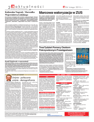 2 aktualności 26 lutego 2015 r Ziemia Piotrkowska Kulturalne Nagrody Marszałka Województwa Łódzkiego Do 16 marca br. trwał będzie nabór wniosków o przyznanie Nagród Marszałka Województwa Łódzkiego za osiągnięcia w dziedzinie twórczości artystycznej, upowszechniania i ochrony dóbr kultury oraz szczególne zaangażowanie w pracę na rzecz kultury - w kategoriach: „Całokształt działalności”, „Osobowość”, „Dziennikarz”, „Regio Kultura”oraz „Gmina – w centrum kultury”. - Mam szczególną satysfakcję z możliwości honorowania raz w roku osób, wnoszących szczególny wkład w rozwój naszego życia kulturalnego – mówi marszałek województwa łódzkiego Witold Stępień. – Jestem przekonany, że te wyróżnienia są twórczą i organizacyjną inspiracją nie tylko dla nagrodzonych, ale także dla środowisk, z których nagrodzeni wywodzą się oraz instytucji, które zgłaszają kandydatów. Na przełomie września i października 2014 r., w czasie wojewódzkiej inauguracji sezonu kulturalnego 2014/2015 Nagrody Marszałka Województwa Łódzkiego w poszczególnych kategoriach otrzymali: „Dziennikarz” – Łukasz Kaczyński (Dziennik Łódzki) i Bogdan Sobieszek (Kalejdoskop), „Osobowość” – wiolonczelista Tomasz Daroch i aktorka Agnieszka Skrzypczak, „Całokształt działalności” - Kapela ludowa Tadeusza Kubiaka z Leśmierza, Henryka Kociołek (pow. pabianicki), Maria Morzuch z Muzeum Sztuki w Łodzi, Orkiestra Reprezentacyjna Gminnego Ośrodka Kultury i Sportu w Białej, wirtuoz organowy prof. Mirosław Pietkiewicz oraz Anna Kosendek z Radomska i solistka Teatru Wielkiego Agnieszka Makówka – Saciuk. Nagroda Marszałka Województwa Łódzkiego to wyróżnienie i uhonorowanie osób i podmiotów, w sposób szczególny przyczyniających się do rozwoju kultury i promocji województwa łódzkiego. Przyznawana jest w szczególności artystom, organizatorom i promotorom działalności kulturalnej, osobom mającym szczególne osiągnięcia w pracy na rzecz kultury, podnoszenia jej jakości, wnoszenia istotnego wkładu w poszerzanie i promocję oferty kulturalnej regionu, popularyzatorom kultury, a także innym podmiotom prowadzącym działalność kulturalną. Aplikacje mogą składać przedstawiciele administracji państwowej, samorządowej, instytucji kultury, szkół i uczelni artystycznych, a także inne podmioty, działające na rzecz kultury i jej promocji, w tym media. Dokumenty konkursowe dostępne są na stronie: www.lodzkie.pl (zakładka: Kultura/Nagrody). Szczegółowe informacje na temat możliwości wnioskowania o przyznanie Nagrody Marszałka Województwa Łódzkiego można uzyskać w Departamencie Kultury i Edukacji Urzędu Marszałkowskiego Województwa Łódzkiego. Kontakt: Wydział ds. Mecenatu Kultury i Ochrony Dziedzictwa Narodowego, Magdalena Sowińska, tel.: 42/ 291 98 27, e-mail: [email protected]. Kamil Majchrzak w reprezentacji KAMIL MAJCHRZAK, uznawany za najzdolniejszego zawodnika tenisa ziemnego młodego pokolenia, coraz śmielej poczyna sobie w grze wśród seniorów. Piotrkowianin został powołany do reprezentacji Polski na mecz pierwszej rundy grupy I Strefy Euroafrykańskiej Pucharu Davisa. Polacy w dniach 6-8 marca zmierzą się z Litwą.Zawody zostaną rozegrane w Płocku. Oprócz Kamila Majchrzaka w kadrze znaleźli się: Jerzy Janowicz, Łukasz Kubot oraz Marcin Matkowski. Po ogłoszeniu składu drużyny narodowej Kamil Majchrzak nie krył radości i wzruszenia. STANISŁAW STĘPIEŃ Od 1 marca wzrośnie wysokość świadczeń emerytalno-rentowych wypłacanych przez Zakład Ubezpieczeń Społecznych. Jest to efekt corocznej marcowej waloryzacji. rent z tytułu wypadku przy pracy lub choroby zawodowej oraz rent inwalidów wojennych i wojskowych), 18 zł - w przypadku emerytury częściowej. W 2015 r. waloryzacja polega na podwyższeniu kwoty świadczenia w wysokości przysługującej w dniu 28 lutego 2015 r. wskaźnikiem waloryzacji wynoszącym 100,68%, przy czym kwota podwyżki nie może być niższa niż: 36 zł - w przypadku emerytur (ustalanych zarówno w myśl dotychczasowych, jak i zreformowanych zasad), emerytur pomostowych, nauczycielskich świadczeń kompensacyjnych, rent z tytułu całkowitej niezdolności do pracy (w tym rent z tytułu wypadku przy pracy lub choroby zawodowej oraz rent inwalidów wojennych i wojskowych), rent rodzinnych, świadczeń i zasiłków przedemerytalnych; 27 zł - w przypadku rent z tytułu częściowej niezdolności do pracy (w tym Przykład Emerytura wynosząca na dzień 28 lutego 2015 r. - 1230,46 zł w wyniku waloryzacji jest mnożona przez wskaźnik 100,68% i wynosi 1238,46 zł, czyli jej wzrost to 8,36 zł. Jest to kwota niższa od gwarantowanej, tj. 36 zł. Emerytura zostanie podniesiona o kwotę gwarantowaną i będzie wynosiła 1266,10 zł. Zakład Ubezpieczeń Społecznych waloryzuje świadczenia z urzędu, co oznacza, że nie trzeba zgłaszać w tej sprawie wniosku. Wyższa emerytura czy renta będzie wypłacana w terminach, w których poszczególni emeryci i renciści otrzymują świadczenia. Każdy świadczeniobiorca otrzyma decyzję Zakładu Ubezpieczeń Społecznych, w dzie 2009 roku, a już... w 2014 roku powrócono do tematu. I odnoszę wciąż wrażenie, że prezydent Rosji spokojnie raealizuje swój plan, który przez Unię uznany został za swój. Chociaż Zachód wciąż grzmi. - Na Rosję nałożone zostaną kolejne unijne sankcje, jeśli prorosyjscy separatyści zaatakują ukraiński port Mariupol nad Morzem Azowskim - ostrzegł francuski minister spraw zagranicznych Laurent Fabius. Bo zdobycie kontroli nad tym miastem przez siły rebelianckie zapewniłoby Moskwie bezpośredni lądowy korytarz do zaanektowanego w ubiegłym roku Krymu. I moim zdaniem tak się stanie, a Europa Zachodnia uzna poniewczasie, że wobec braku wspólnego stanowiska UE nie dało się wcześniej podjąć jednoznacznej decyzji. I taki pewnie będzie finał. Fina