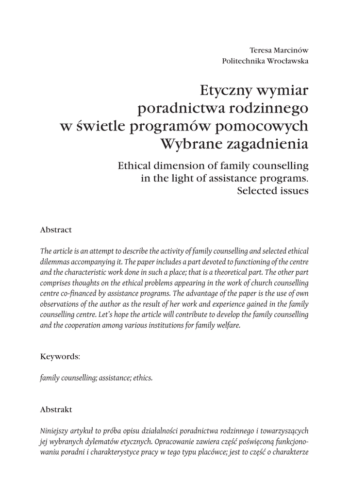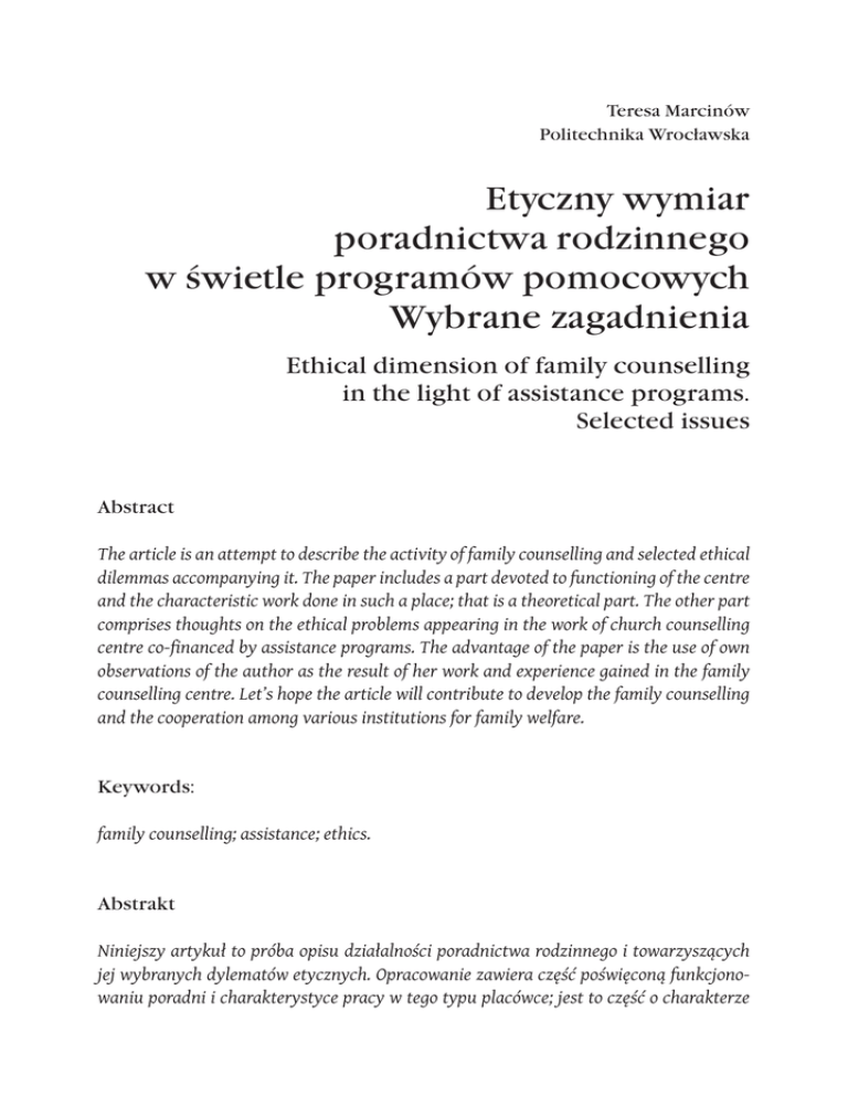 Teresa Marcinów Politechnika Wrocławska Etyczny wymiar poradnictwa rodzinnego w świetle programów pomocowych Wybrane zagadnienia Ethical dimension of family counselling in the light of assistance programs. Selected issues Abstract The article is an attempt to describe the activity of family counselling and selected ethical dilemmas accompanying it. The paper includes a part devoted to functioning of the centre and the characteristic work done in such a place; that is a theoretical part. The other part comprises thoughts on the ethical problems appearing in the work of church counselling centre co-financed by assistance programs. The advantage of the paper is the use of own observations of the author as the result of her work and experience gained in the family counselling centre. Let’s hope the article will contribute to develop the family counselling and the cooperation among various institutions for family welfare. Keywords: family counselling; assistance; ethics. Abstrakt Niniejszy artykuł to próba opisu działalności poradnictwa rodzinnego i towarzyszących jej wybranych dylematów etycznych. Opracowanie zawiera część poświęconą funkcjonowaniu poradni i charakterystyce pracy w tego typu placówce; jest to część o charakterze 224 Teresa Marcinów bardziej teoretycznym. Druga część zawiera refleksje na temat problemów etycznych, które pojawiają się w pracy poradni przykościelnych współfinansowanych przez programy pomocowe. Zaletą publikacji jest wykorzystanie własnych obserwacji autorki jako praktyka i doświadczenia pracy w poradni rodzinnej. Można mieć nadzieję, że artykuł przyczyni się do rozwoju poradnictwa i współpracy różnych instytucji dla dobra rodziny. Słowa kluczowe: poradnictwo rodzinne; pomoc; etyka. Celem niniejszego artykułu jest zaprezentowanie ogólnych założeń funkcjonowania poradni rodzinnej oraz wybranych dylematów etycznych pojawiających się w trakcie realizowania pomocy z zakresu poradnictwa rodzinnego. Dodatkowym elementem pracy będzie zaprezentowanie przykładów zaczerpniętych z doświadczeń własnych autora w realizowaniu programów pomocowych. Skromne ramy niniejszego opracowania nie pozwalają na wnikliwą analizę opisywanych zagadnień, dlatego omawianie problemów będzie mieć charakter ogólny. Zabieg taki zastosowano celowo, aby nie wnikać w meandry poszczególnych przypadków, a jedynie wskazać obszary wątpliwości etycznych towarzyszących realizacji projektu. Można żywić nadzieję, że w dalszej perspektywie prezentowane obserwacje staną się drobnym, acz konstruktywnym głosem w debacie nad kierunkami rozwoju działań wspierających rodzinę. 1. Relacja pomocy – relacją etyczną Jedną z głównych idei przyświecających rozwojowi poradnictwa i rozbudowie sieci poradni było otoczenie opieką ludzi potrzebujących merytorycznego wsparcia w polepszeniu swoich relacji z bliskimi oraz zapewnienie pomocy rodzinom znajdującym się w trudnej sytuacji (Dudziak, Koszałka, Młyński 2013, 211). Warto nadmienić, że poradnictwo to przede wszystkim zinstytucjonalizowany system pomagania, który ma swoje kulturowe i prawne formy (Szczukiewicz 2005, 19). Dopełnia tym samym nieprofesjonalną pomoc, na przykład psychologiczną, która udzielana jest w sposób spontaniczny. Dzieje się tak często w momencie pocieszania kogoś, współodczuwania i współprzeżywania emocji. W wyjątkowych sytuacjach pomoc ta przybiera formę zorganizowanych działań samopomocowych opartych na wspólnocie doświadczeń i wynikających z funk- Etyczny wymiar poradnictwa rodzinnego w świetle programów pomocowych 225 cjonowania więzi społecznych. Do takich działań zaliczyć można grupy wsparcia, jakimi są na przykład Kluby Abstynenta (Szczukiewicz 2005, 18). W tym miejscu warto przytoczyć wybrane definicje poradnictwa, które można rozumieć na różne sposoby: jako „osobowy kontakt pomocowy”, działalność zorganizowaną lub formę pomocy społecznej (Kargulowa 2005, 47–55). Z kolei według S. Murgatroyd godnym uwagi w tego typu działaniach jest aspekt pokonywania trudności w osobistym rozwoju (Murgatroyd 2000, 16). Dopełnieniem podanych definicji jest wspólne dla wszystkich wspomnianych określeń znaczenie spotkania człowieka z człowiekiem, z całym bogactwem lub ubóstwem jego doświadczeń, określonymi wyobrażeniami na temat relacji międzyludzkich, a także utrwalonymi postawami, możliwościami i ograniczeniami. Pod terminem „poradnictwo” mogą kryć się różne formy i obszary oddziaływania, natomiast pierwszoplanową działalnością poradni pozostaje kontakt i relacja osoby radzącej się i udzielającej porad. Obszar objęty pomocą w ramach tego rodzaju działań wspierających rodzinę może dotyczyć poradnictwa prawnego, psychologicznego, pedagogiczno-rodzinnego oraz interwencji kryzysowych (Jasnoch 2014). W poradniach przyparafialnych prowadzone są także dyżury doradców życia rodzinnego. Dopiero na dalszym planie znajdują się rozważania dotyczące tego, w jakim stopniu poradnia jest instytucją, zapleczem technicznym lub finansowym zapewniającym wsparcie i skuteczność działań. Można zatem na różnych poziomach i w różnych obszarach dostrzec etyczny aspekt takiej działalności. Funkcjonowanie poradni jest osadzone w aktualnych uwarunkowaniach społeczno-ekonomicznych. Niemniej jednak, mimo zmieniających się ograniczeń finansowych, do standardów udzielania pomocy w ramach poradnictwa rodzinnego należą: bezpłatność, poufność, profesjonalizm, etyka, dostępność (Jasnoch 2014). Spróbujmy pochylić się zatem nad ogólną charakterystyką pracy poradni i wybranymi aspektami pomocy, jakimi są: anonimowość nawiązująca do potrzeby poufności i profesjonalizm udzielanej pomocy w poradniach umiejscowionych przy kościołach i objętych wsparciem finansowym programów pomocowych. Sama proweniencja tychże nie jest istotą rozważań, a jedynie o