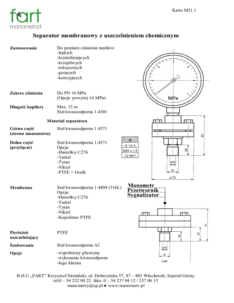 Karta M21.1 Separator membranowy z uszczelnieniem chemicznym Zastosowanie Do pomiaru ciśnienia mediów: -lepkich -krystalizujących -krzepliwych -toksycznych -gorących -korozyjnych Zakres ciśnienia Do PN 16 MPa (Opcja: powyżej 16 MPa) Długość kapilary Max. 15 m Stal kwasoodporna 1.4301 Materiał separatora Górna część (strona manometru) Stal kwasoodporna 1.4571 Dolna część (przyłącze) Stal kwasoodporna 1.4571 Opcja: -Hastelloy C276 -Tantal -Tytan -Nikiel -PTFE + Grafit Membrana Stal kwasoodporna 1.4404 (316L) Opcja: -Hastelloy C276 -Tantal -Tytan -Nikiel -Kopolimer PTFE Pierścień uszczelniający PTFE Śrubowanie Stal kwasoodporna A2 Opcje -wypełniony gliceryną -wykonanie kwasoodporne -logo klienta B.H.U.„FART” Krzysztof Siemiński, ul. Dobrzyńska 57, 87 – 801 Włocławek; Szpetal Górny tel.0 – 54 232 00 22 faks: 0 – 54 237 04 12 / 237 06 15 [email protected] ● www.manometr.pl Karta M21.2 Separator membranowy z uszczelnieniem chemicznym B.H.U.„FART” Krzysztof Siemiński, ul. Dobrzyńska 57, 87 – 801 Włocławek; Szpetal Górny tel.0 – 232 00 22 faks: 0 – 54 237 04 12 / 237 06 15 [email protected] ● www.manometr.pl