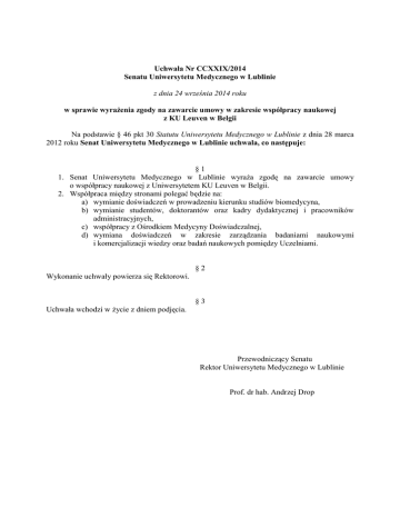 Uchwała Nr CCXXIX/2014 Senatu Uniwersytetu Medycznego w Lublinie z dnia 24 września 2014 roku w sprawie wyrażenia zgody na zawarcie umowy w zakresie współpracy naukowej z KU Leuven w Belgii Na podstawie § 46 pkt 30 Statutu Uniwersytetu Medycznego w Lublinie z dnia 28 marca 2012 roku Senat Uniwersytetu Medycznego w Lublinie uchwala, co następuje: §1 1. Senat Uniwersytetu Medycznego w Lublinie wyraża zgodę na zawarcie umowy o współpracy naukowej z Uniwersytetem KU Leuven w Belgii. 2. Współpraca między stronami polegać będzie na: a) wymianie doświadczeń w prowadzeniu kierunku studiów biomedycyna, b) wymianie studentów, doktorantów oraz kadry dydaktycznej i pracowników administracyjnych, c) współpracy z Ośrodkiem Medycyny Doświadczalnej, d) wymiana doświadczeń w zakresie zarządzania badaniami naukowymi i komercjalizacji wiedzy oraz badań naukowych pomiędzy Uczelniami. §2 Wykonanie uchwały powierza się Rektorowi. §3 Uchwała wchodzi w życie z dniem podjęcia. Przewodniczący Senatu Rektor Uniwersytetu Medycznego w Lublinie Prof. dr hab. Andrzej Drop
