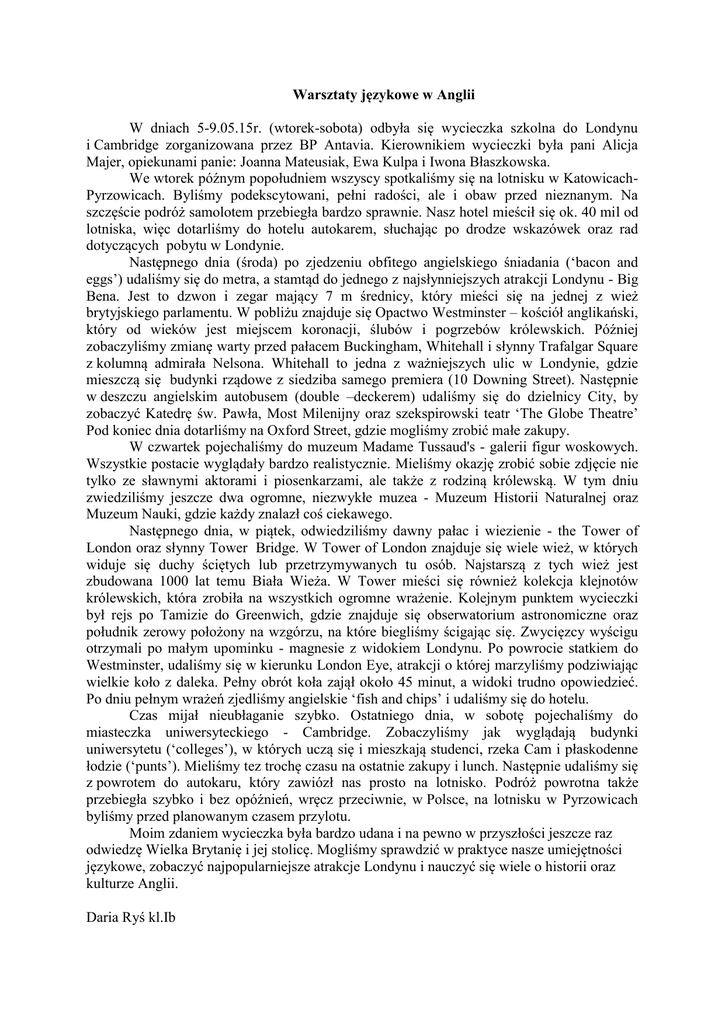 Warsztaty językowe w Anglii W dniach 5-9.05.15r. (wtorek-sobota) odbyła się wycieczka szkolna do Londynu i Cambridge zorganizowana przez BP Antavia. Kierownikiem wycieczki była pani Alicja Majer, opiekunami panie: Joanna Mateusiak, Ewa Kulpa i Iwona Błaszkowska. We wtorek późnym popołudniem wszyscy spotkaliśmy się na lotnisku w KatowicachPyrzowicach. Byliśmy podekscytowani, pełni radości, ale i obaw przed nieznanym. Na szczęście podróż samolotem przebiegła bardzo sprawnie. Nasz hotel mieścił się ok. 40 mil od lotniska, więc dotarliśmy do hotelu autokarem, słuchając po drodze wskazówek oraz rad dotyczących pobytu w Londynie. Następnego dnia (środa) po zjedzeniu obfitego angielskiego śniadania (‘bacon and eggs’) udaliśmy się do metra, a stamtąd do jednego z najsłynniejszych atrakcji Londynu - Big Bena. Jest to dzwon i zegar mający 7 m średnicy, który mieści się na jednej z wież brytyjskiego parlamentu. W pobliżu znajduje się Opactwo Westminster – kościół anglikański, który od wieków jest miejscem koronacji, ślubów i pogrzebów królewskich. Później zobaczyliśmy zmianę warty przed pałacem Buckingham, Whitehall i słynny Trafalgar Square z kolumną admirała Nelsona. Whitehall to jedna z ważniejszych ulic w Londynie, gdzie mieszczą się budynki rządowe z siedziba samego premiera (10 Downing Street). Następnie w deszczu angielskim autobusem (double –deckerem) udaliśmy się do dzielnicy City, by zobaczyć Katedrę św. Pawła, Most Milenijny oraz szekspirowski teatr ‘The Globe Theatre’ Pod koniec dnia dotarliśmy na Oxford Street, gdzie mogliśmy zrobić małe zakupy. W czwartek pojechaliśmy do muzeum Madame Tussaud's - galerii figur woskowych. Wszystkie postacie wyglądały bardzo realistycznie. Mieliśmy okazję zrobić sobie zdjęcie nie tylko ze sławnymi aktorami i piosenkarzami, ale także z rodziną królewską. W tym dniu zwiedziliśmy jeszcze dwa ogromne, niezwykłe muzea - Muzeum Historii Naturalnej oraz Muzeum Nauki, gdzie każdy znalazł coś ciekawego. Następnego dnia, w piątek, odwiedziliśmy dawny pałac i wiezienie - the Tower of London oraz słynny Tower Bridge. W Tower of London znajduje się wiele wież, w których widuje się duchy ściętych lub przetrzymywanych tu osób. Najstarszą z tych wież jest zbudowana 1000 lat temu Biała Wieża. W Tower mieści się również kolekcja klejnotów królewskich, która zrobiła na wszystkich ogromne wrażenie. Kolejnym punktem wycieczki był rejs po Tamizie do Greenwich, gdzie znajduje się obserwatorium astronomiczne oraz południk zerowy położony na wzgórzu, na które biegliśmy ścigając się. Zwycięzcy wyścigu otrzymali po małym upominku - magnesie z widokiem Londynu. Po powrocie statkiem do Westminster, udaliśmy się w kierunku London Eye, atrakcji o której marzyliśmy podziwiając wielkie koło z daleka. Pełny obrót koła zajął około 45 minut, a widoki trudno opowiedzieć. Po dniu pełnym wrażeń zjedliśmy angielskie ‘fish and chips’ i udaliśmy się do hotelu. Czas mijał nieubłaganie szybko. Ostatniego dnia, w sobotę pojechaliśmy do miasteczka uniwersyteckiego - Cambridge. Zobaczyliśmy jak wyglądają budynki uniwersytetu (‘colleges’), w których uczą się i mieszkają studenci, rzeka Cam i płaskodenne łodzie (‘punts’). Mieliśmy tez trochę czasu na ostatnie zakupy i lunch. Następnie udaliśmy się z powrotem do autokaru, który zawiózł nas prosto na lotnisko. Podróż powrotna także przebiegła szybko i bez opóźnień, wręcz przeciwnie, w Polsce, na lotnisku w Pyrzowicach byliśmy przed planowanym czasem przylotu. Moim zdaniem wycieczka była bardzo udana i na pewno w przyszłości jeszcze raz odwiedzę Wielka Brytanię i jej stolicę. Mogliśmy sprawdzić w praktyce nasze umiejętności językowe, zobaczyć najpopularniejsze atrakcje Londynu i nauczyć się wiele o historii oraz kulturze Anglii. Daria Ryś kl.Ib