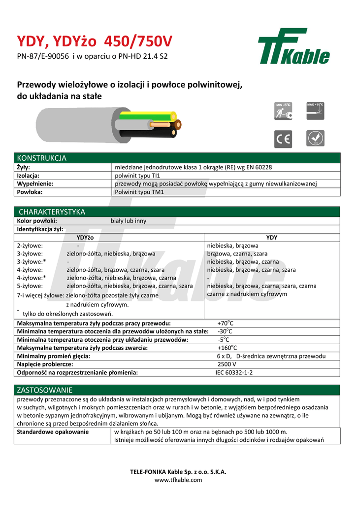YDY, YDYżo 450/750V PN-87/E-90056 i w oparciu o PN-HD 21.4 S2 Przewody wielożyłowe o izolacji i powłoce polwinitowej, do układania na stałe KONSTRUKCJA Żyły: Izolacja: Wypełnienie: Powłoka: miedziane jednodrutowe klasa 1 okrągłe (RE) wg EN 60228 polwinit typu TI1 przewody mogą posiadad powłokę wypełniającą z gumy niewulkanizowanej Polwinit typu TM1 CHARAKTERYSTYKA Kolor powłoki: Identyfikacja żył: biały lub inny YDYżo YDY 2-żyłowe: niebieska, brązowa 3-żyłowe: zielono-żółta, niebieska, brązowa brązowa, czarna, szara 3-żyłowe:* niebieska, brązowa, czarna 4-żyłowe: zielono-żółta, brązowa, czarna, szara niebieska, brązowa, czarna, szara 4-żyłowe:* zielono-żółta, niebieska, brązowa, czarna 5-żyłowe: zielono-żółta, niebieska, brązowa, czarna, szara niebieska, brązowa, czarna, szara, czarna czarne z nadrukiem cyfrowym 7-i więcej żyłowe: zielono-żółta pozostałe żyły czarne z nadrukiem cyfrowym. * tylko do określonych zastosowao. Maksymalna temperatura żyły podczas pracy przewodu: +70oC Minimalna temperatura otoczenia dla przewodów ułożonych na stałe: -30oC Minimalna temperatura otoczenia przy układaniu przewodów: -5oC Maksymalna temperatura żyły podczas zwarcia: +160oC Minimalny promieo gięcia: 6 x D, D-średnica zewnętrzna przewodu Napięcie probiercze: 2500 V Odpornośd na rozprzestrzenianie płomienia: IEC 60332-1-2 ZASTOSOWANIE przewody przeznaczone są do układania w instalacjach przemysłowych i domowych, nad, w i pod tynkiem w suchych, wilgotnych i mokrych pomieszczeniach oraz w rurach i w betonie, z wyjątkiem bezpośredniego osadzania w betonie sypanym jednofrakcyjnym, wibrowanym i ubijanym. Mogą byd również używane na zewnątrz, o ile chronione są przed bezpośrednim działaniem słooca. Standardowe opakowanie w krążkach po 50 lub 100 m oraz na bębnach po 500 lub 1000 m. Istnieje możliwośd oferowania innych długości odcinków i rodzajów opakowao TELE-FONIKA Kable Sp. z o.o. S.K.A. www.tfkable.com YDY, YDYżo 450/750V PN-87/E-90056 i w oparciu o PN-HD 21.4 S2 CERTYFIKATY I UZNANIA BBJ, GOST Przybliżona średnica przewodu Przybliżona waga przewodu Maksymalna rezystancja żył w 20 C mm kg/km 2x1 2x1,5 2x2,5 2x4 2x6 2x10 6,8 7,3 8,1 9,4 10,4 13,0 69 84 112 160 211 339 /km 18,1 12,1 7,41 4,61 3,08 1,83 3x1 3x1,5 3x2,5 3x4 3x6 3x10 7,2 7,7 8,6 10,0 11,2 13,8 82 102 139 201 274 435 18,1 12,1 7,41 4,61 3,08 1,83 4x1 4x1,5 4x2,5 4x4 4x6 4x10 7,8 8,4 9,4 11,1 12,3 15,2 99 125 171 255 342 546 18,1 12,1 7,41 4,61 3,08 1,83 5x1 5x1,5 5x2,5 5x4 5x6 5x10 8,5 9,2 10,2 12,2 13,5 16,7 121 153 210 314 423 680 18,1 12,1 7,41 4,61 3,08 1,83 7x1 7x1,5 7x2,5 7x4 7x6 7x10 9,2 10,0 11,3 13,3 14,8 18,3 149 191 272 402 547 884 18,1 12,1 7,41 4,61 3,08 1,83 10x1 10x1,5 11,6 12,8 212 278 18,1 12,1 Liczba i przekrój znamionowy żył n x mm 2 TELE-FONIKA Kable Sp. z o.o. S.K.A. www.tfkable.com YDY, YDYżo 450/750V PN-87/E-90056 i w oparciu o PN-HD 21.4 S2 Liczba i przekrój znamionowy żył n x mm Przybliżona średnica przewodu Przybliżona waga przewodu Maksymalna rezystancja żył w 20 C mm kg/km /km 7,41 4,61 3,08 1,83 2 10x2,5 14,4 10x4 17,0 10x6 19,0 10x10 23,9 Przewody z 5, 7 i 10 żyłami wykonane wg ZN-93/MP-13-K12175 388 575 784 1281 Obciążalnośd prądowa wg DIN VDE 0298 częśd 4 Temperatura żyły przewodu 70oC; temperatura otoczenia 30oC Sposób wykonania instalacji Wielożyłowy przewód instalacyjny w powłoce w rurze elektroinstalacyjnej w izolowanej cieplnie ścianie Liczba obciążonych żył Przekrój znamionowy żyły, mm2 1,5 2,5 4 6 10 Wielożyłowy przewód instalacyjny w powłoce w rurze elektroinstalacyjnej na ścianie 3 1) 2 3 1) 2 Jedno lub wielożyłowy przewód instalacyjny w powłoce ułożony na ścianie 2 3 1) 2 3 1) 17,5 24 32 41 57 22 30 40 51 70 18,5 25 34 43 60 Obciążalnośd prądowa (A) 15,5 18,5 25 32 43 13,0 17,5 23 29 39 16,5 23 30 38 52 15,0 20 27 34 46 19,5 27 36 46 63 Współczynniki korekcyjne dla obciążalności prądowej w zależności od temperatury otoczenia Temperatura otoczenia °C 30 35 40 45 50 55 Współczynniki korekcyjne Wielożyłowy przewód instalacyjny w powłoce w odstępie co minimum 0,3 x średnica d od ściany 1,00 0,94 0,87 0,79 TELE-FONIKA Kable Sp. z o.o. S.K.A. www.tfkable.com 0,71 0,61 60 0,50 65 0,35 YDY, YDYżo 450/750V PN-87/E-90056 i w oparciu o PN-HD 21.4 S2 1) Współczynniki korekcyjne dla przewodów wielożyłowych ( 5 żyłowe) Liczba obciążonych żył Współczynniki korekcyjne 5 7 10 0,75 0,65 0,55 Wszystkie informacje zawarte w tym dokumencie włącznie z tabelami i rysunkami zostały podane w dobrej wierze i w przeświadczeniu o ich poprawności w czasie publikacji. Informacje te nie stanowią gwarancji ani podstawy do ponoszenia odpowiedzialności prawnej przez Tele-Fonika Kable Sp. z o.o. S.K.A. Tele-Fonika Kable Sp. z o.o. S.K.A rezerwuje prawo do wprowadzenia zmian w dokumencie w każdej chwili TELE-FONIKA Kable Sp. z o.o. S.K.A. www.tfkable.com