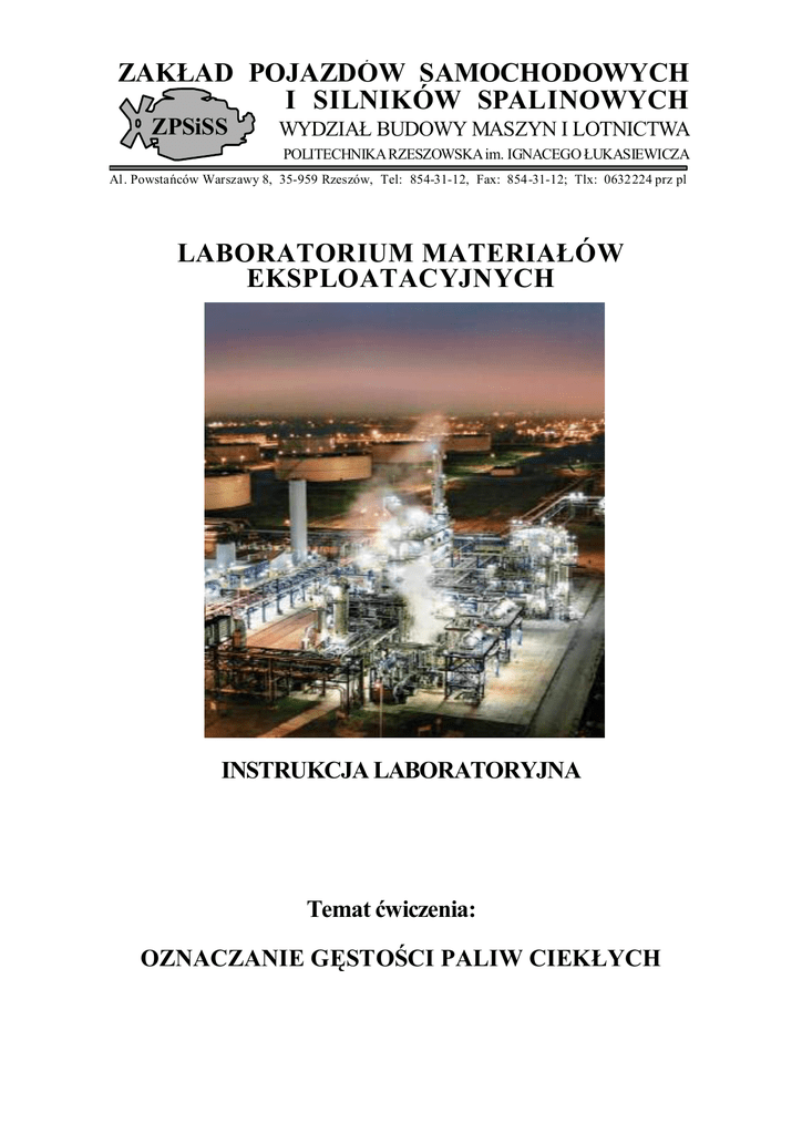 ZAK AD POJAZDÓW SAMOCHODOWYCH I SILNIKÓW SPALINOWYCH ZPSiSS WYDZIA BUDOWY MASZYN I LOTNICTWA POLITECHNIKA RZESZOWSKA im. IGNACEGO UKASIEWICZA Al. Powsta!ców Warszawy 8, 35-959 Rzeszów, Tel: 854-31-12, Fax: 854-31-12; Tlx: 0632224 prz pl LABORATORIUM MATERIA ÓW EKSPLOATACYJNYCH INSTRUKCJA LABORATORYJNA Temat wiczenia: OZNACZANIE G$STO%CI PALIW CIEK YCH Oznaczanie g:sto;ci paliw ciek=ych 1. WST$P Operacje magazynowania, transportu i dystrybucji paliw p=ynnych, olejów i innych cieczy eksploatacyjnych, wymagajE rozlicze! materia=owych wykonywanych w jednostkach masy (kg, tony, itp.) lub obj:to;ci (litry, m3 itp.). Obrót paliwami p=ynnymi i rozpuszczalnikami cz:sto jest dokonywany w jednostkach masy, podczas gdy pomiar ilo;ci produktu do celów formalnych i finansowych wykonywany w jednostkach obj:to;ci. Przy masowym obrocie produktami, brak umiej:tno;ci wzajemnego przeliczania jednostek masy i obj:to;ci moIe byJ Kród=em powaInych strat lub nieuzasadnionych zysków. W skrajnych przypadkach b=Ed pomiaru moIe dochodziJ do 1,5% warto;ci rzeczywistej. W przypadku olejów i innych cieczy roboczych najcz:;ciej stosowanymi w obrocie jednostkami sE litry, podczas gdy pomiar jest najcz:;ciej wykonywany w kilogramach. Wielko;ciE pozwalajEcE na wzajemne przeliczanie masy i obj:to;ci jest g:sto;J. G:sto;J jest takIe wielko;ciE charakteryzujEcE jako;J niektórych cieczy eksploatacyjnych i pozwalajEcE na odróInienie poszczególnych gatunków tych cieczy, a niekiedy nawet ustalenie, z jakiego zak=adu produkcyjnego pochodzE. 2. POJ$CIE G$STO%CI G:sto;J jest jednE z podstawowych cech materii, jest ona definiowana nast:pujEco: G sto (masa w a ciwa) – jest to masa jednostki obj to ci cia a, lub stosunek masy cia a do jego obj to ci. Z definicji tej wynika, Ie g:sto;J – *, moIe byJ wyraIona jako stosunek masy cia=a – m, do jego obj:to;ci – V, mierzonych w tej samej temperaturze, co wyraIa wzór (1). = m V (1) ObowiEzujEcE jednostkE g:sto;ci, w uk=adzie SI, jest kilogram na metr sze;cienny [kg/m3], a takIe tona na metr sze;cienny [t/m3]. W praktyce takIe jeszcze jest stosowana jednostka CGS [g/cm3] lub [g/ml], a takIe [kg/dm3] lub [kg/l]. W Polsce obowiEzujEcE jednostkE g:sto;ci jest [kg/m3], a dopuszczalnymi tona na metr sze;cienny [t/m3] oraz kilogram na litr [kg/l] . Aktualnie podstawowE temperaturE, dla której podaje si: g:sto;J produktów naftowych jest 15°C. G:sto;J cia=a jest zaleIna od ci;nienia i temperatury. Wraz ze wzrostem ci;nienia g:sto;J cia= wzrasta. ZaleIno;J ta jest szczególnie istotna w przypadku gazów. W przypadku olejów, paliw p=ynnych i innych cieczy eksploatacyjnych Laboratorium Materia=ów Eksploatacyjnych ZAK ADU POJAZDÓW SAMOCHODOWYCH I SILNIKÓW SPALINOWYCH -2- Oznaczanie g:sto;ci paliw ciek=ych moIe byJ pomini:ta, natomiast moIe mieJ istotne znaczenie w przypadku cieczy hydraulicznych. Ze wzrostem temperatury przebieg zmian g:sto;ci dla cieczy i cia= sta=ych staje si: zaleIny od ich budowy chemicznej i krystalograficznej. ZaleIno;J g:sto;ci od temperatury dla przetworów naftowych o róInej g:sto;ci przedstawiono na rys. 1. Rys. 1. ZaleIno;J g:sto;ci niektórych zwiEzków chemicznych i produktów naftowych od temperatury: 1 – glikol etylenowy, 2 – woda, 3 – eter monoetylowy glikolu etylenowego, 4 – benzen, 5 – metanol, 6 – etanol, 7 – cykloheksan, 8 – izooktan (2,2,4 - trimetylopentan), 9 – n-heksan, 10 – n-pentan, 11 – n-butan, 12 – n-propan Wzajemne przeliczanie masy na obj:to;J oraz g:sto;ci w róInych temperaturach, dla celów formalnych i finansowych powinno byJ wykonywane metodami znormalizowanymi, zgodnie z PN-ISO 91-11 oraz PN-ISO 91-22 wg specjalnych tabel ASTM D 12503. IstniejE równieI odpowiednie komputerowe programy przeliczeniowe. 3. POMIAR G$STO%CI Pomiar g:sto;ci moIe byJ wykonywany wieloma przyrzEdami. Najprostszym sposobem jest pomiar przy uIyciu areometru, z jednoczesnym pomiarem temperatury lub cz:;ciej odmianE areometru z wbudowanym termometrem tzw. termoareometrem. Budow: areometru i termoareometru 1 PN-ISO 91-1: 1999 Tablice przeliczeniowe dla przetworów naftowych – Tablice oparte na temperaturach odniesienia 15°C i 60°F. PN-ISO 91-2: 1999 Tablice przeliczeniowe dla przetworów naftowych – Tablice oparte na temperaturze odniesienia 20°C. 3 ASTM D 1250- Petroleum Measurement Tables. 2 Laboratorium Materia=ów Eksploatacyjnych ZAK ADU POJAZDÓW SAMOCHODOWYCH I SILNIKÓW SPALINOWYCH -3- Oznaczanie g:sto;ci paliw ciek=ych przedstawia rys. 2. Najcz:;ciej sE stosowane termoareometry o najmniejszej podzia=ce 0,0005 lub 0,001 g/ml. Zasada pomiaru g:sto;ci areometrem polega na wlaniu badanej cieczy do szklanego cylindra, w=oIeniu do cieczy areometru i odczytaniu, do jakiego poziomu zanurzy si: jego nóIka. G:sto;J p=ynu eksploatacyjnego odczytuje si: na skali termoareometru; dla produktów jasnych (np. paliwa p=ynne) na poziomie cieczy (rys. 3A), dla produktów ciemnych (np. oleje) na wysoko;ci, do której ciecz zwilIa nóIk: areometru (rys. 3B). Rys. 2. Termoareometr (A) i areometr (B) 1 – skala g:sto;ci, 2 – skala temperatury, 3 – obciEInik, 4 – zbiornik rt:ci termometru Rys. 3. Sposób odczytu g:sto;ci produktów przy uIyciu areometru A – dla produktów jasnych, B – dla produktów ciemnych Laboratorium Materia=ów Eksploatacyjnych ZAK ADU POJAZDÓW SAMOCHODOWYCH I SILNIKÓW SPALINOWYCH -4- Oznaczanie g:sto;ci paliw ciek=ych Jak wynika z wzoru (1), g:sto;J produktu (*) moIna obliczyJ gdy znamy jego mas: (m) i obj:to;J (V). UmieszczajEc produkt w naczyniu o znanej obj:to;ci moIna wyznaczyJ jego mas:, waIEc naczynie z produktem, a nast:pnie odejmujEc mas: naczynia. Wi:kszo;J wymaga! na przetwory naftowe, przy pomiarze g:sto;ci wymienia norm: EN-ISO 3675 (PN-EN ISO 3675) lub EN-ISO 12185 (PN-EN ISO 12185). Wed=ug tych norm jako standardowe temperatury odniesienia przyjmuje si: 15°C lub 20°C, natomiast pomiary sE dokonywane w dowolnej temperaturze. W zaleIno;ci od tego, w jakiej temperaturze by= kalibrowan
