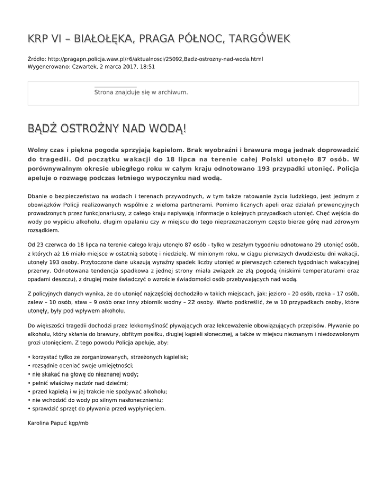 KRP VI – BIAŁOŁĘKA, PRAGA PÓŁNOC, TARGÓWEK Źródło: http://pragapn.policja.waw.pl/r6/aktualnosci/25092,Badz-ostrozny-nad-woda.html Wygenerowano: Czwartek, 2 marca 2017, 18:51 Strona znajduje się w archiwum. BĄDŹ OSTROŻNY NAD WODĄ! Wolny czas i piękna pogoda sprzyjają kąpielom. Brak wyobraźni i brawura mogą jednak doprowadzić do tragedii. Od początku wakacji do 18 lipca na terenie całej Polski utonęło 87 osób. W porównywalnym okresie ubiegłego roku w całym kraju odnotowano 193 przypadki utonięć. Policja apeluje o rozwagę podczas letniego wypoczynku nad wodą. Dbanie o bezpieczeństwo na wodach i terenach przywodnych, w tym także ratowanie życia ludzkiego, jest jednym z obowiązków Policji realizowanych wspólnie z wieloma partnerami. Pomimo licznych apeli oraz działań prewencyjnych prowadzonych przez funkcjonariuszy, z całego kraju napływają informacje o kolejnych przypadkach utonięć. Chęć wejścia do wody po wypiciu alkoholu, długim opalaniu czy w miejscu do tego nieprzeznaczonym często bierze górę nad zdrowym rozsądkiem. Od 23 czerwca do 18 lipca na terenie całego kraju utonęło 87 osób - tylko w zeszłym tygodniu odnotowano 29 utonięć osób, z których aż 16 miało miejsce w ostatnią sobotę i niedzielę. W minionym roku, w ciągu pierwszych dwudziestu dni wakacji, utonęły 193 osoby. Przytoczone dane ukazują wyraźny spadek liczby utonięć w pierwszych czterech tygodniach wakacyjnej przerwy. Odnotowana tendencja spadkowa z jednej strony miała związek ze złą pogodą (niskimi temperaturami oraz opadami deszczu), z drugiej może świadczyć o wzroście świadomości osób przebywających nad wodą. Z policyjnych danych wynika, że do utonięć najczęściej dochodziło w takich miejscach, jak: jezioro – 20 osób, rzeka – 17 osób, zalew – 10 osób, staw – 9 osób oraz inny zbiornik wodny – 22 osoby. Warto podkreślić, że w 10 przypadkach osoby, które utonęły, były pod wpływem alkoholu. Do większości tragedii dochodzi przez lekkomyślność pływających oraz lekceważenie obowiązujących przepisów. Pływanie po alkoholu, który skłania do brawury, obfitym posiłku, długiej kąpieli słonecznej, a także w miejscu nieznanym i niedozwolonym grozi utonięciem. Z tego powodu Policja apeluje, aby: • korzystać tylko ze zorganizowanych, strzeżonych kąpielisk; • rozsądnie oceniać swoje umiejętności; • nie skakać na głowę do nieznanej wody; • pełnić właściwy nadzór nad dziećmi; • przed kąpielą i w jej trakcie nie spożywać alkoholu; • nie wchodzić do wody po silnym nasłonecznieniu; • sprawdzić sprzęt do pływania przed wypłynięciem. Karolina Papuć kgp/mb Ocena: 0/5 (0) Tweetnij