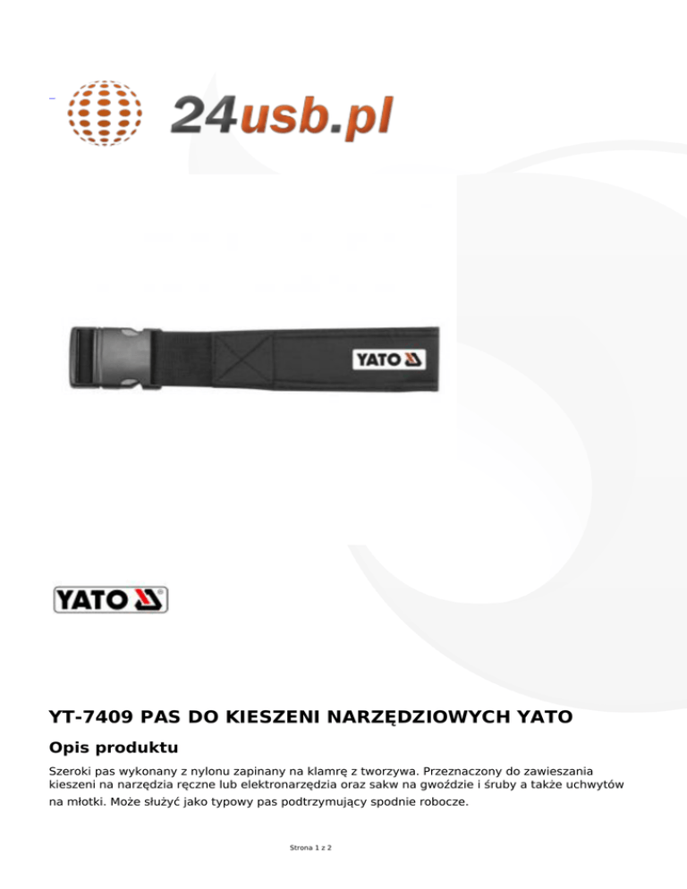 YT-7409 PAS DO KIESZENI NARZĘDZIOWYCH YATO Opis produktu Szeroki pas wykonany z nylonu zapinany na klamrę z tworzywa. Przeznaczony do zawieszania kieszeni na narzędzia ręczne lub elektronarzędzia oraz sakw na gwoździe i śruby a także uchwytów na młotki. Może służyć jako typowy pas podtrzymujący spodnie robocze. Strona 1 z 2 Przeznaczenie / Zastosowanie Do mocowania sakw i kieszeni narzędziowych Dane techniczne Numer artykułu EAN Marka Jednostka Waga (kg) Master Carton MC Inner Box IB Pal Kolor YT-7409 5906083974090 Yato SZT 0.1300 100 50 1200 czarny Strona 2 z 2