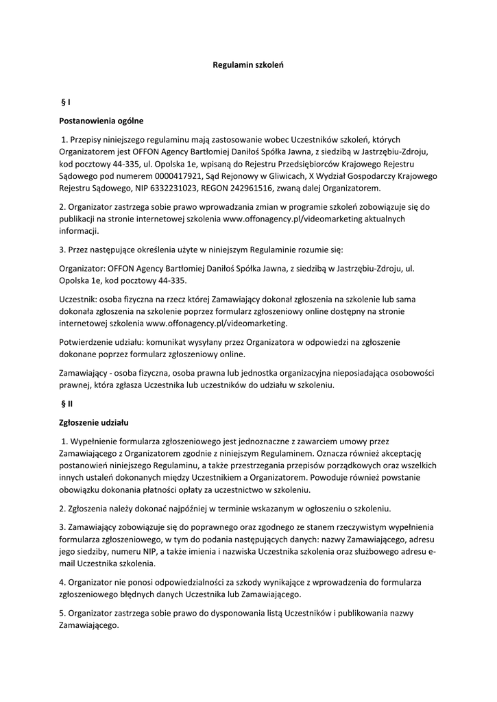 Regulamin szkoleń §I Postanowienia ogólne 1. Przepisy niniejszego regulaminu mają zastosowanie wobec Uczestników szkoleń, których Organizatorem jest OFFON Agency Bartłomiej Daniłoś Spółka Jawna, z siedzibą w Jastrzębiu-Zdroju, kod pocztowy 44-335, ul. Opolska 1e, wpisaną do Rejestru Przedsiębiorców Krajowego Rejestru Sądowego pod numerem 0000417921, Sąd Rejonowy w Gliwicach, X Wydział Gospodarczy Krajowego Rejestru Sądowego, NIP 6332231023, REGON 242961516, zwaną dalej Organizatorem. 2. Organizator zastrzega sobie prawo wprowadzania zmian w programie szkoleń zobowiązuje się do publikacji na stronie internetowej szkolenia www.offonagency.pl/videomarketing aktualnych informacji. 3. Przez następujące określenia użyte w niniejszym Regulaminie rozumie się: Organizator: OFFON Agency Bartłomiej Daniłoś Spółka Jawna, z siedzibą w Jastrzębiu-Zdroju, ul. Opolska 1e, kod pocztowy 44-335. Uczestnik: osoba fizyczna na rzecz której Zamawiający dokonał zgłoszenia na szkolenie lub sama dokonała zgłoszenia na szkolenie poprzez formularz zgłoszeniowy online dostępny na stronie internetowej szkolenia www.offonagency.pl/videomarketing. Potwierdzenie udziału: komunikat wysyłany przez Organizatora w odpowiedzi na zgłoszenie dokonane poprzez formularz zgłoszeniowy online. Zamawiający - osoba fizyczna, osoba prawna lub jednostka organizacyjna nieposiadająca osobowości prawnej, która zgłasza Uczestnika lub uczestników do udziału w szkoleniu. § II Zgłoszenie udziału 1. Wypełnienie formularza zgłoszeniowego jest jednoznaczne z zawarciem umowy przez Zamawiającego z Organizatorem zgodnie z niniejszym Regulaminem. Oznacza również akceptację postanowień niniejszego Regulaminu, a także przestrzegania przepisów porządkowych oraz wszelkich innych ustaleń dokonanych między Uczestnikiem a Organizatorem. Powoduje również powstanie obowiązku dokonania płatności opłaty za uczestnictwo w szkoleniu. 2. Zgłoszenia należy dokonać najpóźniej w terminie wskazanym w ogłoszeniu o szkoleniu. 3. Zamawiający zobowiązuje się do poprawnego oraz zgodnego ze stanem rzeczywistym wypełnienia formularza zgłoszeniowego, w tym do podania następujących danych: nazwy Zamawiającego, adresu jego siedziby, numeru NIP, a także imienia i nazwiska Uczestnika szkolenia oraz służbowego adresu email Uczestnika szkolenia. 4. Organizator nie ponosi odpowiedzialności za szkody wynikające z wprowadzenia do formularza zgłoszeniowego błędnych danych Uczestnika lub Zamawiającego. 5. Organizator zastrzega sobie prawo do dysponowania listą Uczestników i publikowania nazwy Zamawiającego. 6. Organizator zastrzega sobie prawo do wprowadzania zmian w planie szkolenia, o czym informuje Uczestników za pośrednictwem strony internetowej szkolenia www.offonagency.pl/videomarketing 7. Zamawiający wypełniając formularz zgłoszeniowy jest zobligowany do wyrażenia lub niewyrażenia zgody na przetwarzanie danych osobowych w zakresie wskazanym w niniejszym regulaminie, przy czym wrażenie zgody na przetwarzanie danych osobowych jest warunkiem niezbędnym dla realizacji usługi. 8. Zamawiający może przy wypełnieniu formularza zgłoszeniowego wyrazić chęć i zgodę na przesyłanie środkami komunikacji elektronicznej dodatkowej informacji handlowej i marketingowej. Zamawiający, która chce cofnąć taką zgodę, zobowiązany jest do pisemnego poinformowania Organizatora o takiej decyzji środkami komunikacji elektronicznej na adres [email protected] 9. Organizator wysyła Zamawiającemu potwierdzenie udziału drogą elektroniczną, na adres Uczestnika podany w zgłoszeniu. 10. Każdy zgłoszony uczestnik otrzymuje pakiet informacyjny dotyczący szkolenia, a po zakończeniu szkolenia materiały szkoleniowe. Informacje wskazane w zdaniu pierwszym przesłane są na adres Uczestnika podany w zgłoszeniu. § III Płatności 1. Zamawiający jest zobowiązany do dokonania opłaty za udział Uczestnika w szkoleniu zgodnie z cennikiem podanym na stronie internetowej szkolenia. 2. Opłata za udział w szkoleniu powinna nastąpić przelewem na konto, w terminie wskazanym na fakturze pro forma wystawionej przez Organizatora. Organizator wystawia fakturę pro forma w pierwszym dniu roboczym przypadającym po dniu zgłoszenia udziału w szkoleniu przez Zamawiającego. 3. Aby skorzystać ze zniżek w opłacie za udział w szkoleniu Zamawiający powinien dokonać zgłoszenia w wyznaczonym przez Organizatora terminie promocyjnym. 4. Przeliczenie cen PLN na EUR dokonywane jest wg aktualnego średniego kursu EUR ustalonego przez NBP, z dnia przesłania zgłoszenia udziału. 5. Dokonanie wszystkich płatności w wymaganych niniejszym Regulaminem terminach jest warunkiem uczestnictwa w szkoleniu. § IV Rezygnacja z uczestnictwa 1. Zamawiający ma prawo do rezygnacji z udziału Uczestnika w szkoleniu i uzyskania zwrotu opłaty w wysokości 100% wpłaconej kwoty w przypadku dokonania zgłoszenia rezygnacji z udziału Uczestnika nie później niż na 7 dni przed wyznaczoną datą szkolenia. 2. W przypadku zgłoszenia przez Zamawiającego rezygnacji z udziału Uczestnika w terminie krótszym niż 7 dni przed datą szkolenia, Organizator ma prawo potrącić z wpłaconej przez Zamawiającego kwoty opłaty 30%, a pozostałą część zwraca na konto Zamawiającego, z którego dokonano przelewu. Zwrot następuje w terminie 7 dni od dnia zgłoszenie rezygnacji przez Zamawiającego. 3. Zgłoszenia rezygnacji Zamawiający powinien dokonać na adres email: [email protected]. 4. W przypadku nieobecności na szkoleniu i niepoinformowania o tym Organizatora zgodnie z zasadami wskazanymi w ust.1 lub ust. 2 wpłacona kwota opłaty za udział w szkoleniu nie podlega zwrotowi. 5. Zamawiający ma prawo dokonać zmiany danych osobowych Uczestników, dla których wcześniej dokonał zgłoszenia. 6. Wszelkie reklamacje mogą być zgłaszane za pośrednictwem adresu email: [email protected], a także pocztą na a