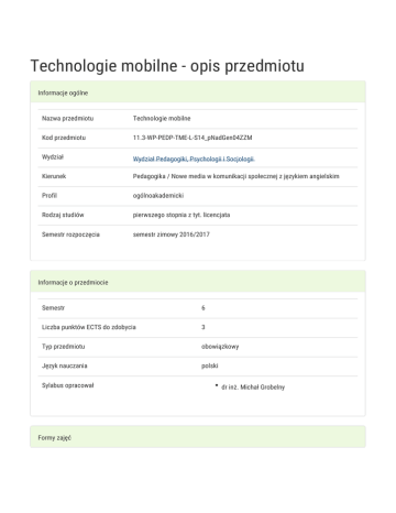 Technologie mobilne - opis przedmiotu Informacje ogólne Nazwa przedmiotu Technologie mobilne Kod przedmiotu 11.3-WP-PEDP-TME-L-S14_pNadGen04ZZM Wydział Wydział Pedagogiki, Psychologii i Socjologii Kierunek Pedagogika / Nowe media w komunikacji społecznej z językiem angielskim Profil ogólnoakademicki Rodzaj studiów pierwszego stopnia z tyt. licencjata Semestr rozpoczęcia semestr zimowy 2016/2017 Informacje o przedmiocie Semestr 6 Liczba punktów ECTS do zdobycia 3 Typ przedmiotu obowiązkowy Język nauczania polski Sylabus opracował Formy zajęć dr inż. Michał Grobelny Forma zajęć Laboratorium Liczba godzin Liczba godzin Liczba godzin w Liczba godzin w Forma w semestrze w tygodniu semestrze tygodniu zaliczenia (stacjonarne) (stacjonarne) (niestacjonarne) (niestacjonarne) 30 2 18 1,2 Zaliczenie na ocenę Cel przedmiotu Przygotowanie do wykorzystania dostępnych technologii mobilnych sprawnego komunikowania oraz budowania prostych rozwiązań mobilnych Wymagania wstępne Sprawność w korzystaniu ze standardowego oprogramowania środowiska Windows i zasobów komputera. Zakres tematyczny Rozwiązania mobilne i obszary ich zastosowań. Dostępne urządzenia, ich specyfikacja oraz możliwość ich wykorzystania: telefony komórkowe (ang. smartphone), tablety, laptopy. Systemy operacyjne: Google Android, Apple iOS, Microsoft Windows Phone. Infrastruktura mobilna – mobilny dostęp do Internetu. Wykorzystanie technologii GPS i GSM/GPRS/UMTS w nowoczesnych usługach mobilnych. Wykorzystanie możliwość urządzenia typu tablet lub smartphone w pracy, domu oraz terenie. Mobilne notatki, prezentacje i inne narzędzia wspomagające pracę. Rozrywka z wykorzystaniem rozwiązań mobilnych. Usługi internetowe i strony WWW dostosowane do odbiorcy mobilnego. Stosowanie mobilnych możliwości komunikacji i przekazu. Podstawy tworzenia mobilnych usług i oprogramowania na przykładzie jednej z dostępnych platform (Google Android, Windows Phone, HTML5, CSS3 i JavaScript). Metody kształcenia Zajęcia laboratoryjne w pracowni komputerowej, metoda projektu. Efekty kształcenia i metody weryfikacji osiągania efektów kształcenia Opis efektu Symbole Metody weryfikacji Forma zajęć efektów Student ma podstawową wiedzę na temat K_W17 Sprawdzian z zasad BHP w laboratorium. Ma podstawową K_W19 progami wiedzę na temat przepisów oraz K_W20 punktowymi; konsekwencji prawnych związanych z K_U14 Test z progami niewłaściwym korzystaniem z technologii punktowymi; mobilnych. Zna i wykorzystuje podstawowe Wejściówka; pojęcia z obszaru technologii mobilnych. Zna Zadania i stosuje różne kanały komunikacji mobilnej praktyczne – oraz potrafi dobrać właściwy do realizacji metoda wyznaczonego celu. Potrafi wykorzystać laboratoryjna; dostępne technologie mobilne w celu Ocena prac – progi usprawnienia własnej pracy lub polepszenia punktowe Laboratorium jakości przekazu multimedialnego Projektuje i pisze nieskomplikowane K_W20 Wejściówka; aplikacje i serwisy internetowe dedykowane K_U13 Projekt dla rozwiązań mobilnych K_K01 zaliczeniowy; Zadania praktyczne – metoda laboratoryjna Laboratorium Opis efektu Symbole Metody weryfikacji Forma zajęć efektów Pracuje w zespole przygotowując propozycje K_K01 rozwiązań mobilnych Zadania Laboratorium praktyczne – metoda laboratoryjna; Ocena zaangażowania w dyskusji; Ocena prac – progi punktowe (jakość wykonania, zgodność z instrukcją) Warunki zaliczenia WARUNKI ZALICZENIA: Efekty kształcenia będą weryfikowane poprzez systematyczną kontrolę wykonania zadań przewidzianych programem, okresowe sprawdziany (wejściówki) oraz wykonanie projektu (zgodność z tematem, struktura pracy, poprawny język, odpowiedni i twórczy dobór literatury; część praktyczna zgodna z przyjętymi założeniami). 30% oceny końcowej stanowi ocena z projektu. Laboratoria Zaliczenie laboratoriów: zaliczenie wszystkich sprawdzianów (progi punktowe; warunkiem uzyskania oceny pozytywnej jest zdobycie minimum 60% punktów) oraz wszystkich innych podlegających ocenie zadań i prac. Składnikami oceny końcowej są: 70% (oceny cząstkowe), 30% (ocena projektu). Ocena końcowa Ocena końcowa jest oceną z laboratorium. Obciążenie pracą Obciążenie pracą Studiastacjonarne Studia niestacjonarne (w godz.) (w godz.) Godziny kontaktowe (udział w zajęciach; konsultacjach; egzaminie, itp.) 50 23 Samodzielna praca studenta (przygotowanie do: zajęć, kolokwium, 25 52 Łącznie 75 75 Punkty ECTS Studia Studia niestacjonarne egzaminu; studiowanie literatury przygotowanie: pracy pisemnej, projektu, prezentacji, raportu, wystąpienia; itp.) stacjonarne Zajęcia z udziałem nauczyciela akademickiego 2 1 Zajęcia bez udziału nauczyciela akademickiego 1 2 Łącznie 3 3 Literatura podstawowa 1. Bura J., Pro Android Web Game Apps: Using HTML5, CSS3 and JavaScript, New York 2012. 2. Rogers S., Swipe This!: The Guide to Great Touchscreen Game Design, Chichester 2012. Literatura uzupełniająca 1. Burnette E., Hello, Android. Programowanie na platformę Google dla urządzeń mobilnych: wydanie III, Gliwice 2011. 2. Goliński M., Polańska K., red., Komunikacja Mobilna, Warszawa 2010. 3. Lee H., Eugene Chuvyrov, Windows Phone 7: tworzenie efektownych aplikacji, Gliwice 2011. 4. Narkiewicz J., GPS i inne satelitarne systemy nawigacyjne, Warszawa 2007. 5. Rychlicki-Kicior K., J2ME: praktyczne projekty, Gliwice 2011. Uwagi Zmodyfikowane przez dr Jacek Jędryczkowski (ostatnia modyfikacja: 15-07-2016 12:51)