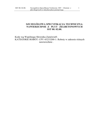 SST 00. 02.00. Szczegółowa Specyfikacja Techniczna SST – UłoŜenie z płyt drogowych (z odzysku) placu postojowego. 1 SZCZEGÓŁOWA SPECYFIKACJA TECHNICZNA: NAWIERZCHNIE Z PŁYT śELBETONOWYCH SST 00. 02.00. Kody wg Wspólnego Słownika Zamówień: KATEGORIE ROBÓT: CPV 45233200-1: Roboty w zakresie róŜnych nawierzchnie . SST 00. 02.00. Szczegółowa Specyfikacja Techniczna SST – UłoŜenie z płyt drogowych (z odzysku) placu postojowego. 2 1. WSTĘP 1.1. Przedmiot SST Przedmiotem niniejszej szczegółowej specyfikacji technicznej (SST) są wymagania dotyczące wykonania i odbioru robót związanych z wykonaniem nawierzchni placu postojowego z płyt drogowych Ŝelbetowych ( materiał z odzysku). 1.2. Zakres stosowania SST Ogólna specyfikacja techniczna (OST) stanowi podstawę opracowania szczegółowej specyfikacji technicznej (SST) stosowanej jako dokument przetargowy i kontraktowy przy zlecaniu i realizacji robót: wykonanie nawierzchni placu postojowego z płyt drogowych Ŝelbetowych ( materiał z odzysku). 1.3. Zakres robót objętych SST Ustalenia zawarte w niniejszej specyfikacji dotyczą zasad prowadzenia robót związanych z wykonaniem i odbiorem nawierzchni z płyt drogowych betonowych, zbrojonych ( o wym. 175x 350 cm, 130x250 cm, 80x240 cm) wykonanej na placu postojowym, na działkach nr 487/50, 487/51 obręb nr 19. 1.4. Określenia podstawowe 1.4.1. Drogowa płyta Ŝelbetonowa - sztuczny materiał z Ŝelbetonu wykonany w postaci płyty Ŝelbetonowej (zwykle o kształcie prostokątnym), stosowany do budowy nawierzchni drogowej. 1.4.2. Nawierzchnia z drogowych płyt betonowych - ulepszona nawierzchnia drogowa, której warstwa ścieralna jest wykonana z płyt Ŝelbetonowych. 1.4.3. Spoina - odstęp pomiędzy przylegającymi elementami (płyt), wypełniony określonym materiałem wypełniającym. 1.4.4. Szczelina dylatacyjna - odstęp dzielący duŜy fragment nawierzchni z płyt betonowych na sekcje w celu umoŜliwienia odkształceń temperaturowych, wypełniony określonym materiałem wypełniającym. 1.5. Ogólne wymagania dotyczące robót Ogólne wymagania dotyczące robót podano w ST -00.00.00 „Wymagania ogólne” [1] pkt 1.5. 2. Materiały 2.1. Ogólne wymagania dotyczące materiałów Ogólne wymagania dotyczące materiałów, ich pozyskiwania i składowania, podano w OST -00.00. „Wymagania ogólne” [1] pkt 2. 2.2. Wymagania dotyczące materiałów do wykonania nawierzchni z płyt drogowych Ŝelbetonowych 2.2.1. Płyty drogowe Ŝelbetonowe Do wykonania nawierzchni naleŜy uŜyć: − płyty Ŝelbetonowe, otrzymane z rozbiórki istniejącej nawierzchni, nadające się do ponownego wbudowania, 2.2.2. Materiały na podsypkę i do wypełnienia spoin oraz szczelin w nawierzchni Materiały na podsypkę (piasek) do wypełnienia spoin (piasek, zaprawa cementowa). 3. Sprzęt 3.1. Ogólne wymagania dotyczące sprzętu Ogólne wymagania dotyczące sprzętu podano w OST - 00.00. „Wymagania ogólne” [1] pkt 3. SST 00. 02.00. Szczegółowa Specyfikacja Techniczna SST – UłoŜenie z płyt drogowych (z odzysku) placu postojowego. 3 3.2. Sprzęt do wykonania nawierzchni z płyt Ŝelbetonowych, drogowych. Wymagania dotyczące sprzętu do wykonania nawierzchni z płyt betonowych powinny odpowiadać warunkom podanym w OST pkt 3, z zastosowaniem sprzętu np.: łopatek do oczyszczenia spoin, haczyków do wyciągania płyt i usuwania zalew, dłut, młotków brukarskich, skrobaczek, szczotek, młotków pneumatycznych, drągów stalowych, konewek, wiader do wody, szpadli, łopat itp. i ubijaków ręcznych lub mechanicznych. 4. Transport 4.1. Ogólne wymagania dotyczące transportu Ogólne wymagania dotyczące transportu podano w OST -00.00.00 „Wymagania ogólne” [1] pkt 4. 4.2. Transport materiałów wymaganych do wykonania nawierzchni z płyt drogowych Ŝelbetonowych. Wymagania dotyczące transportu płyt drogowych Ŝelbetonowych do wykonania nawierzchni powinny odpowiadać warunkom podanym w OST . Przywiezione płyty mogą być składowane na otwartej przestrzeni, na podłoŜu wyrównanym i odwodnionym, z zastosowaniem podkładek i przekładek, ułoŜone w pionie jedna nad drugą, na płask, co najwyŜej 10 warstw w stosie. 5. Wykonanie robót 5.1. Ogólne zasady wykonania robót Ogólne zasady wykonania robót podano w OST -00.00.00 „Wymagania ogólne” [1] pkt 5. 5.2. Wykonanie placu postojowego o nawierzchnia z płyt drogowych Ŝelbetonowych, materiał z odzysku. Wykonanie nawierzchni z płyt drogowych Ŝelbetonowych, obejmuje: - Mechaniczne wykonanie koryta na całej szerokości pod wyznaczony plac postojowy na głęb. ca. 20 cm, o pow. 619,320 m2 -Wykonanie warstwy odsączającej, zagęszczanej mechanicznie o gr.10 cm, o pow. 619,320 m2 -Wykonanie warstwy podsypki piaskowej, zagęszczanej ręcznie o gr.3 c, , o pow. 619,320 m2 -UłoŜenie nawierzchni z płyt Ŝelbetowych pełnych z wypełnieniem spoin (płyty z odzysku, o wym. płyt 175x350 cm, 130x250 cm, 80x240 cm, Płyty Ŝelbetonowe otrzymane z rozbiórki, nadające się do ponownego wbudowania, naleŜy dokładnie oczyścić, posortować i składować w miejscach nie kolidujących z wykonywaniem robót. ), o pow. 619,320 m2 -Wyrównanie , plantowanie terenu, ziemi kat.I-III uprzednio zmagazynowanej w hałdach uzyskanej z korytowania 5. 3.UłoŜenie nawierzchni z płyt drogowych betonowych Po ułoŜeniu płyt sprawdza się równość nawierzchni w kierunku podłuŜnym i poprzecznym za pomocą łaty. Płyty ułoŜone za nisko naleŜy podnieść haczykami, podsypać piasku i po dokładnym jego wyrównaniu i ubiciu ułoŜyć płytę ponownie. Płyty podwyŜszone naleŜy obniŜyć. Powstałe przy układaniu, nie wypełnione płytami, małe przestrzenie wypełnia się dokładnie ubitym betonem. Przy układaniu płyt naleŜy zachować właściwy profil podłuŜny i poprzeczny otaczającej starej nawierzchni. Powierzchnia płyt połoŜonych obok urządzeń infrastruktury technicznej (np. studzienek, włazów itp.) 