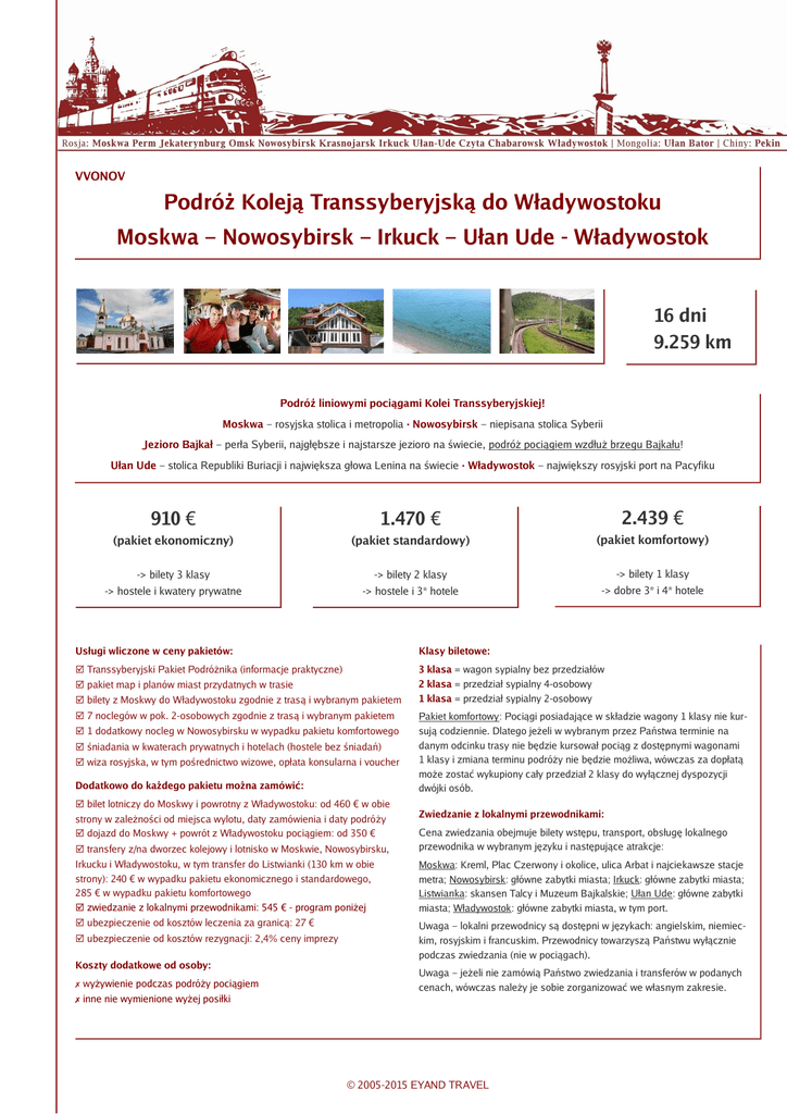 VVONOV Podróż Koleją Transsyberyjską do Władywostoku Moskwa – Nowosybirsk – Irkuck – Ułan Ude - Władywostok 16 dni 9.259 km Podróż liniowymi pociągami Kolei Transsyberyjskiej! Moskwa – rosyjska stolica i metropolia · Nowosybirsk – niepisana stolica Syberii Jezioro Bajkał – perła Syberii, najgłębsze i najstarsze jezioro na świecie, podróż pociągiem wzdłuż brzegu Bajkału! Ułan Ude – stolica Republiki Buriacji i największa głowa Lenina na świecie · Władywostok – największy rosyjski port na Pacyfiku 1.470 € 2.439 € (pakiet standardowy) (pakiet komfortowy) 910 € (pakiet ekonomiczny) -> bilety 3 klasy -> bilety 2 klasy -> bilety 1 klasy -> hostele i kwatery prywatne -> hostele i 3* hotele -> dobre 3* i 4* hotele Usługi wliczone w ceny pakietów: Klasy biletowe: ☑ Transsyberyjski Pakiet Podróżnika (informacje praktyczne) 3 klasa = wagon sypialny bez przedziałów 2 klasa = przedział sypialny 4-osobowy 1 klasa = przedział sypialny 2-osobowy ☑ pakiet map i planów miast przydatnych w trasie ☑ bilety z Moskwy do Władywostoku zgodnie z trasą i wybranym pakietem ☑ 7 noclegów w pok. 2-osobowych zgodnie z trasą i wybranym pakietem ☑ 1 dodatkowy nocleg w Nowosybirsku w wypadku pakietu komfortowego ☑ śniadania w kwaterach prywatnych i hotelach (hostele bez śniadań) ☑ wiza rosyjska, w tym pośrednictwo wizowe, opłata konsularna i voucher Dodatkowo do każdego pakietu można zamówić: ☑ bilet lotniczy do Moskwy i powrotny z Władywostoku: od 460 € w obie strony w zależności od miejsca wylotu, daty zamówienia i daty podróży ☑ dojazd do Moskwy + powrót z Władywostoku pociągiem: od 350 € Pakiet komfortowy: Pociągi posiadające w składzie wagony 1 klasy nie kursują codziennie. Dlatego jeżeli w wybranym przez Państwa terminie na danym odcinku trasy nie będzie kursował pociąg z dostępnymi wagonami 1 klasy i zmiana terminu podróży nie będzie możliwa, wówczas za dopłatą może zostać wykupiony cały przedział 2 klasy do wyłącznej dyspozycji dwójki osób. Zwiedzanie z lokalnymi przewodnikami: ☑ transfery z/na dworzec kolejowy i lotnisko w Moskwie, Nowosybirsku, Cena zwiedzania obejmuje bilety wstępu, transport, obsługę lokalnego przewodnika w wybranym języku i następujące atrakcje: Irkucku i Władywostoku, w tym transfer do Listwianki (130 km w obie strony): 240 € w wypadku pakietu ekonomicznego i standardowego, 285 € w wypadku pakietu komfortowego ☑ zwiedzanie z lokalnymi przewodnikami: 545 € - program poniżej Moskwa: Kreml, Plac Czerwony i okolice, ulica Arbat i najciekawsze stacje metra; Nowosybirsk: główne zabytki miasta; Irkuck: główne zabytki miasta; Listwianka: skansen Talcy i Muzeum Bajkalskie; Ułan Ude: główne zabytki miasta; Władywostok: główne zabytki miasta, w tym port. ☑ ubezpieczenie od kosztów leczenia za granicą: 27 € Uwaga – lokalni przewodnicy są dostępni w językach: angielskim, niemieckim, rosyjskim i francuskim. Przewodnicy towarzyszą Państwu wyłącznie podczas zwiedzania (nie w pociągach). ☑ ubezpieczenie od kosztów rezygnacji: 2,4% ceny imprezy Koszty dodatkowe od osoby: ✗ wyżywienie podczas podróży pociągiem Uwaga – jeżeli nie zamówią Państwo zwiedzania i transferów w podanych cenach, wówczas należy je sobie zorganizować we własnym zakresie. ✗ inne nie wymienione wyżej posiłki © 2005-2015 EYAND TRAVEL Czeka Państwa ponad 2-tygodniowa podróż, w tym przejazd liniowymi pociągami Kolei Transsyberyjskiej. Oznacza to 9.259 km ciekawej trasy prowadzącej przez Syberię, wysokogórskie krajobrazy Uralu, liczne syberyjskie metropolie i wioski. Przez około 100 km trasa prowadzi wzdłuż brzegu Bajkału – wybraliśmy takie połączenie kolejowe, które umożliwia podziwianie tego przepięknego odcinka w ciągu dnia. Od Irkucka zaczyna się jeden z najciekawszych i najbardziej zmiennych krajobrazowo odcinków trasy Kolei Transsyberyjskiej o długości około 4.000 km. Trasa prowadzi początkowo przez piękną i ciekawą rosyjską Republikę Buriacji, a następnie przez niemalże niezaludnione tereny Dalekiego Wschodu. To tutaj zaczynają się największe serpentyny, dzięki którym możliwe jest fotografowanie pociągu na tle pięknych krajobrazów. Pociąg przejeżdża przez liczący ponad 2,5 km most na rzece Amur – najdłuższy na trasie Kolei Transsyberyjskiej. W trasie będzie okazja do zawarcia nowych znajomości, zapoznania się z inną kulturą i zrobienia pięknych zdjęć. Na peronach stacji pośrednich będą Państwo mieli okazję spróbowania świeżych regionalnych przysmaków. Podczas podróży przewidziane są postoje w wybranych ciekawych miejscowościach na trasie: Nowosybirsku, Irkucku i Ułan Ude oraz pobyt na łonie natury – nad Jeziorem Bajkał w miejscowości Listwianka, gdzie będzie możliwość skosztowania bajkalskiego specjału – wędzonej ryby omul i skorzystania z tradycyjnej sauny rosyjskiej – banji. Przebieg trasy Moskwa Transsib: 10 dzień: Podróż pociągiem wzdłuż brzegu Bajkału do Ułan Ude (odjazd rano, przyjazd późnym popołudniem), nocleg w Ułan Ude. 1 dzień: Przyjazd do Moskwy, nocleg. Ułan Ude 2 dzień: Zwiedzanie Kremla, Placu Czerwonego i okolic oraz słynnej historycznej ulicy Arbat znanej z piosenek Bułata Okudżawy, przy której zamieszkiwał także Aleksander Puszkin. Wycieczka do najciekawszych stacji metra, podczas której zobaczą Państwo wybrane najciekawsze stacje i przekonają się dlaczego określane są one mianem podziemnych pałaców. 11 dzień: Zwiedzanie Ułan Ude, w tym słynnego pomnika – największej głowy Lenina na świecie. Po południu odjazd pociągiem do Władywostoku. 3 dzień: Czas wolny. Wieczorem odjazd pociągiem do Nowosybirska. Transsib: 4-5 dzień: Podróż pociągiem. Nowosybirsk 6 dzień: Przyjazd do Nowosybirska wcześnie rano. Zwiedzanie głównych atrakcji miasta, w tym Katedry Aleksandra Newskiego i Dworca Głównego