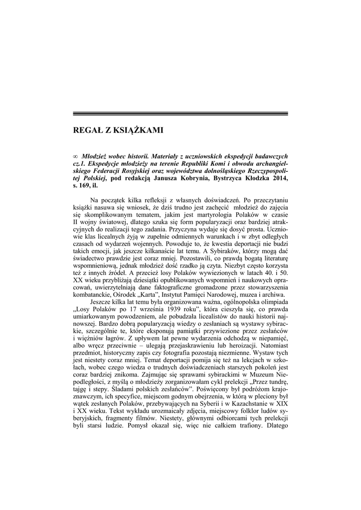 REGAŁ Z KSIĄŻKAMI • Młodzież wobec historii. Materiały z uczniowskich ekspedycji badawczych cz.1. Ekspedycje młodzieży na terenie Republiki Komi i obwodu archangielskiego Federacji Rosyjskiej oraz województwa dolnośląskiego Rzeczypospolitej Polskiej, pod redakcją Janusza Kobrynia, Bystrzyca Kłodzka 2014, s. 169, il. Na początek kilka refleksji z własnych doświadczeń. Po przeczytaniu książki nasuwa się wniosek, że dziś trudno jest zachęcić młodzież do zajęcia się skomplikowanym tematem, jakim jest martyrologia Polaków w czasie II wojny światowej, dlatego szuka się form popularyzacji oraz bardziej atrakcyjnych do realizacji tego zadania. Przyczyna wydaje się dosyć prosta. Uczniowie klas licealnych żyją w zupełnie odmiennych warunkach i w zbyt odległych czasach od wydarzeń wojennych. Powoduje to, że kwestia deportacji nie budzi takich emocji, jak jeszcze kilkanaście lat temu. A Sybiraków, którzy mogą dać świadectwo prawdzie jest coraz mniej. Pozostawili, co prawdą bogatą literaturę wspomnieniową, jednak młodzież dość rzadko ją czyta. Niezbyt często korzysta też z innych źródeł. A przecież losy Polaków wywiezionych w latach 40. i 50. XX wieku przybliżają dziesiątki opublikowanych wspomnień i naukowych opracowań, uwierzytelniają dane faktograficzne gromadzone przez stowarzyszenia kombatanckie, Ośrodek „Karta”, Instytut Pamięci Narodowej, muzea i archiwa. Jeszcze kilka lat temu była organizowana ważna, ogólnopolska olimpiada „Losy Polaków po 17 września 1939 roku”, która cieszyła się, co prawda umiarkowanym powodzeniem, ale pobudzała licealistów do nauki historii najnowszej. Bardzo dobrą popularyzacją wiedzy o zesłaniach są wystawy sybirackie, szczególnie te, które eksponują pamiątki przywiezione przez zesłańców i więźniów łagrów. Z upływem lat pewne wydarzenia odchodzą w niepamięć, albo wręcz przeciwnie – ulegają przejaskrawieniu lub heroizacji. Natomiast przedmiot, historyczny zapis czy fotografia pozostają niezmienne. Wystaw tych jest niestety coraz mniej. Temat deportacji pomija się też na lekcjach w szkołach, wobec czego wiedza o trudnych doświadczeniach starszych pokoleń jest coraz bardziej znikoma. Zajmując się sprawami sybirackimi w Muzeum Niepodległości, z myślą o młodzieży zorganizowałam cykl prelekcji „Przez tundrę, tajgę i stepy. Śladami polskich zesłańców”. Poświęcony był podróżom krajoznawczym, ich specyfice, miejscom godnym obejrzenia, w którą w pleciony był wątek zesłanych Polaków, przebywających na Syberii i w Kazachstanie w XIX i XX wieku. Tekst wykładu urozmaicały zdjęcia, miejscowy folklor ludów syberyjskich, fragmenty filmów. Niestety, głównymi odbiorcami tych prelekcji byli starsi ludzie. Pomysł okazał się, więc nie całkiem trafiony. Dlatego 106 REGAŁ Z KSIĄŻKAMI z dużym zainteresowaniem przeczytałam książkę, gdyż wydaje mi się, że ekspedycja naukowa dla młodzieży szkół średnich na tereny północnej Rosji jest inicjatywą bardzo dobrą, choć trudną do zrealizowania. Podjęli się jej nauczyciele historii Janusz Kobryń i Wiaczesław W. Masalcew. Zajmowali się stalinowskimi represjami, a od 2007 roku temat „polskiej zsyłki” stał się wiodący. Masalcew, wraz z młodzieżą szkolną prowadził ekspedycje w rejonie priłużskim Republiki Komi. W 2007 r. odnaleźli ślady nieistniejącej już osady Czesjol, w której przebywali deportowani chłopi. Następnie zbierali informacje o miejscowościach Wierchniaja Głuszyca, zwana przez okoliczną ludność jako Centralne Baraki, a także o Niżnej Głuszycy i Lieksztorze. Latem 2011 r. uczniowska ekspedycja badawcza zbierała dane o miejscach osiedlenia Polaków wzdłuż rzeki Koża (między osadami Korża i Łojma). Zlokalizowano tam 5 osiedli specjalnych, w którym przebywali oraz odnaleziono miejsce pochówku w miejscowości Ważjol. W 2012 r. ekspedycja prowadziła badania w Starym Wuchtymiu, a w 2013 – w osadzie Wierchnij Liapomoz. W sumie młodzież znalazła tu sporo materialnych śladów związanych z historią stalinowskich represji. Na efekty tej pracy trzeba będzie jednak poczekać, ponieważ jej autorzy zakładają, że „uczniowie biorący udział w ekspedycjach przekażą wiedzę następnym pokoleniom”. Pewne jest natomiast, iż stosunek uczestników wyprawy do zesłańców będzie już teraz bardziej prawdziwy i osobisty. Dotyczy to przede wszystkim młodzieży z Polski, która dopiero odnajduje, jakie fakty skrywa historia i poznaje rosyjskie warunki. Surowy klimat tych ziem, ślady bytności wywiezionych Polaków stawiają sprawy martyrologii w innym kontekście. Przestają być już wiedzą z książek, a zaczynają docierać do wrażliwości młodzieży. Drugą, nie mniej ważną sprawą jest dokumentacja miejsc pamięci. Przede wszystkim należy tu wymienić odnalezienie śladów cmentarzy, na których chowano zmarłych na zesłaniu, a także odkrycie nieistniejących już miejscowości, w których osiedlano deportowanych Polaków. W przeciągu kilku lat zidentyfikowano 10 osiedli specjalnych, 6 miejsc pochówku wywiezionych na Wschód obywateli polskich. Ich lokalizacja została naniesiona na mapę regionu, a na grobach postawiono znaki pamięci. Wyprawy te szumnie nazwano uczniowskimi ekspedycjami badawczymi, co nie jest przesadą, gdyż rzeczywiście spełniają one ważną funkcję poznawczą. Miejscowości, w których w czasie wojny mieszkali Polacy, znalazły swoje potwierdzenie w źródłach i relacjach okolicznej ludności. Sporządzono rysunki map i fotografie dokumentowania znaków pamięci, które są zamieszczone w książce. O osiągnięciach ekspedycji piszę w formie bezosobowej, gdyż brała w nich udział znaczna część dorosłych uczestników, i nie wiadomo jaka faktycznie rolę spełniała tam młodzież. Druga, część książki nosi nazwę „Prace badawcze związane z historią i zachowaniem pam