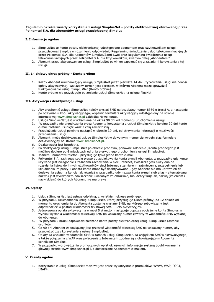 Regulamin określa zasady korzystania z usługi SimplusNet - poczty elektronicznej oferowanej przez Polkomtel S.A. dla abonentów usługi przedpłaconej Simplus I. Informacje ogólne 1. 2. SimplusNet to konto poczty elektronicznej udostępnione abonentom oraz użytkownikom usługi przedpłaconej Simplus w rozumieniu odpowiednio Regulaminu świadczenia usług telekomunikacyjnych przez Polkomtel S.A. dla Abonentów Simplus/Sami Swoi oraz Regulaminu świadczenia usług telekomunikacyjnych przez Polkomtel S.A. dla Użytkowników, zwanym dalej „Abonentami”. Abonent przed aktywowaniem usługi SimplusNet powinien zapoznać się z zasadami korzystania z tej usługi. II. 14 dniowy okres próbny - Konto próbne 1. 2. Każdy Abonent uruchamiający usługę SimplusNet przez pierwsze 14 dni użytkowania usługi nie ponosi opłaty aktywacyjnej. Wskazany termin jest okresem, w którym Abonent może sprawdzić funkcjonowanie usługi SimplusNet (Konto próbne). Konto próbne nie przysługuje po zmianie usługi SimplusNet na usługę PlusNet. III. Aktywacja i deaktywacja usługi 1. 2. 3. 4. 5. 6. 7. 8. 9. Aby uruchomić usługę SimplusNet należy wysłać SMS na bezpłatny numer 8369 o treści A, a następnie po otrzymaniu kodu aktywacyjnego, wypełnić formularz aktywacyjny udostępniony na stronie internetowej www.simplusnet.pl zakładka Nowe konto. Usługa SimplusNet jest uruchamiana na okres 90 dni od momentu uruchomienia usługi. W przypadku nie przedłużenia przez Abonenta korzystania z usługi SimplusNet o kolejne 90 dni konto e-mail zostanie usunięte wraz z całą zawartością. Przedłużenie usługi powinno nastąpić w okresie 30 dni, od otrzymania informacji o możliwości przedłużenia usługi. Abonent może deaktywować usługę SimplusNet w dowolnym momencie wypełniając formularz deaktywacyjny na stronie www.simplusnet.pl. Deaktywacja jest bezpłatna. Po deaktywacji usługi SimplusNet po okresie próbnym, ponowne założenie „Konta próbnego” jest możliwe dopiero po 6 miesiącach od dnia pierwotnego uruchomienia usługi SimplusNet. Jednemu numerowi telefonu przysługuje tylko jedno konto e-mail. Polkomtel S.A. zastrzega sobie prawo do zablokowania konta e-mail Abonenta, w przypadku gdy konto używane jest niezgodnie z zasadami zachowania w sieci Internet, zwłaszcza jeśli służy ono do rozsyłania listów do innych użytkowników sieci Internet z zamiarem, zaśmiecenia, przepełnienia lub utrudnienia im pracy. Ponadto konto może być deaktywowane , gdy Abonent nie ma uprawnień do dodawania usług na koncie jak również w przypadku gdy nazwa konta e-mail (lub alias - alternatywna nazwa) jest wyrażeniem powszechnie uważanym za obraźliwe, lub identyfikuje się nazwą (imieniem i nazwiskiem) do których Abonent nie ma prawa. IV. Opłaty 1. 2. 3. 4. 5. 6. 7. Usługa SimplusNet jest usługą odpłatną, z wyjątkiem okresu próbnego. W przypadku uruchomienia usługi SimplusNet, której przysługuje Okres próbny, po 12 dniach od momentu uruchomienia do Abonenta zostanie wysłany SMS, na którego zobowiązany jest odpowiedzieć w postaci wiadomości tekstowej SMS - SMS aktywacyjny. Jednorazowa opłata aktywacyjna wynosi 5 zł netto i następuje poprzez obciążenie konta Simplus w wyniku wysłania wiadomości tekstowej SMS na wskazany numer zawarty w wiadomości SMS wysłanej do Abonenta. W przypadku braku odpowiedzi założone konto poczty elektronicznej usługi SimplusNet zostanie usunięte. Co 90 dni Abonent zobowiązany jest przesłać wiadomość tekstową SMS na wskazany numer, aby przedłużyć czas korzystania z usługi SimplusNet. Opłaty za wysłanie wiadomości SMS w ramach usługi SimplusNet, za wyjątkiem SMS’a aktywacyjnego, a także połączenia z WAP oraz połączenia z Internetem zgodne są z obowiązującym Abonenta cennikiem Simplus. W przypadku wprowadzenia promocyjnych opłat okresowych informacje zostaną opublikowane na głównej stronie www.simplusnet.pl lub dostarczone Abonentom e-mailem. V. Zasady ogólne 1. Korzystanie z usługi SimplusNet możliwe jest przez wykorzystanie protokołów: WWW, WAP, POP3, IMAP4. 2. 3. 4. 5. 6. 7. Wszelkie uwagi i zastrzeżenia do funkcjonowania usługi SimplusNet prosimy zgłaszać na adres: [email protected]. Polkomtel S.A. zastrzega sobie prawo zmiany niniejszego regulaminu w dowolnym czasie i po uprzednim powiadomieniu Abonentów. Wszelkie zmiany stają się obowiązujące w momencie ich opublikowania na stronach usługi SimplusNet tj. www.simplusnet.pl. Konto e-mail udostępniane w ramach usługi SimplusNet wykorzystywane może być tylko i wyłącznie zgodnie z obowiązującym prawem. Całkowitą odpowiedzialność za treść i inną zawartość listów przesyłanych za pośrednictwem konta email ponosi Abonent. Polkomtel S.A. dołoży wszelkich starań w celu zapewnienia sprawnego działania usługi SimplusNet i ochrony danych znajdujących się na serwerach SimplusNet. Polkomtel S.A. nie ponosi odpowiedzialności za: o wykorzystanie konta e-mail przez osobę nieuprawnioną na skutek wejścia przez nią w posiadanie hasła dostępu do konta e-mail Abonenta o utratę danych spowodowaną awarią systemu z przyczyn niezależnych od operatora. VI. Pomoc Odpowiedzi na najczęściej zadawane pytania, dotyczące obsługi poczty elektronicznej znajdują się pod internetowym adresem www.simplusnet.pl/pomoc.html. Można też kontaktować się bezpośrednio z Działem Obsługi Klienta pod numerem 2601 z telefonu Simplus.