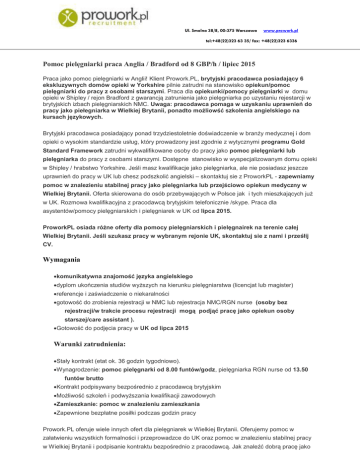 Ul. Smolna 38/8, 00-375 Warszawa www.prowork.pl tel:+48(22)323 63 35/ fax: +48(22)323 6336 Pomoc pielęgniarki praca Anglia / Bradford od 8 GBP/h / lipiec 2015 Praca jako pomoc pielęgniarki w Anglii! Klient Prowork.PL, brytyjski pracodawca posiadający 6 ekskluzywnych domów opieki w Yorkshire pilnie zatrudni na stanowisko opiekun/pomoc pielęgniarki do pracy z osobami starszymi. Praca dla opiekunki/pomocy pielęgniarki w domu opieki w Shipley / rejon Bradford z gwarancją zatrunienia jako pielęgniarka po uzystaniu rejestarcji w brytyjskich izbach pielęgniarskich NMC. Uwaga: pracodawca pomaga w uzyskaniu uprawnień do pracy jako piełegniarka w Wielkiej Brytanii, ponadto możliowść szkolenia angielskiego na kursach językowych. Brytyjski pracodawca posiadający ponad trzydziestoletnie doświadczenie w branży medycznej i dom opieki o wysokim standardzie usług, który prowadzony jest zgodnie z wytycznymi programu Gold Standard Framework zatrudni wykwalifikowane osoby do pracy jako pomoc pielęgniarki lub pielęgniarka do pracy z osobami starszymi. Dostępne stanowisko w wyspecjalizowanym domu opieki w Shipley / hrabstwo Yorkshire. Jeśli masz kwalifikacje jako pielęgniarka, ale nie posiadasz jeszcze uprawnień do pracy w UK lub chesz podszkolić angielski – skontaktuj sie z ProworkPL - zapewniamy pomoc w znalezieniu stabilnej pracy jako pielęgniarka lub przejściowo opiekun medyczny w Wielkiej Brytanii. Oferta skierowana do osób przebywających w Polsce jak i tych mieszkających już w UK. Rozmowa kwalifikacyjna z pracodawcą brytyjskim telefonicznie /skype. Praca dla asystentów/pomocy pielęgniarskich i pielęgniarek w UK od lipca 2015. ProworkPL osiada różne oferty dla pomocy pielęgniarskich i pielęgnairek na terenie całej Wielkiej Brytanii. Jeśli szukasz pracy w wybranym rejonie UK, skontaktuj sie z nami i prześłij CV. Wymagania komunikatywna znajomość języka angielskiego dyplom ukończenia studiów wyższych na kierunku pielęgniarstwa (licencjat lub magister) referencje i zaświadczenie o niekaralności gotowość do zrobienia rejestracji w NMC lub rejestracja NMC/RGN nurse (osoby bez rejestracji/w trakcie procesu rejestracji mogą podjąć pracę jako opiekun osoby starszej/care assistant ). Gotowość do podjęcia pracy w UK od lipca 2015 Warunki zatrudnienia: Stały kontrakt (etat ok. 36 godzin tygodniowo). Wynagrodzenie: pomoc pielęgnarki od 8.00 funtów/godz, pielęgniarka RGN nurse od 13.50 funtów brutto Kontrakt podpisywany bezpośrednio z pracodawcą brytyjskim Możliwość szkoleń i podwyższania kwalifikacji zawodowych Zamieszkanie: pomoc w znalezieniu zamieszkania Zapewnione bezpłatne posiłki podczas godzin pracy Prowork.PL oferuje wiele innych ofert dla pielęgniarek w Wielkiej Brytanii. Oferujemy pomoc w załatwieniu wszystkich formalności i przeprowadzce do UK oraz pomoc w znalezieniu stabilnej pracy w Wielkiej Brytanii i podpisanie kontraktu bezpośrednio z pracodawcą. Jak znaleźć dobrą pracę jako pielęgniarka w Wielkiej Brytanii? Skontaktuj się z Prowork.PL o podaj swoje preferencje odnośnie lokalizacji i poszukiwanej pracy w UK. Procedura rekrutacyjna W przypadku zainteresowania niniejszą ofertą prosimy o pilne o przysłanie cv w języku angielskim na adres: [email protected] tel.022 323 63 35; 501 182 708, kontakt: Anna Cebula. Po otrzymaniu cv kontaktujemy się z kandydatami telefonicznie. Prowork.PL Profesjonalny dobór personelu do opieki ul. Smolna 38/8, 00-375 Warszawa Wpis do rejestru podmiotów prowadzących agencje zatrudnienia - certyfikat nr 9116 (www.kraz.praca.gov.pl). Nie pobieramy żadnych opłat od osób starających się o pracę. Pomagamy w przygotowaniu/przetłumaczeniu dokumentów i skutecznym podjęciu pracy za granicą.