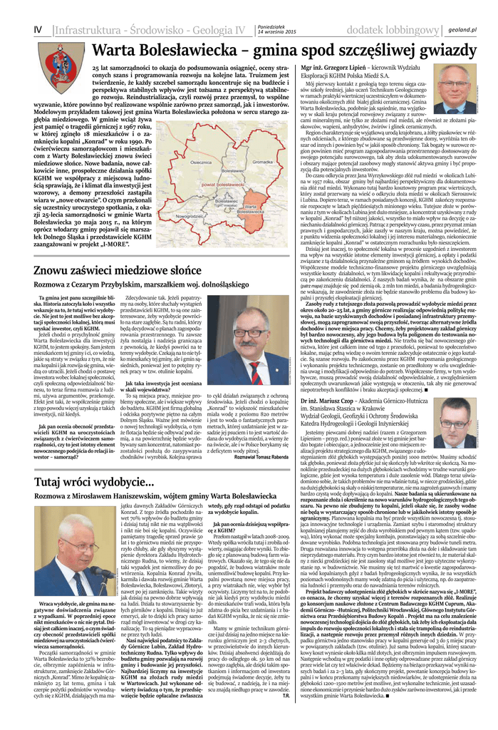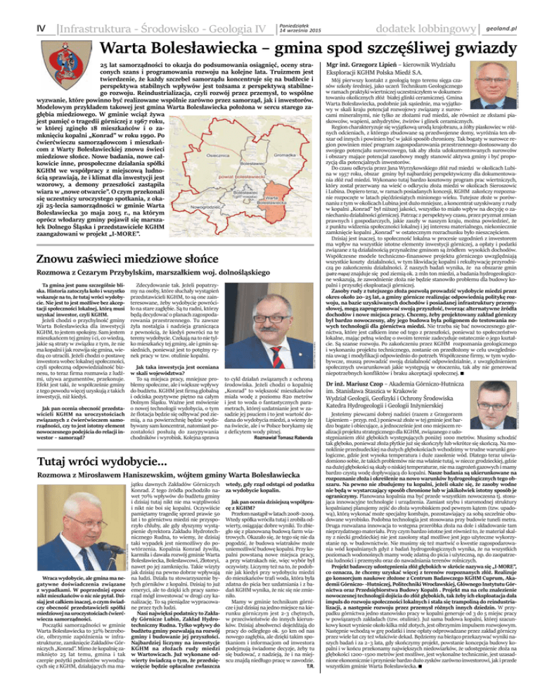 IV Infrastruktura - Środowisko - Geologia IV Poniedziałek 14 września 2015 dodatek lobbingowy geoland.pl Warta Bolesławiecka – gmina spod szczęśliwej gwiazdy Znowu zaświeci miedziowe słońce Rozmowa z Cezarym Przybylskim, marszałkiem woj. dolnośląskiego Jak taka inwestycja jest oceniana w skali województwa? To są miejsca pracy, mniejsze problemy społeczne, ale i większe wpływy do budżetu. KGHM jest firmą globalną i odciska pozytywne piętno na całym Dolnym Śląsku. Ważne jest mówienie o nowej technologii wydobycia, o tym że flotacja będzie się odbywać pod ziemią, a na powierzchnię będzie wydobywany sam koncentrat, natomiast pozostałości posłużą do zasypywania chodników i wyrobisk. Kolejna sprawa Jak pan ocenia obecność przedstawicieli KGHM na uroczystościach związanych z ćwierćwieczem samorządności, czy to jest istotny element nowoczesnego podejścia do relacji inwestor – samorząd? geoland/tomasz rabenda Zdecydowanie tak. Jeżeli popatrzymy na osoby, które słuchały wystąpień przedstawicieli KGHM, to są one zainteresowane, żeby wydobycie powróciło na stare zagłębie. Są tu radni, którzy będą decydować o planach zagospodarowania przestrzennego. Tu zawsze żyła nostalgia i nadzieja granicząca z pewnością, że kiedyś powróci na te tereny wydobycie. Czekają na to nie tylko mieszkańcy tej gminy, ale i gmin sąsiednich, ponieważ jest to potężny rynek pracy w tzw. otulinie kopalni. Ta gmina jest panu szczególnie bliska. Historia zatoczyła koło i wszystko wskazuje na to, że tutaj wróci wydobycie. Nie jest to jest możliwe bez akceptacji społeczności lokalnej, którą musi uzyskać inwestor, czyli KGHM. Jeżeli chodzi o przychylność gminy Warta Bolesławiecka dla inwestycji KGHM, to jestem spokojny. Sam jestem mieszkańcem tej gminy i ci, co wiedzą, jakie są straty w związku z tym, że nie ma kopalni i jak rozwija się gmina, wiedzą co utracili. Jeżeli chodzi o postawę inwestora wobec lokalnej społeczności, czyli społeczną odpowiedzialność biznesu, to teraz firma rozmawia z ludźmi, używa argumentów, przekonuje. Efekt jest taki, że współcześnie gminy z tego powodu więcej uzyskują z takich inwestycji, niż kiedyś. to cykl działań związanych z ochroną środowiska. Jeżeli chodzi o kopalnię „Konrad” to większość mieszkańców miała wodę z poziomu 820 metrów i jest to woda o fantastycznych parametrach, której uzdatnianie jest w zasadzie jej psuciem i to jest wartość dodana do wydobycia miedzi, a wiemy że na świecie, ale i w Polsce borykamy się z deficytem wody pitnej. Rozmawiał Tomasz Rabenda Tutaj wróci wydobycie... geoland/tomasz rabenda Rozmowa z Mirosławem Haniszewskim, wójtem gminy Warta Bolesławiecka Wraca wydobycie, ale gmina ma negatywne doświadczenia związane z wypadkami. W poprzedniej epoce nikt mieszkańców o nic nie pytał. Dzisiaj jest całkiem inaczej, o czym świadczy obecność przedstawicieli spółki miedziowej na uroczystościach ćwierćwiecza samorządności. Początki samorządności w gminie Warta Bolesławiecka to 32% bezrobocie, olbrzymie zapóźnienia w infrastrukturze, zamknięcie Zakładów Górniczych „Konrad”. Mimo że kopalnię zamknięto 25 lat temu, gmina i tak czerpie pożytki podmiotów wywodzących się z KGHM, działających ma ma- jątku dawnych Zakładów Górniczych Konrad. Z tego źródła pochodziło nawet 70% wpływów do budżetu gminy i dzisiaj tutaj nikt nie ma wątpliwości i nikt nie boi się kopalni. Oczywiście pamiętamy tragedię sprzed prawie 50 lat i to górnictwu miedzi nie przysporzyło chluby, ale gdy słyszymy wystąpienie dyrektora Zakładu Hydrotechnicznego Rudna, to wiemy, że dzisiaj taki wypadek jest niemożliwy do powtórzenia. Kopalnia Konrad żywiła, karmiła i dawała rozwój gminie Warta Bolesławiecka, Bolesławcowi, Złotoryi, nawet po jej zamknięciu. Takie wizyty jak dzisiaj na pewno dobrze wpływają na ludzi. Działa tu stowarzyszenie byłych górników z kopalni. Dzisiaj to już emeryci, ale to dzięki ich pracy samorząd mógł inwestować w drogi czy kanalizację. To są pieniądze wypracowane przez tych ludzi. Nasi najwięksi podatnicy to Zakłady Górnicze Lubin, Zakład Hydrotechniczny Rudna. Tylko wpływy do budżetu gminy pozwalają na rozwój gminy i budowanie jej przyszłości. Najbardziej liczymy na inwestycje KGHM na złożach rudy miedzi w Wartowicach. Już wykonane odwierty świadczą o tym, że przedsięwzięcie będzie opłacalne zwłaszcza wtedy, gdy rząd odstąpi od podatku za wydobycie kopalin. Jak pan ocenia dzisiejszą współpracę z KGHM? Przełom nastąpił w latach 2008–2009. Wtedy spółka wróciła tutaj i zrobiła odwierty, osiągając dobre wyniki. To zbiegło się z planowaną budową farm wiatrowych. Okazało się, że tego się nie da pogodzić, że budowa wiatraków może uniemożliwić budowę kopalni. Przy kopalni powstaną nowe miejsca pracy, a przy wiatrakach nie, więc wybór był oczywisty. Liczymy też na to, że podobnie jak kiedyś przy wydobyciu miedzi do mieszkańców trafi woda, która była zdatna do picia bez uzdatniania i z badań KGHM wynika, że nic się nie zmieniło. Mamy w gminie technikum górnicze i już dzisiaj na jedno miejsce na kierunku górniczym jest 2-3 chętnych, w przeciwieństwie do innych kierunków. Dzisiaj absolwenci dojeżdżają do pracy do odległego ok. 50 km od nas nowego zagłębia, ale dzięki takim spotkaniom i informacjom od inwestora podejmują świadome decyzje, żeby tu się budować, z nadzieją, że i na miejscu znajdą niedługo pracę w zawodzie. T.R. Mgr inż. Grzegorz Lipień – kierownik Wydziału Eksploracji KGHM Polska Miedź S.A. geoland/tomasz rabenda Mój pierwszy kontakt z geologią tego terenu sięga czasów szkoły średniej, jako uczeń Technikum Geologicznego w ramach praktyki wiertniczej uczestniczyłem w dokumentowaniu okolicznych złóż białej glinki ceramicznej. Gmina Warta Bolesławieck