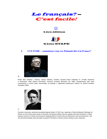Le français? – C’est facile! 1-ère édition 4-ème ETAPE I. CULTURE – connaissez-vous ces Polonais liés à la France? 1. Polski aktor teatralny i filmowy, reżyser teatralny. Dyrektor naczelny Teatru Polskiego im. Arnolda Szyfmana w Warszawie. Aktor teatrów francuskich, kinowych produkcji filmowych (od 1980), zaangażowany jako trzeci cudzoziemiec w historii teatru francuskiego do jednego z najbardziej prestiżowych teatrów na świecie ComédieFrançaise (1993). 2. Fizyczka, chemiczka, dwukrotna laureatka Nagrody Nobla. W 1891 roku, wyjechała z Polski (Królestwa Polskiego) do Paryża, by tam kontynuować studia na Sorbonie Jest jedyną kobietą, która tę nagrodę otrzymała dwukrotnie, a także jedynym uczonym w historii uhonorowanym Nagrodą Nobla w dwóch różnych dziedzinach nauk przyrodniczych. Jest ona też jedyną kobietą, która spoczęła w paryskim Panteonie w dowód uznania zasług na polu naukowym. 3. Publicysta, polityk i działacz emigracyjny, epistolograf, w dwudziestoleciu międzywojennym związany z obozem młodokonserwatystów, autor wspomnień. Po przenosinach do Paryża - wydawał od 1947 miesięcznik „Kultura”. Krytycznie patrząc na stosunki panujące w Polsce po 1989 roku odmówił przyjęcia Orderu Orła Białego(1994). Zmarł na zawał serca. Pochowany na cmentarzu w Le Mesnil-le-Roi. 4. Polski kompozytor i pianista. Od roku 1830 zamieszkał we Francji. Chopin jest uważany za jednego z najważniejszych kompozytorów romantycznych, a także za jednego z najważniejszych polskich kompozytorów w historii. Był jednym z najsłynniejszych pianistów swoich czasów, często nazywany poetą fortepianu. Spoczął na Cmentarzu Père-Lachaise, gdzie pożegnały dźwięki „Requiem” Mozarta oraz Marsza Żałobnego jego własnego autorstwa. Jego serce zostało przewiezione do Polski i spoczęło w Bazylice Świętego Krzyża w Warszawie na Krakowskim Przedmieściu. 5. Została królową Francji, gdyż Ludwik IV Henryk Burbon, książę de Condé, pierwszy minister króla Ludwika XV oraz jego następca na tym stanowisku - Kardynał Fleury, chcieli znaleźć panu żonę, która nie wciągnie Francji w skomplikowane polityczne sojusze. Dzięki temu mariażowi do Francji została przyłączona Lotaryngia. Miała 10 dzieci, które wychowane zostały w wierze katolickiej. II. GRAMMAIRE – prépositions de lieu /Traduisez les mots polonais./ 1. 2. 3. 4. 5. Il faut tourner …………… /w lewo/. Vous devez aller ………/prosto/. /Przejdźcie przez/ ………………. la rue. Le parc est …………/na prawo/. Le cinéma est ………./obok/ de l’école. III. A/ VOCABULAIRE – situer dans l’espace /Należy usytuować 5 dowolnie wybranych przedmiotów względem na zdjęciu poniżej / innych znajdujących się źródło zdjęcia: http://luinvena.wordpress.com/tag/okolicznik-miejsca/ III. B/ VOCABULAIRE – situer dans l’espace /Podaj francuskie nazwy wybranych 5 pomieszczeń widocznych na poniższym zdjęciu. Nazwy nie mogą się powtarzać./ źródło: http://domeria.pl/projekt-s-gl-225-maly-dworek-i13193.html III. C/ Classe les objets : une armoire / un lavabo / un frigo / un fauteuil / un évier / un four / une douche / un bureau / une casserole / un miroir la cuisine la chambre Bonne chance! la salle de bain