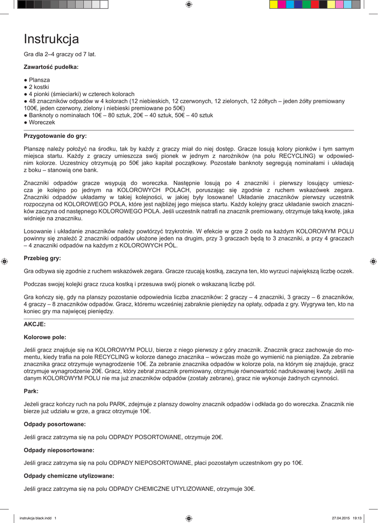 Instrukcja Gra dla 2–4 graczy od 7 lat. Zawartość pudełka: ● Plansza ● 2 kostki ● 4 pionki (śmieciarki) w czterech kolorach ● 48 znaczników odpadów w 4 kolorach (12 niebieskich, 12 czerwonych, 12 zielonych, 12 żółtych – jeden żółty premiowany 100€, jeden czerwony, zielony i niebieski premiowane po 50€) ● Banknoty o nominałach 10€ – 80 sztuk, 20€ – 40 sztuk, 50€ – 40 sztuk ● Woreczek Przygotowanie do gry: Planszę należy położyć na środku, tak by każdy z graczy miał do niej dostęp. Gracze losują kolory pionków i tym samym miejsca startu. Każdy z graczy umieszcza swój pionek w jednym z narożników (na polu RECYCLING) w odpowiednim kolorze. Uczestnicy otrzymują po 50€ jako kapitał początkowy. Pozostałe banknoty segregują nominałami i układają z boku – stanowią one bank. Znaczniki odpadów gracze wsypują do woreczka. Następnie losują po 4 znaczniki i pierwszy losujący umieszcza je kolejno po jednym na KOLOROWYCH POLACH, poruszając się zgodnie z ruchem wskazówek zegara. Znaczniki odpadów układamy w takiej kolejności, w jakiej były losowane! Układanie znaczników pierwszy uczestnik rozpoczyna od kolorowego pola, które jest najbliżej jego miejsca startu. Każdy kolejny gracz układanie swoich znaczników zaczyna od następnego kolorowego pola. Jeśli uczestnik natrafi na znacznik premiowany, otrzymuje taką kwotę, jaka widnieje na znaczniku. Losowanie i układanie znaczników należy powtórzyć trzykrotnie. W efekcie w grze 2 osób na każdym kolorowym polu powinny się znaleźć 2 znaczniki odpadów ułożone jeden na drugim, przy 3 graczach będą to 3 znaczniki, a przy 4 graczach – 4 znaczniki odpadów na każdym z kolorowych pól. Przebieg gry: Gra odbywa się zgodnie z ruchem wskazówek zegara. Gracze rzucają kostką, zaczyna ten, kto wyrzuci największą liczbę oczek. Podczas swojej kolejki gracz rzuca kostką i przesuwa swój pionek o wskazaną liczbę pól. Gra kończy się, gdy na planszy pozostanie odpowiednia liczba znaczników: 2 graczy – 4 znaczniki, 3 graczy – 6 znaczników, 4 graczy – 8 znaczników odpadów. Gracz, któremu wcześniej zabraknie pieniędzy na opłaty, odpada z gry. Wygrywa ten, kto na koniec gry ma najwięcej pieniędzy. Akcje: Kolorowe pole: Jeśli gracz znajduje się na kolorowym polu, bierze z niego pierwszy z góry znacznik. Znacznik gracz zachowuje do momentu, kiedy trafia na pole RECYCLING w kolorze danego znacznika – wówczas może go wymienić na pieniądze. Za zebranie znacznika gracz otrzymuje wynagrodzenie 10€. Za zebranie znacznika odpadów w kolorze pola, na którym się znajduje, gracz otrzymuje wynagrodzenie 20€. Gracz, który zebrał znacznik premiowany, otrzymuje równowartość nadrukowanej kwoty. Jeśli na danym kolorowym polu nie ma już znaczników odpadów (zostały zebrane), gracz nie wykonuje żadnych czynności. Park: Jeżeli gracz kończy ruch na polu park, zdejmuje z planszy dowolny znacznik odpadów i odkłada go do woreczka. Znacznik nie bierze już udziału w grze, a gracz otrzymuje 10€. Odpady posortowane: Jeśli gracz zatrzyma się na polu odpady posortowane, otrzymuje 20€. Odpady nieposortowane: Jeśli gracz zatrzyma się na polu odpady nieposortowane, płaci pozostałym uczestnikom gry po 10€. Odpady chemiczne utylizowane: Jeśli gracz zatrzyma się na polu odpady CHEMICZNE utylizowane, otrzymuje 30€. instrukcja black.indd 1 27.04.2015 19:13 Odpady chemiczne nieutylizowane: Jeśli gracz zatrzyma się na polu odpady CHEMICZNE nieutylizowane, płaci pozostałym uczestnikom gry po 20€. Recycling: Jeżeli gracz zatrzyma się na polu recycling, ma prawo do wymiany znaczników w kolorze tego pola na pieniądze. Otrzymuje za to: za 1 znacznik – 10€, za 2 znaczniki – 2 razy po 20€, itd. Znaczniki odpadów należy odłożyć do woreczka, nie biorą już udziału w grze. Znaczniki premiowane są oddawane do recyclingu na takich samych zasadach jak pozostałe. Znaczniki, które nie zostały oddane do recyclingu, nie mają wpływu na wynik gry. Czas wolny: Święto Ziemi. Jeśli gracz zatrzyma się na polu CZAS WOLNY, to w razie niekorzystnego losowania w następnej kolejce może zostać na tym samym polu. Pytajnik: Jeżeli gracz zatrzyma się na polu z pytajnikiem, rzuca dwiema kostkami, sumuje wynik, odczytuje z tabeli wydarzeń, co się stało, i stosuje się do instrukcji. TABELA WYDARZEŃ: 2 – awaria śmieciarki, tracisz kolejkę. 3 – awaria śmieciarki, odrzucasz jeden ze swoich znaczników (jeśli już jakieś zebrałeś). 4 – awaria śmieciarki, w następnej kolejce przesuwasz się tylko o jedno pole. 5 – remont w budynkach przemysłowych, w następnej kolejce nie wolno ci się zatrzymać na polu czerwonym. Jeśli to zrobisz, tracisz 10€. 6 – remont biurowców, w następnej kolejce nie wolno ci się zatrzymać na polu zielonym. Jeśli to zrobisz, cofasz się o trzy pola. 7 – Dzień Morza, każdy z graczy odrzuca z planszy dowolny znacznik odpadów, a ty otrzymujesz 20€. 8 – wypadek na drodze, w następnej kolejce nie wolno ci się zatrzymać na żółtym polu. Jeśli zatrzymasz się na zakazanym polu, tracisz 10€. 9 – oszczędzaj wodę, w następnej rundzie nie wolno ci się zatrzymać na polu niebieskim. Jeśli to zrobisz, tracisz 10€ i nie możesz wziąć znacznika. 10 – przesuwasz swój pionek do dowolnej przetwórni (pole recycling) i oddajesz swoje odpady, otrzymujesz wynagrodzenie. Zapłata: 1 znacznik – 10€, 2 znaczniki – 2 razy po 20€, itd. Znaczniki należy odłożyć do woreczka, nie biorą już udziału w grze. 11 – roboty drogowe, tracisz kolejkę. 12 – masz szczęście, trafiłeś na zielone światło, zyskujesz dodatkową kolejkę. AKTYWNOŚCI: Myjnia – potrzebujesz umyć auto, tracisz jedną kolejkę. Wyboje na drodze – rozsypałeś swoje śmieci, żeby je posprzątać, cofasz się o tyle pól, ile oczek wyrzucisz na kostce (wykonujesz dodatkowy rzut). Super 