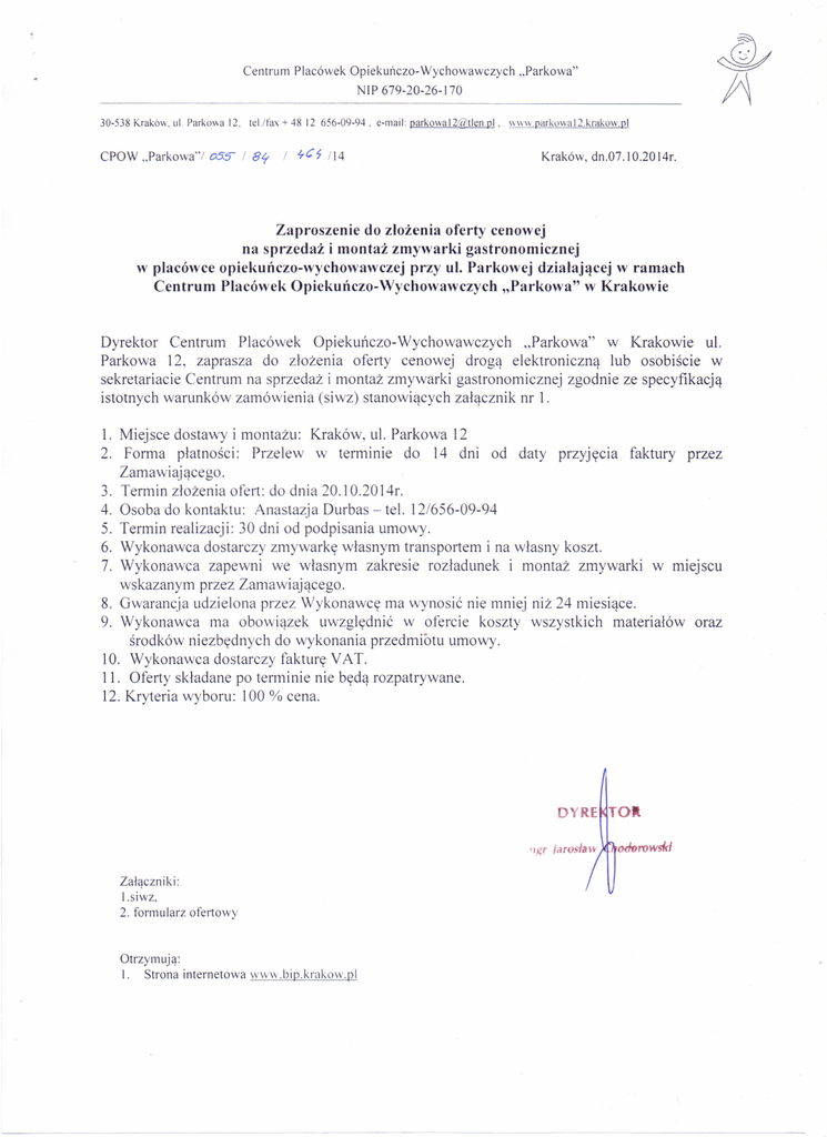 Centrum Placówek Opiekuńczo- Wychowawczych "Parkowa" NIP 679-20-26-170 30-538 Kraków. ul. Parkowa 12. tel.ztax + 48 12 656-09-94. CPOW .Parkowa'? oss: / 8f / 're~ 114 e-mail: parkowa I 20lllen.ol . \\ \\1\. parkowa l2.krakow.pl Kraków, dn.07.10.2014r. Zaproszenie do złożenia oferty cenowej na sprzedaż i montaż zmywarki gastronomicznej w płacówce opiekuńczo-wychowawczej przy ul. Parkowej działającej w ramach Centrum Placówek Opiekuńczo-Wychowawczych "Parkowa" w Krakowie Dyrektor Centrum Placówek Opiekuńczo-Wychowawczych "Parkowa" w Krakowie ul. Parkowa 12, zaprasza do złożenia oferty cenowej drogą elektroniczną lub osobiście w sekretariacie Centrum na sprzedaż i montaż zmywarki gastronomicznej zgodnie ze specyfikacją istotnych warunków zamówienia (siwz) stanowiących załącznik nr l. L Miejsce dostawy i montażu: Kraków, ul. Parkowa 12 2. Forma płatności: Przelew w terminie do 14 dni od daty przyjęcia faktury przez Zamawiającego. 3. Termin złożenia ofert: do dnia 20.10.20 l4r. 4. Osoba do kontaktu: Anastazja Durbas - tel. 12/656-09-94 5. Termin realizacji: 30 dni od podpisania umowy. 6. Wykonawca dostarczy zmywarkę własnym transportem i na własny koszt 7. Wykonawca zapewni we własnym zakresie rozładunek i montaż zmywarki w miejscu wskazanym przez Zamawiającego. 8. Gwarancja udzielona przez Wykonawcę ma wynosić nie mniej niż 24 miesiące. 9. Wykonawca ma obowiązek uwzględnić w ofercie koszty wszystkich materiałów oraz środków niezbędnych do wykonania przedmiotu umowy. 10. Wykonawca dostarczy fakturę V A T. 11. Oferty składane po terminie nie będą rozpatrywane. 12. Kryteria wyboru: 100 % cena. RE TO 'IKr ierosłsw Załączniki: l.siwz, 2. formularz ofertowy Otrzymują: I. Strona internetowa w\vw.bip.krakow.pl odtJrows*1