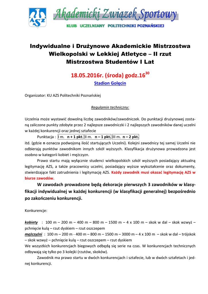 Indywidualne i Drużynowe Akademickie Mistrzostwa Wielkopolski w Lekkiej Atletyce – II rzut Mistrzostwa Studentów I Lat 18.05.2016r. (środa) godz.1630 Stadion Golęcin Organizator: KU AZS Politechniki Poznaoskiej Regulamin techniczny: Uczelnia może wystawid dowolną liczbę zawodników/zawodniczek. Do punktacji drużynowej zostaną zaliczone punkty zdobyte przez 2 najlepsze zawodniczki i 2 najlepszych zawodników danej uczelni w każdej konkurencji oraz jednej sztafecie Punktacja : I m. n + 1 pkt. II m. n – 1 pkt. III m. n – 2 pkt. itd. (gdzie n oznacza podwojoną ilośd startujących Uczelni). Kolejni zawodnicy tej samej Uczelni nie odbierają punktów zawodnikom innych szkół wyższych. Klasyfikacja drużynowa prowadzona jest osobno w kategorii kobiet i mężczyzn. Prawo startu mają wyłącznie studenci wielkopolskich szkół wyższych posiadający aktualną legitymację AZS, a także pracownicy uczelni, posiadający wyższe wykształcenie oraz dokumenty, stwierdzające fakt zatrudnienia i legitymację AZS. Każdy zawodnik musi okazad legitymację AZS w biurze zawodów. W zawodach prowadzone będą dekoracje pierwszych 3 zawodników w klasyfikacji indywidualnej w każdej konkurencji (w klasyfikacji generalnej) bezpośrednio po zakooczeniu konkurencji. Konkurencje: kobiety : 100 m – 200 m – 400 m – 800 m – 1500 m – 4 x 100 m – skok w dal – skok wzwyż – pchnięcie kulą – rzut dyskiem – rzut oszczepem mężczyźni : 100 m – 200 m - 400 m – 800 m – 1500 m – 3000 m – 4 x 100 m – skok w dal – trójskok – skok wzwyż – pchnięcie kulą – rzut oszczepem – rzut dyskiem We wszystkich konkurencjach biegowych odbędą się serie na czas. W konkurencjach technicznych odbywają się tylko po 3 kolejki (rzutów, skoków). Zawodnik ma prawo startu w dwóch konkurencjach i sztafecie, lub w dwóch sztafetach i jednej konkurencji. Zgłoszenia: w dniu zawodów do konkurencji biegowych na kartkach startowych (WYPEŁNIONE CZYTELNYM PISMEM DRUKWANYM, ZAZNACZAJĄC STUDENTÓW I LAT oraz wpisując numer legitymacji AZS i rok urodzenia) max do 15 min. przed startem do konkurencji technicznych u sędziego w miejscu startu, podając numer legitymacji AZS, nazwę uczelni oraz rok studiów. Program zawodów : 16.20 otwarcie Mistrzostw 1630 100m K w dal M wzwyż K kula K oszczep M w dal K wzwyż M kula M oszczep K 100m M 400m K 400m M 800m K 800m M 200m K 200m M trójskok M dysk K i M 3000m M 1500m K 1500m M 4x100m K 4x100m M Uwaga: Konkurencje rozpoczynają się bezpośrednio po zakooczeniu poprzedzającej. Zawodnicy startujący w konkurencjach biegowych powinni zgłosid się w miejscu startu u pomocnika startera w chwili rozpoczęcia biegu poprzedzającego ich bieg. Każda uczelnia biorąca udział w zawodach (z wyjątkiem uczelni zamiejscowych) ma obowiązek zapewnid 5 osób do pomocy przy obsłudze zawodów. Osoby te zgłaszają się do stanowiska spikera na pół godziny przed rozpoczęciem zawodów (16.00)