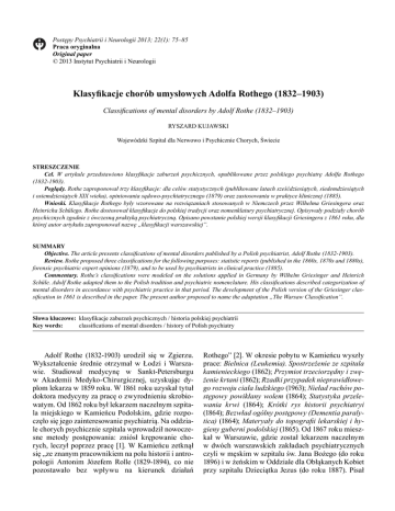 Postępy Psychiatrii i Neurologii 2013; 22(1): 75–85 Praca oryginalna Original paper © 2013 Instytut Psychiatrii i Neurologii Klasyfikacje chorób umysłowych Adolfa Rothego (1832–1903) Classifications of mental disorders by Adolf Rothe (1832–1903) RYSZARD KUJAWSKI Wojewódzki Szpital dla Nerwowo i Psychicznie Chorych, Świecie STRESZCZENIE Cel. W artykule przedstawiono klasyfikacje zaburzeń psychicznych, opublikowane przez polskiego psychiatrę Adolfa Rothego (1832-1903). Poglądy. Rothe zaproponował trzy klasyfikacje: dla celów statystycznych (publikowane latach sześćdziesiątych, siedemdziesiątych i osiemdziesiątych XIX wieku), opiniowania sądowo-psychiatrycznego (1879) oraz zastosowania w praktyce klinicznej (1885). Wnioski. Klasyfikacje Rothego były wzorowane na rozwiązaniach stosowanych w Niemczech przez Wilhelma Griesingera oraz Heinricha Schülego. Rothe dostosował klasyfikacje do polskiej tradycji oraz nomenklatury psychiatrycznej. Opisywały podziały chorób psychicznych zgodnie z ówczesną praktyką psychiatryczną. Opisano powstanie polskiej wersji klasyfikacji Griesingera z 1861 roku, dla której autor artykułu zaproponował nazwę „klasyfikacji warszawskiej”. SUMMARY Objective. The article presents classifications of mental disorders published by a Polish psychiatrist, Adolf Rothe (1832-1903). Review. Rothe proposed three classifications for the following purposes: statistic reports (published in the 1860s, 1870s and 1880s), forensic psychiatric expert opinions (1879), and to be used by psychiatrists in clinical practice (1885). Commentary. Rothe’s classifications were modeled on the solutions applied in Germany by Wilhelm Griesinger and Heinrich Schüle. Adolf Rothe adapted them to the Polish tradition and psychiatric nomenclature. His classifications described categorization of mental disorders in accordance with psychiatric practice in that period. The development of the Polish version of the Griesinger classification in 1861 is described in the paper. The present author proposed to name the adaptation „The Warsaw Classification”. Słowa kluczowe: klasyfikacje zaburzeń psychicznych / historia polskiej psychiatrii Key words: classifications of mental disorders / history of Polish psychiatry Adolf Rothe (1832-1903) urodził się w Zgierzu. Wykształcenie średnie otrzymał w Łodzi i Warszawie. Studiował medycynę w Sankt-Petersburgu w Akademii Medyko-Chirurgicznej, uzyskując dyplom lekarza w 1859 roku. W 1861 roku uzyskał tytuł doktora medycyny za pracę o zwyrodnieniu skrobiowatym. Od 1862 roku był lekarzem naczelnym szpitala miejskiego w Kamieńcu Podolskim, gdzie rozpoczęło się jego zainteresowanie psychiatrią. Na oddziale chorych psychicznie szpitala wprowadził nowoczesne metody postępowania: zniósł krępowanie chorych, leczył poprzez pracę [1]. W Kamieńcu zetknął się „ze znanym pracownikiem na polu historii i antropologii Antonim Józefem Rolle (1829-1894), co nie pozostawało bez wpływu na kierunek działań Rothego” [2]. W okresie pobytu w Kamieńcu wyszły prace: Bielnica (Leukemia). Spostrzeżenie ze szpitala kamienieckiego (1862); Przymiot trzeciorzędny i zwężenie krtani (1862); Rzadki przypadek nieprawidłowego rozwoju ciała ludzkiego (1963); Nieład ruchów postępowy powikłany wolem (1864); Statystyka przelewania krwi (1864); Krótki rys historii psychiatryi (1864); Bezwład ogólny postępowy (Dementia paralytica) (1864); Materyały do topografii lekarskiej i hygieny guberni podolskiej (1865). Od 1867 roku mieszkał w Warszawie, gdzie został lekarzem naczelnym w dwóch warszawskich zakładach psychiatrycznych czyli w męskim w szpitalu św. Jana Bożego (do roku 1896) i w żeńskim w Oddziale dla Obłąkanych Kobiet przy szpitalu Dzieciątka Jezus (do roku 1887). Pisał 76 Rothe: „Dziś zmieniły się pod względem zwierzchnictwa stosunki obu tych szpitali i ogólny zarząd lekarski pozostaje pod jedną władzą a to wskutek wydanego… rozporządzenia Komitetu Urządzającego z dnia 30 maja (11 czerwca) 1867 roku Nr 3738, abym po śmierci ś.p. Dra Frydrych objął z prawami naczelnego lekarza zarząd nad oddziałem dla obłąkanych i epileptycznych kobiet przy szpitalu Dzieciątka Jezus” [3, s.7]. Julian Bartoszewicz wspominał (1870), że „druga reforma lekarska, która spotkała szpital była skutkiem śmierci Dra Frydrycha, która nastąpiła w roku 1867 … Kommissya … rozporządziła, żeby naczelny lekarz u Śgo Jana Bożego, kierujący oddziałem obłąkanym mężczyzn objął także z kolei i dozór nad szpitalem obłąkanych kobiet u Dzieciątka Jezus... Lekarzem głównym u Śgo Jana Bożego był Dr Adolf Rothe, który umyślnie był sprowadzony z Podola na tę posadę naczelnego lekarza po Ildefonsie Krosińskim … Że zaś Rothe byłby rozerwany między dwa szpitale, dodano mu jako pomocnika assystenta w oddziale kobiet obłąkanych lekarza Żłobikowskiego” [4]. Rothe brał później udział w organizowaniu szpitala w Tworkach (Zmiany zaszłe w pierwotnym planie centralnego zakładu dla obłąkanych pod Warszawą, 1869). W jego dorobku znajdują się prace na temat psychiatrii klinicznej: O leczeniu i pielęgnowaniu obłąkanych w czasach dawniejszych i teraźniejszych (1871); Obłąkanie padaczkowe (1877); Paraldehyd, nowy środek nasenny i kojący (1884) oraz psychiatrii społecznej: O pielęgnowaniu obłąkanych i o urządzaniu dla nich zakładów (1869); Gheel (1869); O wpływie wypadków 1870-71 roku na stan umysłowy mieszkańców Paryża (1878); Znaczenie statystyki zakładowej. Cele i dążności psychijatryi praktycznej (1882). Jako pierwszy opublikował dane statystyczne na temat spożycia alkoholu na ziemiach polskich (Alkoholizm, czyli otrucie wyskokowe jego wpływ na rozwój i pomnożenie się chorób umysłowych w kraju i zagranicą, 1882). Wydał dwa podręczniki psychiatrii. „Szczególnie cenny jest jego podręcznik psychiatrii sądowej z r. 1879 pt. Psy