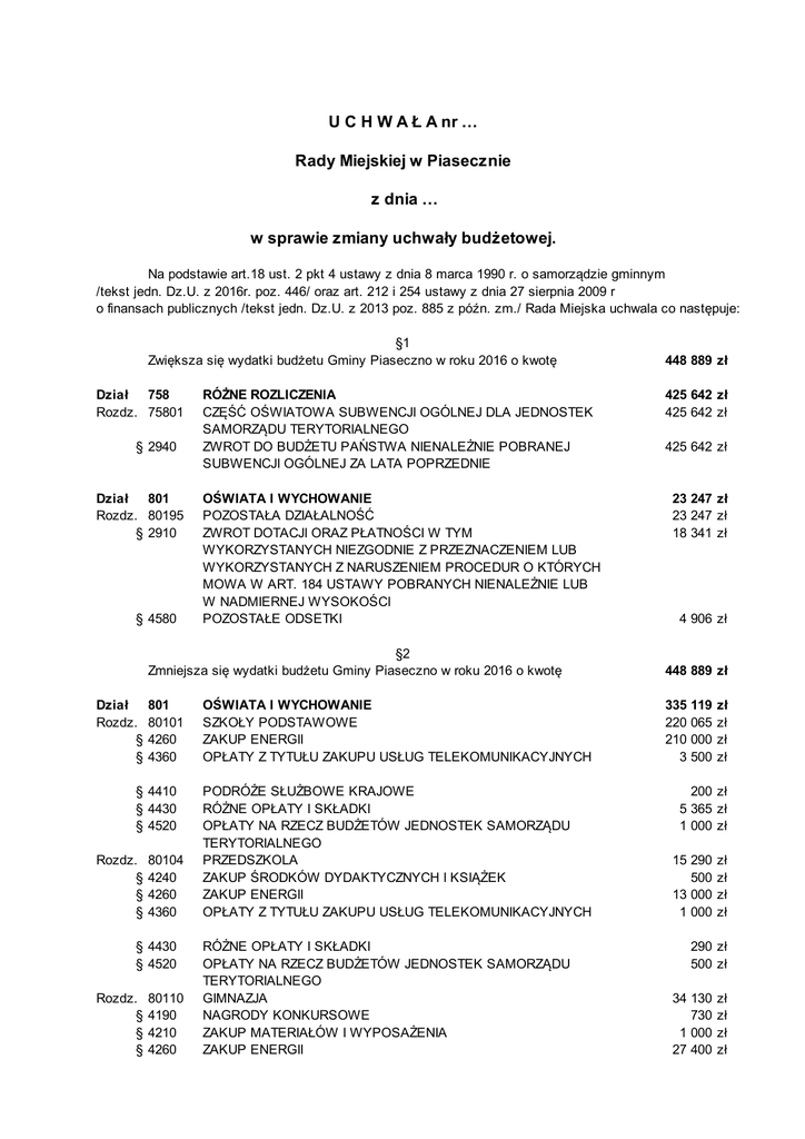 U C H W A Ł A nr … Rady Miejskiej w Piasecznie z dnia … w sprawie zmiany uchwały budżetowej. Na podstawie art.18 ust. 2 pkt 4 ustawy z dnia 8 marca 1990 r. o samorządzie gminnym /tekst jedn. Dz.U. z 2016r. poz. 446/ oraz art. 212 i 254 ustawy z dnia 27 sierpnia 2009 r o finansach publicznych /tekst jedn. Dz.U. z 2013 poz. 885 z późn. zm./ Rada Miejska uchwala co następuje: §1 Zwiększa się wydatki budżetu Gminy Piaseczno w roku 2016 o kwotę Dział 758 Rozdz. 75801 § 2940 Dział 801 Rozdz. 80195 § 2910 § 4580 Dział Rozdz. § § 425 642 zł 23 247 zł 23 247 zł 18 341 zł 4 906 zł 448 889 zł 801 80101 4260 4360 335 119 220 065 210 000 3 500 80104 4240 4260 4360 § 4430 § 4520 Rozdz. § § § OŚWIATA I WYCHOWANIE POZOSTAŁA DZIAŁALNOŚĆ ZWROT DOTACJI ORAZ PŁATNOŚCI W TYM WYKORZYSTANYCH NIEZGODNIE Z PRZEZNACZENIEM LUB WYKORZYSTANYCH Z NARUSZENIEM PROCEDUR O KTÓRYCH MOWA W ART. 184 USTAWY POBRANYCH NIENALEŻNIE LUB W NADMIERNEJ WYSOKOŚCI POZOSTAŁE ODSETKI 425 642 zł 425 642 zł §2 Zmniejsza się wydatki budżetu Gminy Piaseczno w roku 2016 o kwotę § 4410 § 4430 § 4520 Rozdz. § § § RÓŻNE ROZLICZENIA CZĘŚĆ OŚWIATOWA SUBWENCJI OGÓLNEJ DLA JEDNOSTEK SAMORZĄDU TERYTORIALNEGO ZWROT DO BUDŻETU PAŃSTWA NIENALEŻNIE POBRANEJ SUBWENCJI OGÓLNEJ ZA LATA POPRZEDNIE 448 889 zł 80110 4190 4210 4260 OŚWIATA I WYCHOWANIE SZKOŁY PODSTAWOWE ZAKUP ENERGII OPŁATY Z TYTUŁU ZAKUPU USŁUG TELEKOMUNIKACYJNYCH PODRÓŻE SŁUŻBOWE KRAJOWE RÓŻNE OPŁATY I SKŁADKI OPŁATY NA RZECZ BUDŻETÓW JEDNOSTEK SAMORZĄDU TERYTORIALNEGO PRZEDSZKOLA ZAKUP ŚRODKÓW DYDAKTYCZNYCH I KSIĄŻEK ZAKUP ENERGII OPŁATY Z TYTUŁU ZAKUPU USŁUG TELEKOMUNIKACYJNYCH RÓŻNE OPŁATY I SKŁADKI OPŁATY NA RZECZ BUDŻETÓW JEDNOSTEK SAMORZĄDU TERYTORIALNEGO GIMNAZJA NAGRODY KONKURSOWE ZAKUP MATERIAŁÓW I WYPOSAŻENIA ZAKUP ENERGII zł zł zł zł 200 zł 5 365 zł 1 000 zł 15 290 500 13 000 1 000 zł zł zł zł 290 zł 500 zł 34 130 730 1 000 27 400 zł zł zł zł § 4300 § 4360 ZAKUP USŁUG POZOSTAŁYCH OPŁATY Z TYTUŁU ZAKUPU USŁUG TELEKOMUNIKACYJNYCH 1 000 zł 1 000 zł § 4700 SZKOLENIA PRACOWNIKÓW NIEBĘDĄCYCH CZŁONKAMI KORPUSU SŁUŻBY CYWILNEJ DOWOŻENIE UCZNIÓW DO SZKÓŁ ZAKUP USŁUG POZOSTAŁYCH ZESPOŁY OBSŁUGI EKONOMICZNO-ADMINISTRACYJNEJ SZKÓŁ WYNAGRODZENIA OSOBOWE PRACOWNIKÓW SKŁADKI NA UBEZPIECZENIA SPOŁECZNE SKŁADKI NA FUNDUSZ PRACY NAGRODY KONKURSOWE ZAKUP MATERIAŁÓW I WYPOSAŻENIA ZAKUP USŁUG REMONTOWYCH ZAKUP USŁUG POZOSTAŁYCH OPŁATY Z TYTUŁU ZAKUPU USŁUG TELEKOMUNIKACYJNYCH 3 000 zł Rozdz. 80113 § 4300 Rozdz. 80114 § § § § § § § § 4010 4110 4120 4190 4210 4270 4300 4360 § 4410 § 4700 11 000 zł 11 000 zł 54 134 zł 12 005 708 172 30 504 5 495 1 833 664 1 205 zł zł zł zł zł zł zł zł Rozdz. 80148 § 4280 PODRÓŻE SŁUŻBOWE KRAJOWE SZKOLENIA PRACOWNIKÓW NIEBĘDĄCYCH CZŁONKAMI KORPUSU SŁUŻBY CYWILNEJ STOŁÓWKI SZKOLNE ZAKUP USŁUG ZDROWOTNYCH Dział 854 Rozdz. 85415 § 3240 EDUKACYJNA OPIEKA WYCHOWAWCZA POMOC MATERIALNA DLA UCZNIÓW STYPENDIA DLA UCZNIÓW 38 270 zł 38 270 zł 38 270 zł Dział 900 Rozdz. 90015 § 4270 GOSPODARKA KOMUNALNA I OCHRONA ŚRODOWISKA OŚWIETLENIE ULIC,PLACÓW I DRÓG ZAKUP USŁUG REMONTOWYCH 75 500 zł 75 500 zł 75 500 zł §3 Wykonanie uchwały powierza się Burmistrzowi Miasta i Gminy Piaseczno. §4 Uchwałę ogłasza się zgodnie z art. 61 ustawy z dnia 8 marca 1990 r. o samorządzie gminnym /tekst jedn. Dz.U. z 2016r. poz. 446/ przez ogłoszenie w Dzienniku Urzędowym Województwa Mazowieckiego i na stronie internetowej Urzędu Miasta i Gminy - www.piaseczno.eu oraz przez wywieszenie na tablicach urzędowych obwieszczeń w Urzędzie Miasta i Gminy. §5 Uchwała wchodzi w życie z dniem podjęcia i obowiązuje w roku budżetowym 2016. 376 zł 1 172 zł 500 zł 500 zł UZAS ADNI ENI E Burmistrz Miasta i Gminy Piaseczno przedkłada projekt uchwały w sprawie zmiany planu budżetu w 2016 roku. Na podstawie protokołu z czynności kontrolnych przeprowadzonych przez Urząd Kontroli Skarbowej w Warszawie w Gminie Piaseczno z dnia 16.03.2016 r. oraz pisma z Ministerstwa Finansów z dnia 29.08.2016 r. zwiększa się wydatki o kwotę 425 642 zł na zwrot subwencji ogólnej części oświatowej, jaką Gmina Piaseczno otrzymała na rok 2012. W dniach 28-29.05.2014 r. została przeprowadzona kontrola przez Mazowiecką Jednostkę Wdrażania Programów Unijnych a dotycząca dwóch postępowań przetargowych przeprowadzonych w 2013 roku w trybie przetargu nieograniczonego w związku z realizacją projektu "Indywidualizacja z Gminą Piaseczno". Postępowania dotyczyły: zakupu materiałów dydaktycznych, wyposażenia (sprzętu multimedialnego) i zakupu usług edukacyjnych. Wartość projektu to 593 987,10 zł. Zespół kontrolujący w roku 2014 nie stwierdził uchybień i nie wniósł uwag. Ponowna kontrola tej samej instytucji i tych samych postępowań przetargowych nastąpiła w dniach 7-8.07.2016 r. Kontrola stwierdziła naruszenie art. 7 ustawy Prawo zamówień publicznych, który stanowi, że Zamawiający przygotowuje i przeprowadza postępowanie o udzielenie zamówienia w sposób zapewniający zachowanie uczciwej konkurencji oraz równe traktowanie wykonawców. W uzasadnieniu wyjaśniono, "Do stwierdzenia, że doszło do naruszenia zasad określonych w art. 7 ustawy Prawo zamówień publicznych nie jest, bowiem konieczne, ani nawet potrzebne wykazanie, że do naruszenia konkurencyjności faktycznie doszło". W wyniku ponownej kontroli została nałożona korekta finansowa w kwocie 18 340,15 zł za dwa postępowania przetargowe. Od kwoty tej naliczono odsetki jak dla zaległości podatkowych od dnia przekazania transzy dofinansowania, z której poniesiono wydatki. Wydatki pokrywa się z zaoszczędzonych środków Centrum Usług Wspólnych - 373 389 zł oraz Referatu ds. Zarządzania Energią na konserwację i usuwanie awarii oświetlenia ulicznego i sygnalizacji świetlnej - 75 500 zł.